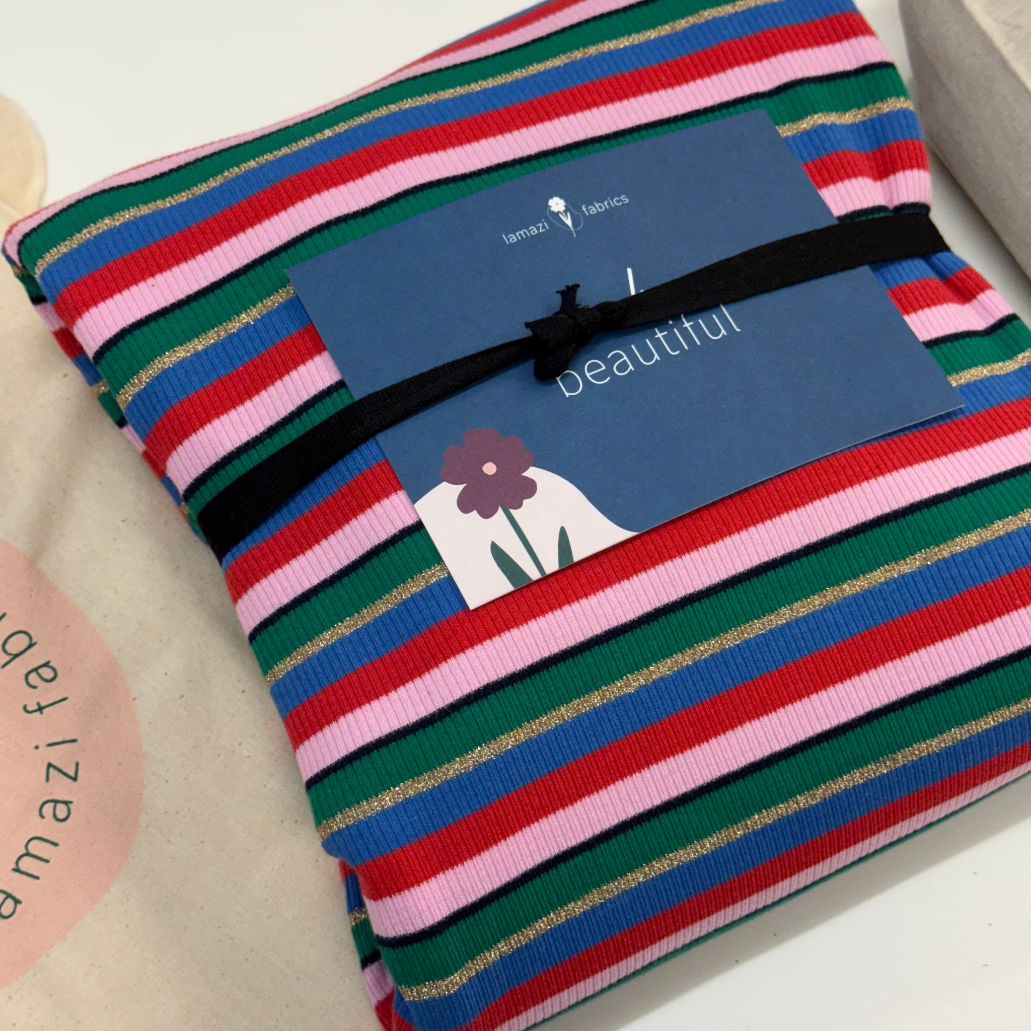 We are delighted to be stocking this new yarn dyed cotton Ribbed Jersey fabric with stripes running horizontally in vibrant and happy colours, and ribs running vertically. This latest addition to our high quality, wardrobe essential jerseys is soft, comfortable and kind to your skin for its natural qualities. It also features gold lurex stripes.