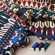 This joyous high quality viscose fabric features stunning geometric design in rich autumnal jewel tones. It has a little more weight than usual viscose fabric and a wonderful drape, it has the most pleasant sateen finish, with matte, peachy soft touch. It is perfect for making autumn / winter blouses and dresses.