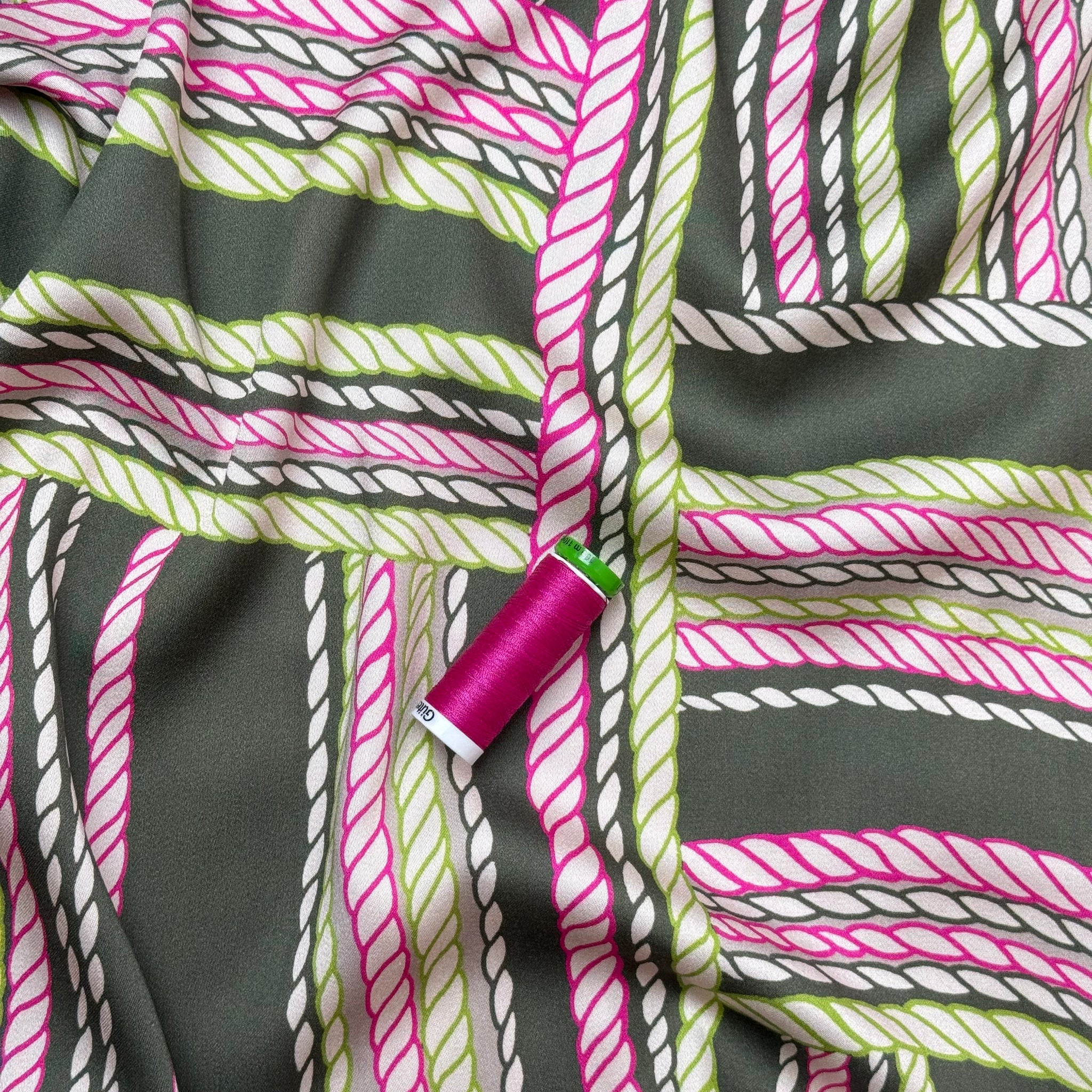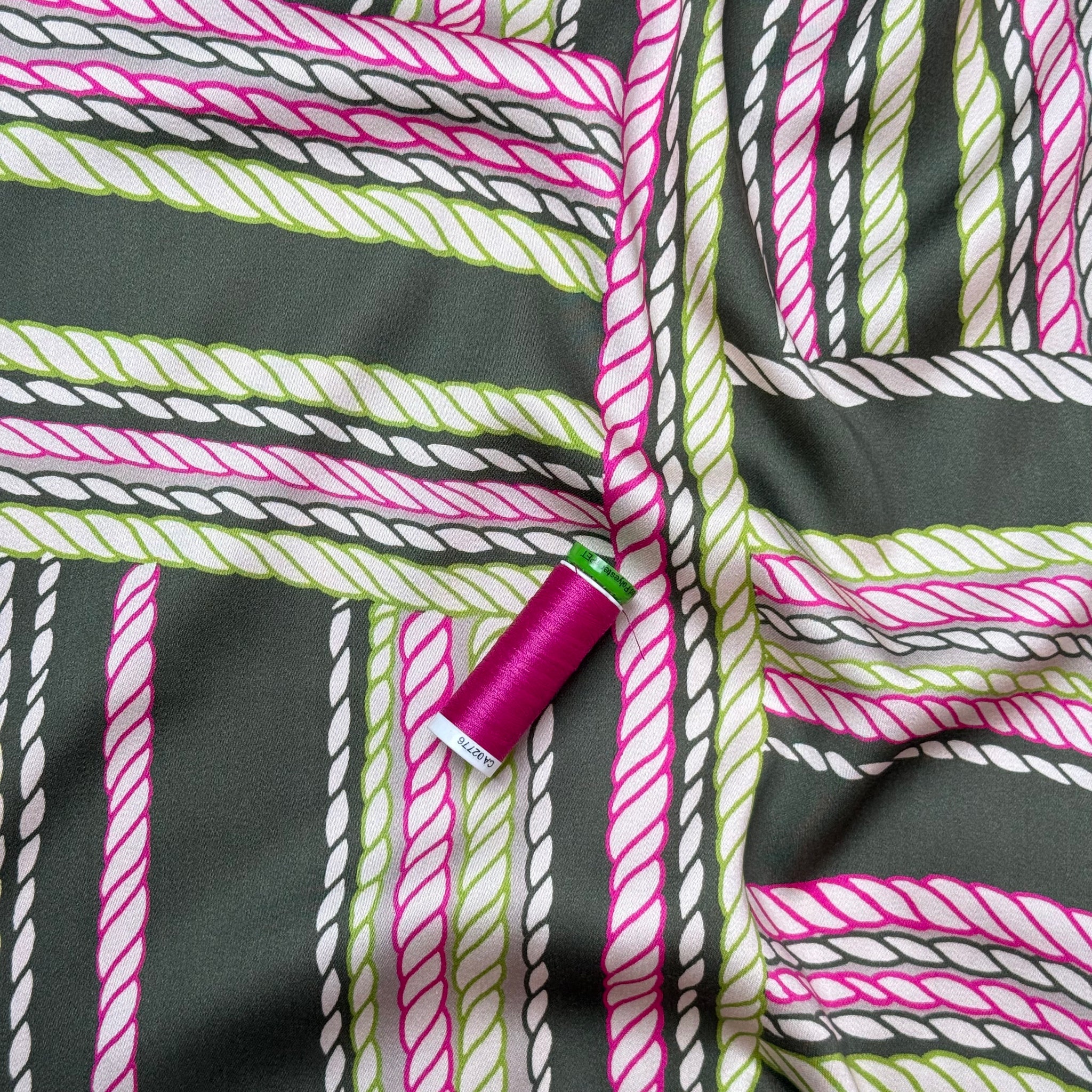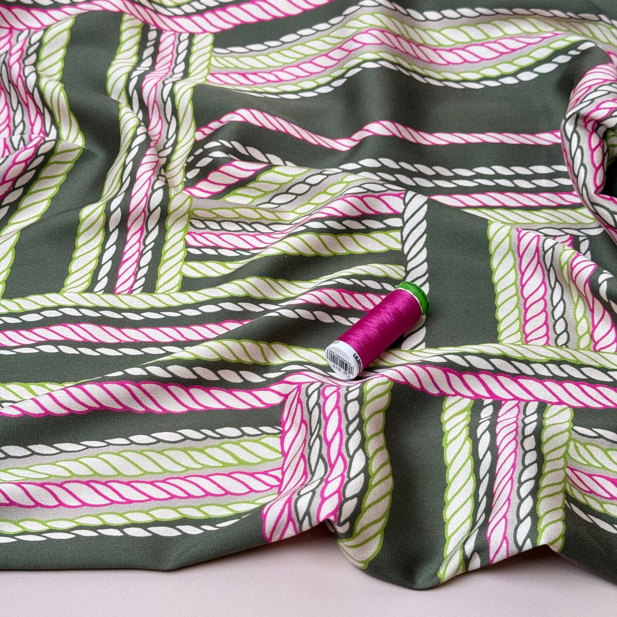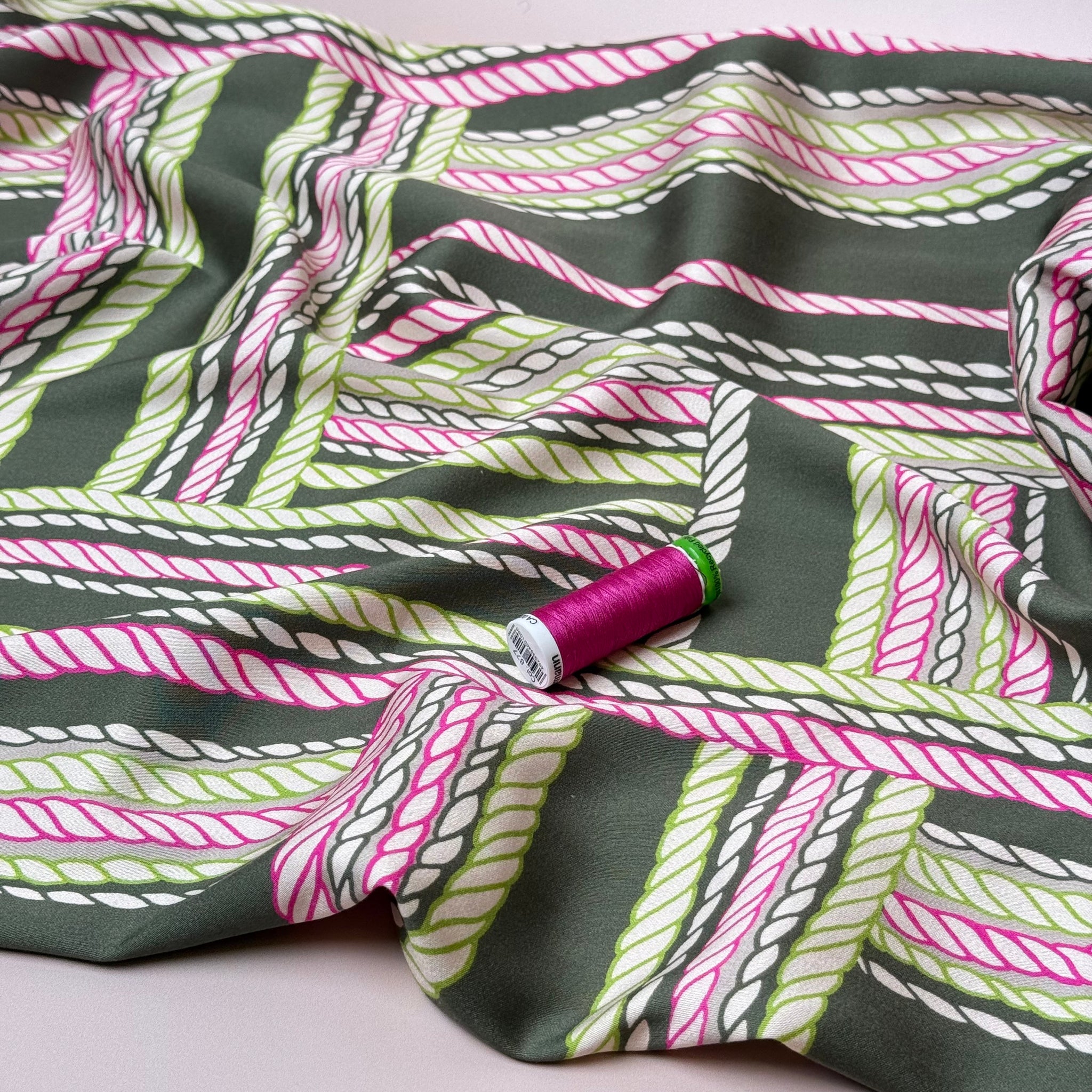 This stunning viscose sateen fabric features grid design of pink and green ropes on olive green background. It is lightweight and has the most pleasant handle, with smooth matte finish and beautiful drape. It also has a tiny amount of elastane for added comfort if you are making fitted garments.