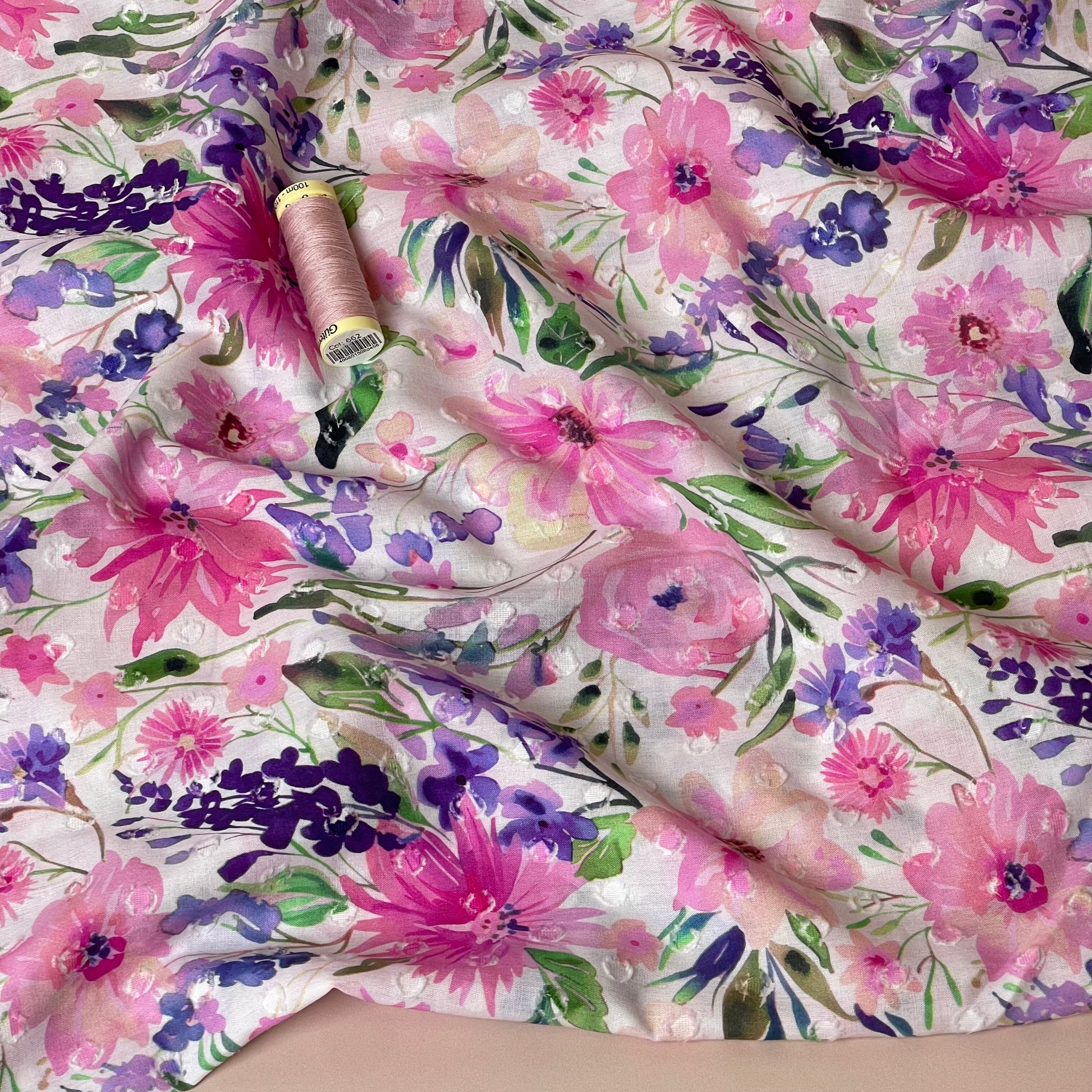 This lightweight cotton voile fabric has a dobby weave, with a stunning floral design in shades of pink and purple with green foliage on a white background.