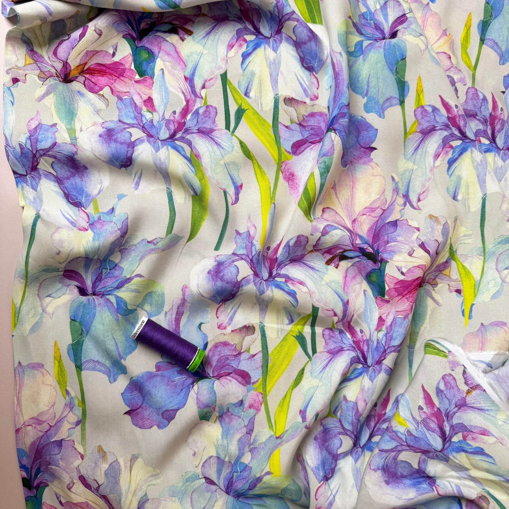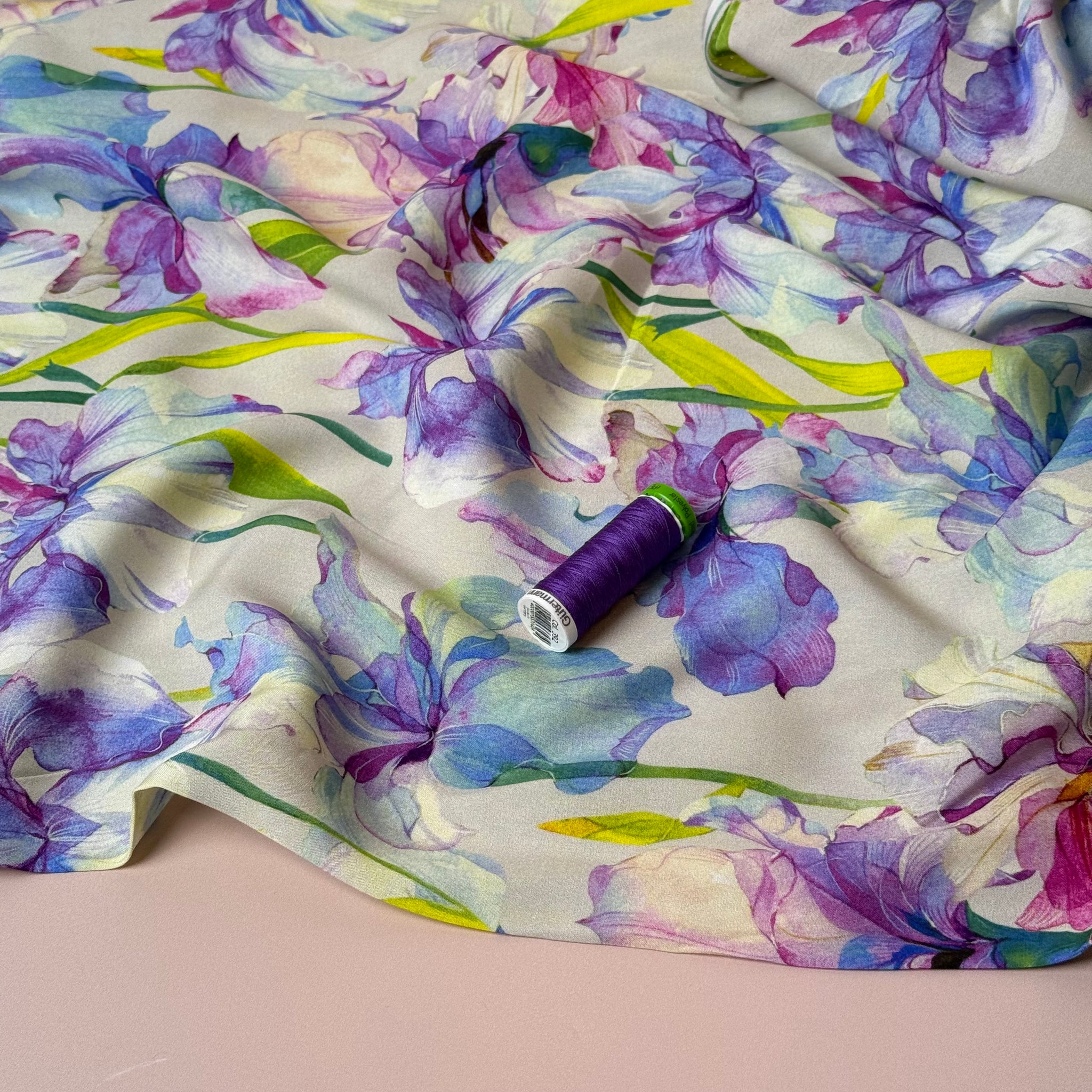 This joyous high quality viscose fabric features Iris flowers in shades of pink, purple, blue and neon green on a beige background. It is lightweight and has the most pleasant handle, with silky soft hand finish and beautiful drape.