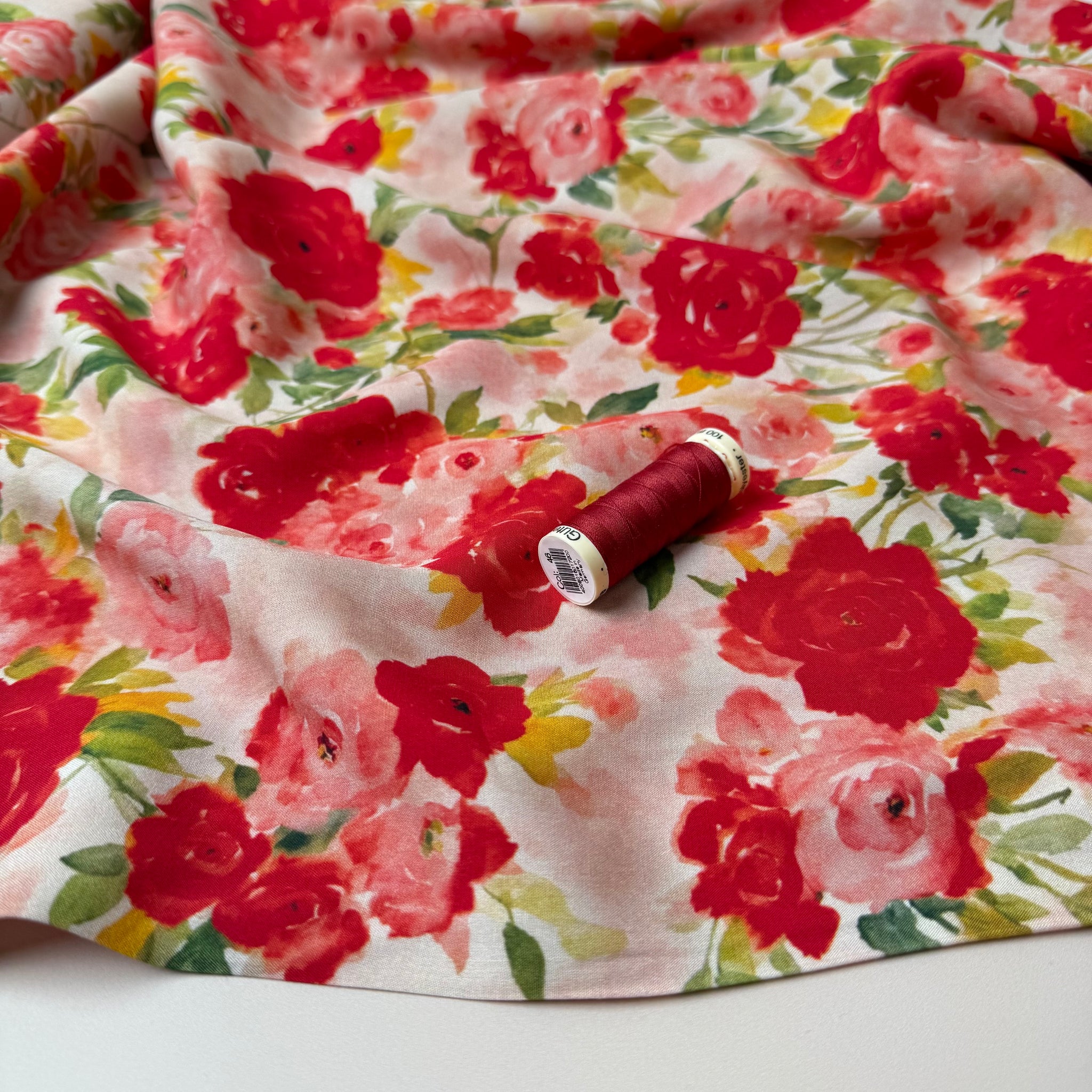 This elegant and beautiful, high quality viscose fabric features a dreamy red and pink floral rose pattern on a pale pink background, accented by foliage in shades of light green. It is lightweight and soft to touch with beautiful drape, perfect for summer dresses, blouses and skirts.