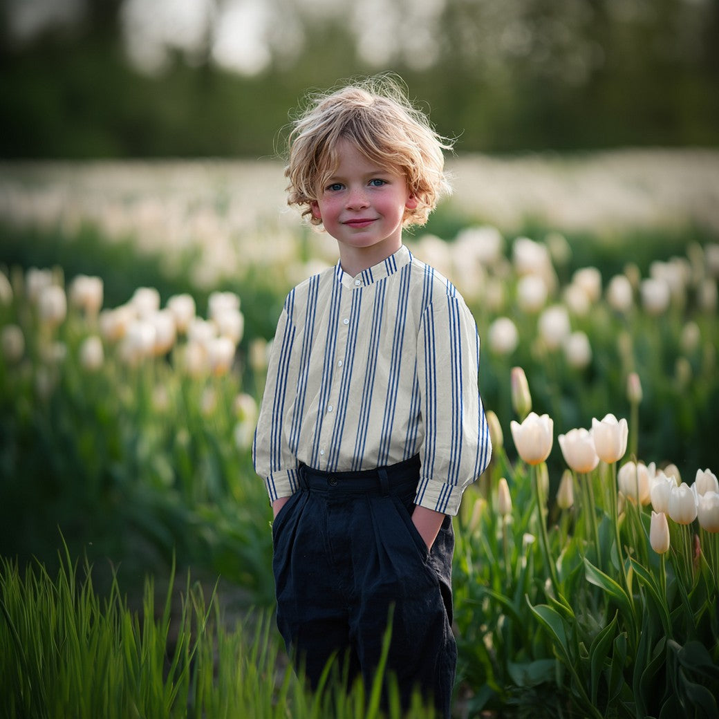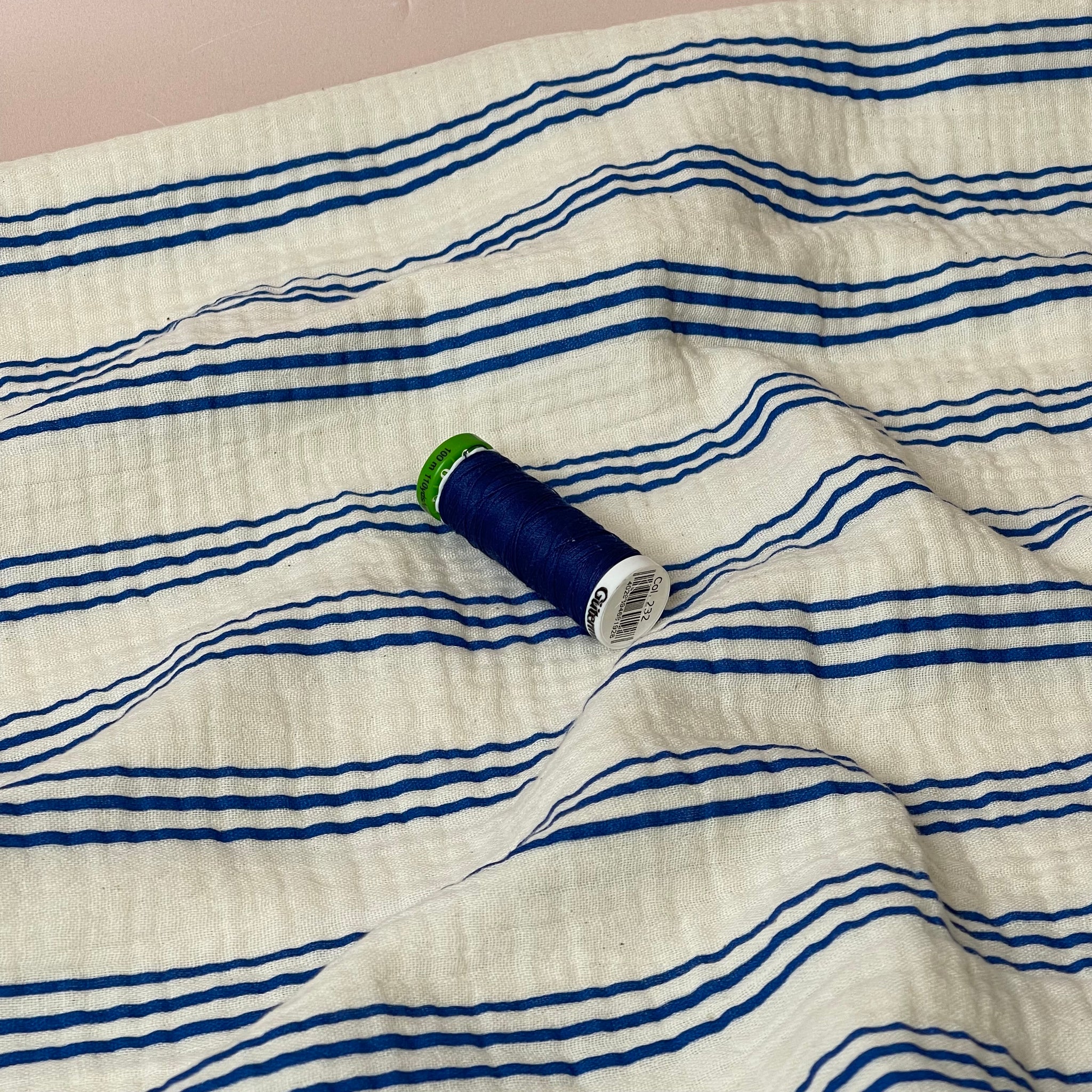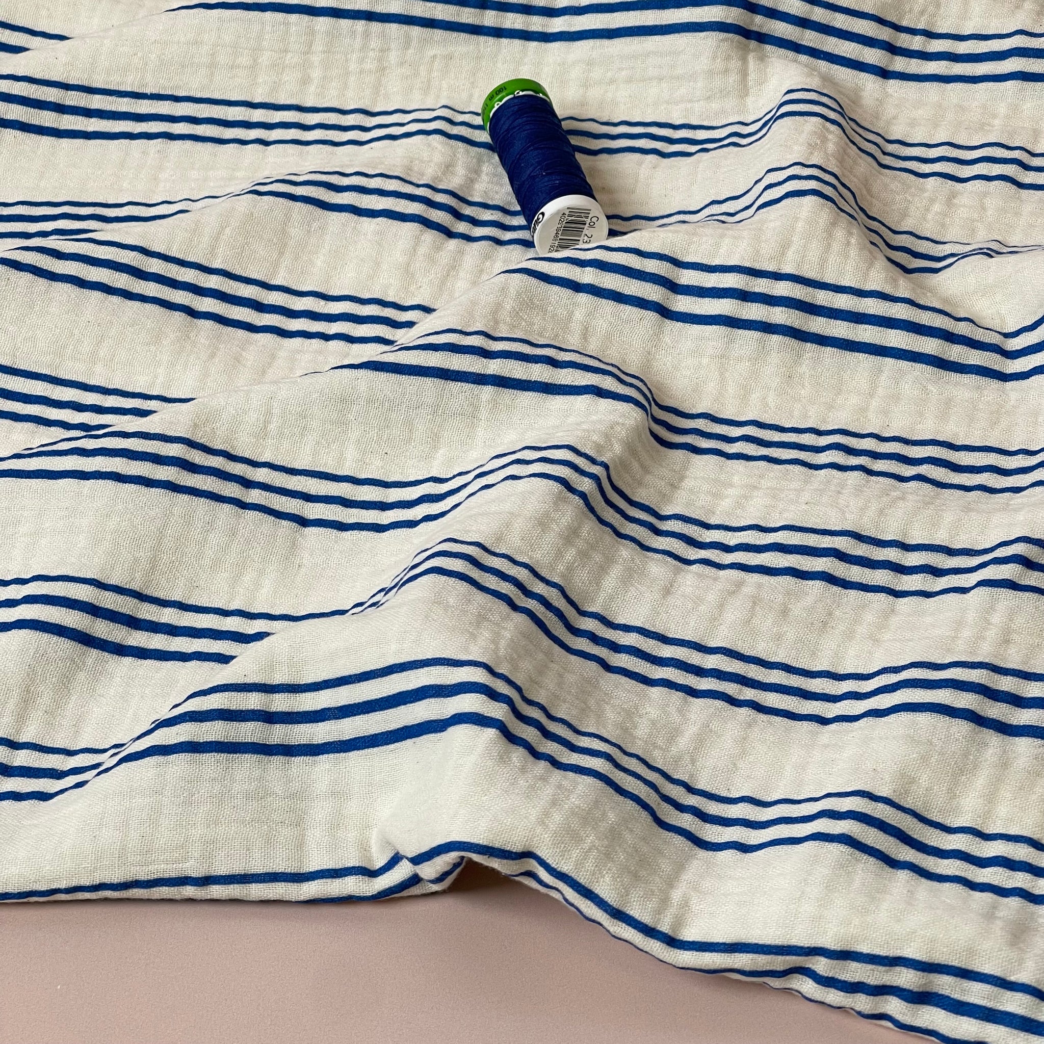 This beautiful natural organic cotton double gauze is very soft and features cobalt blue colour stripes on an undyed natural off-white background. This fabric is perfect for spring and summer sewing.