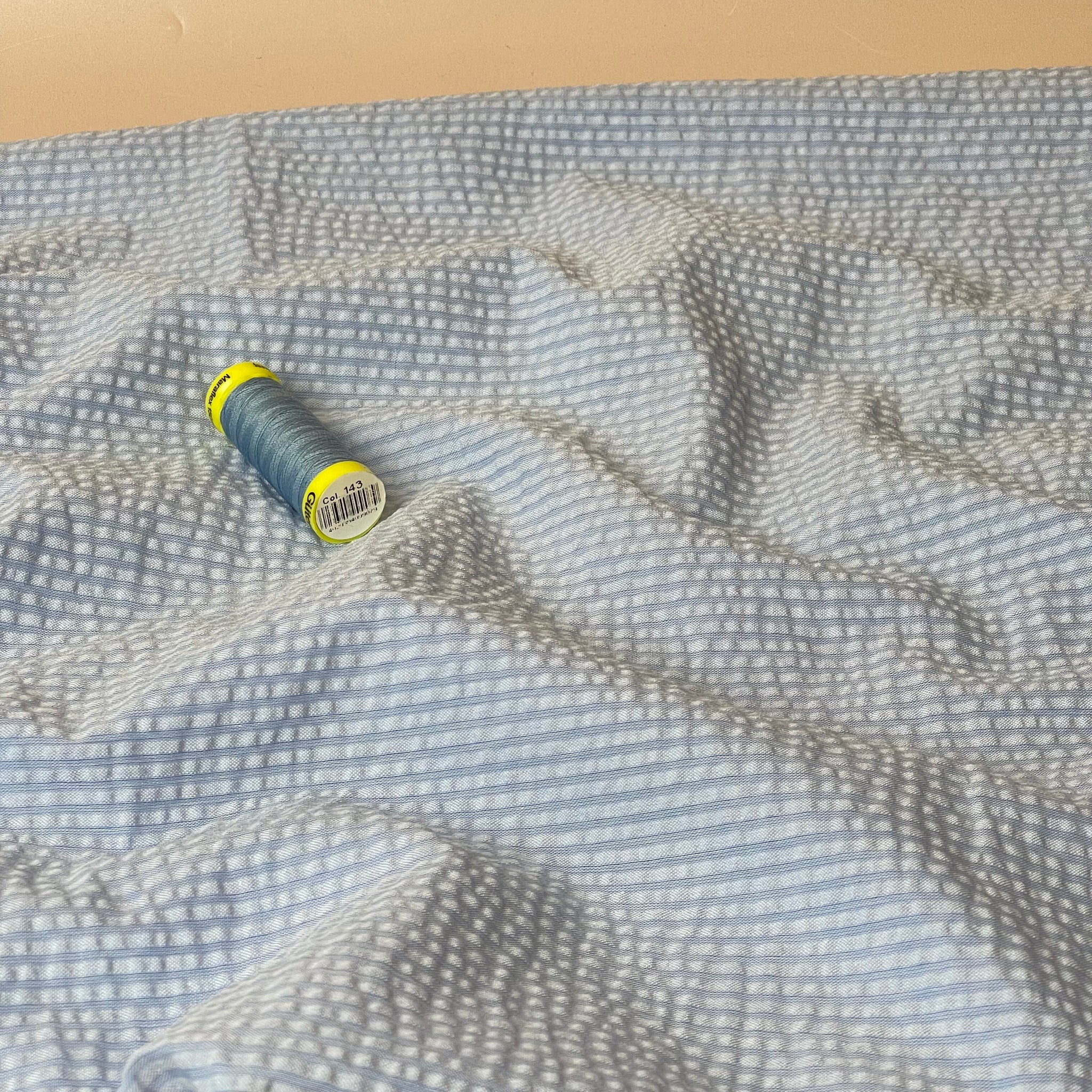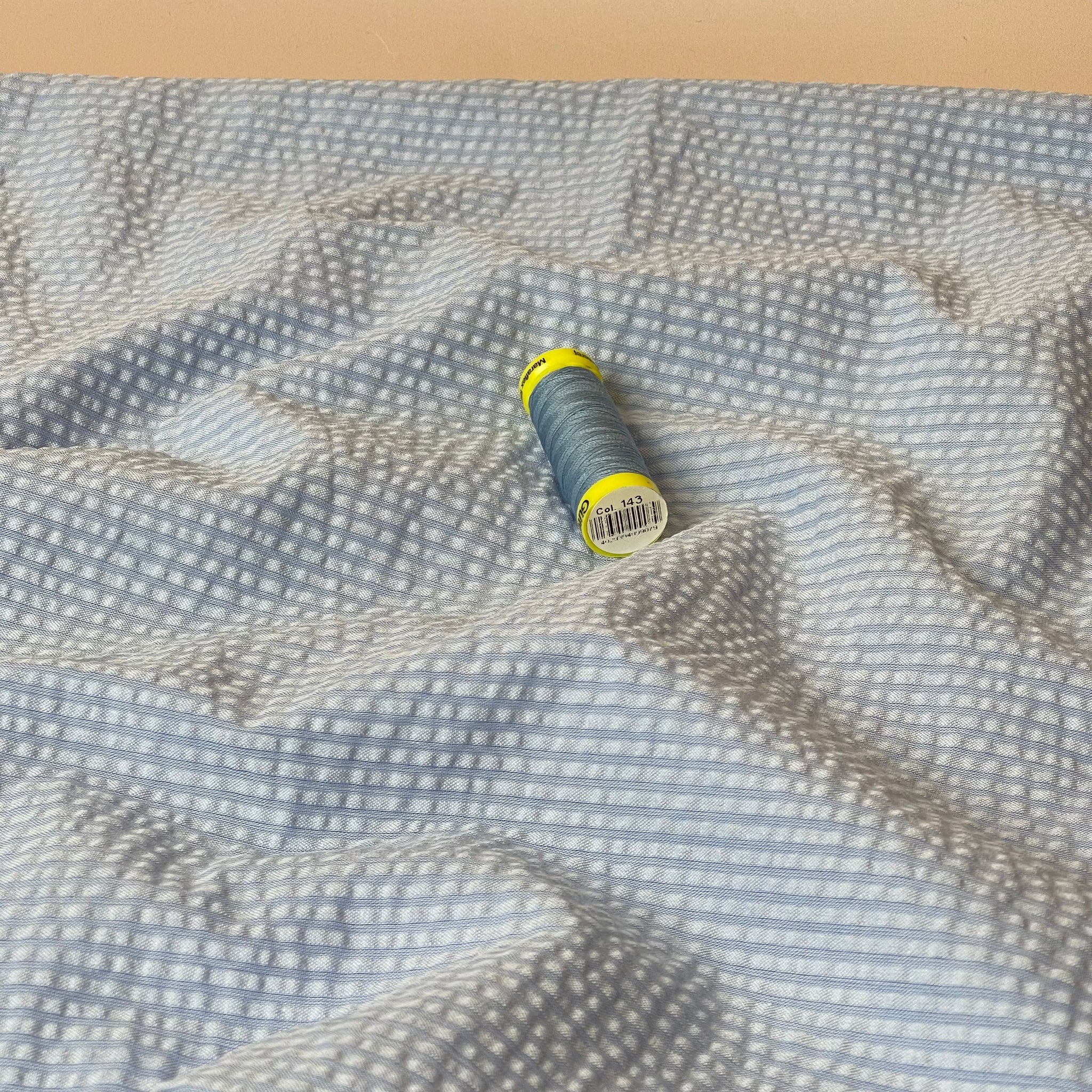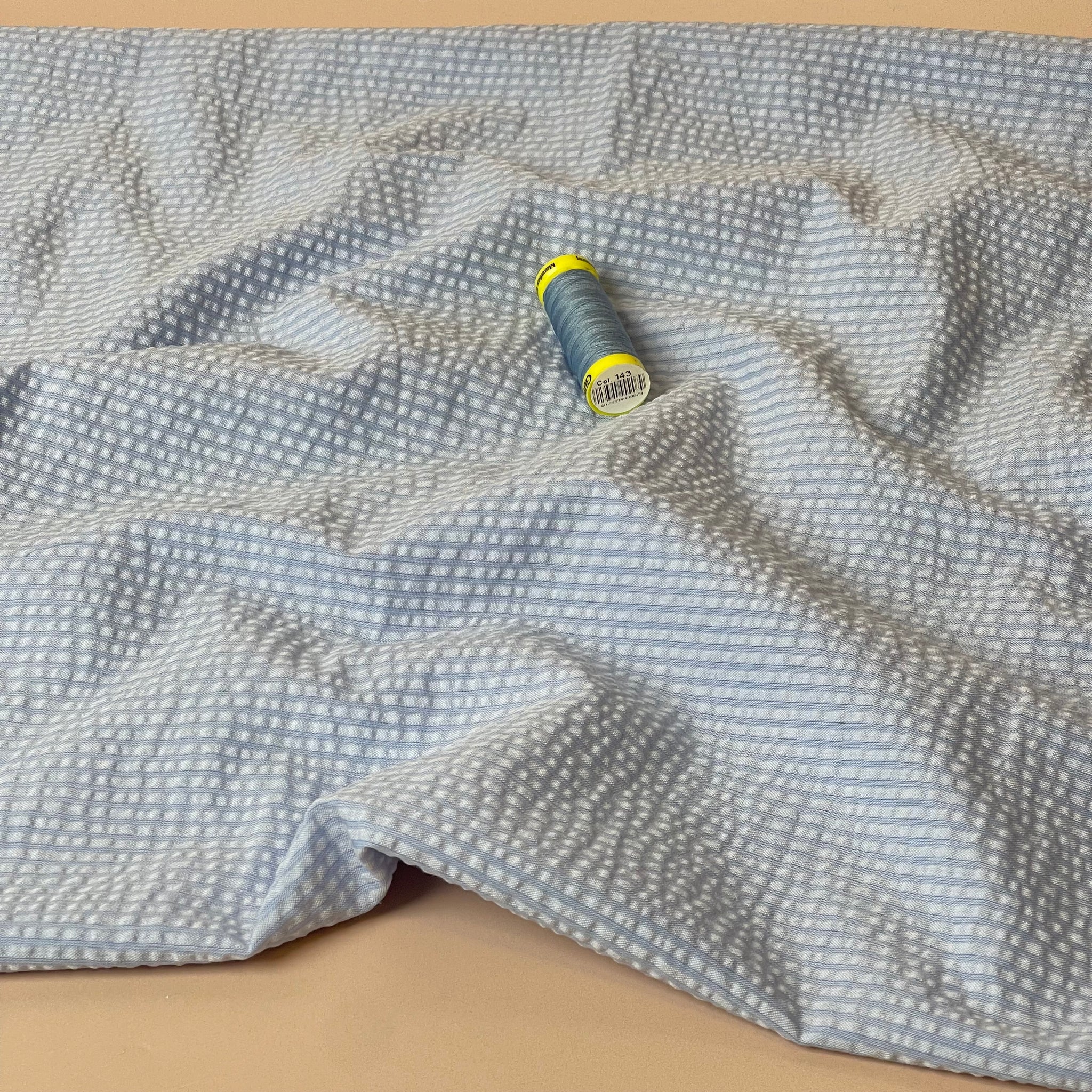 We are so pleased to be stocking this stunning, high quality, yarn dyed cotton seersucker fabric in plain shades of blue and white with textured lines running vertically on the fabric.