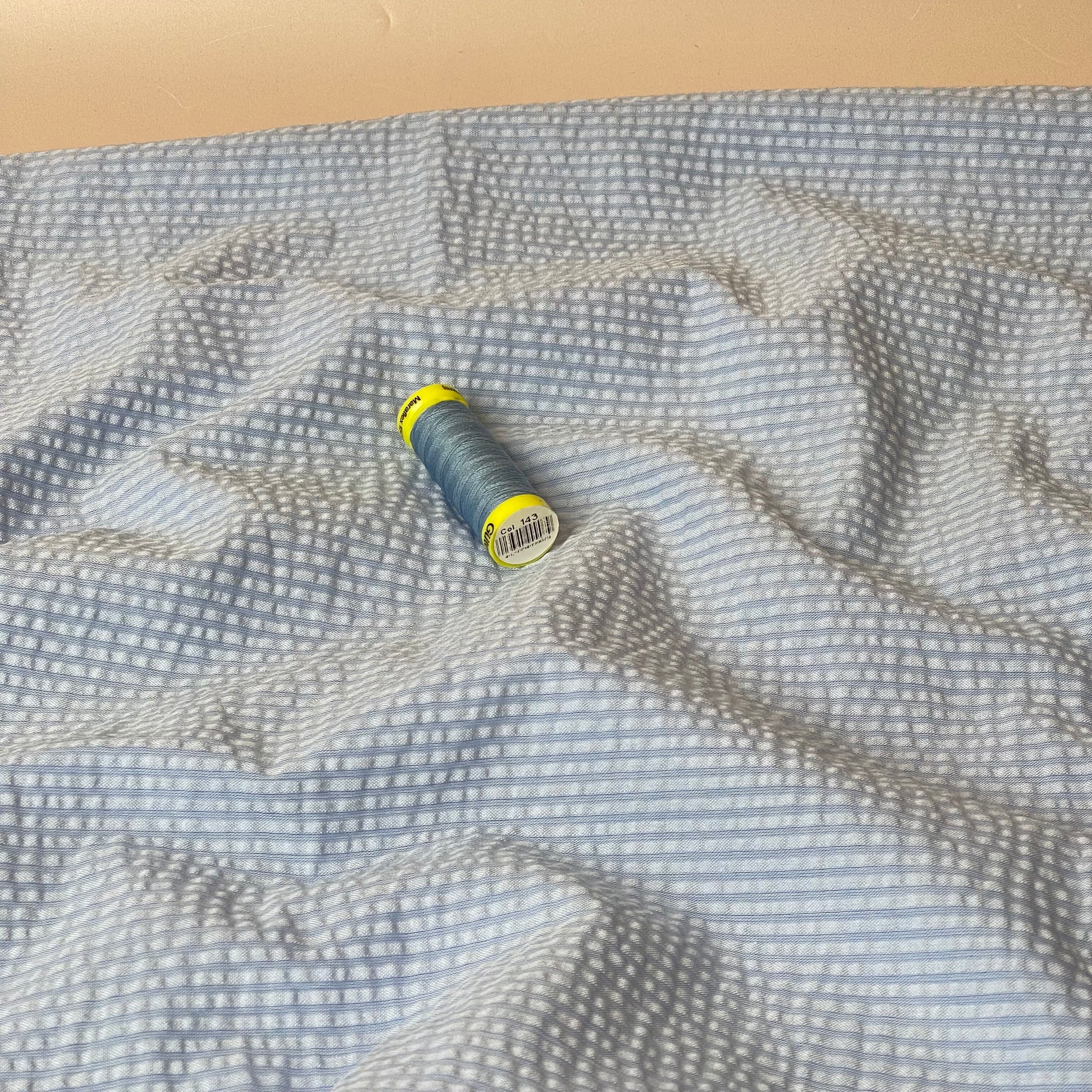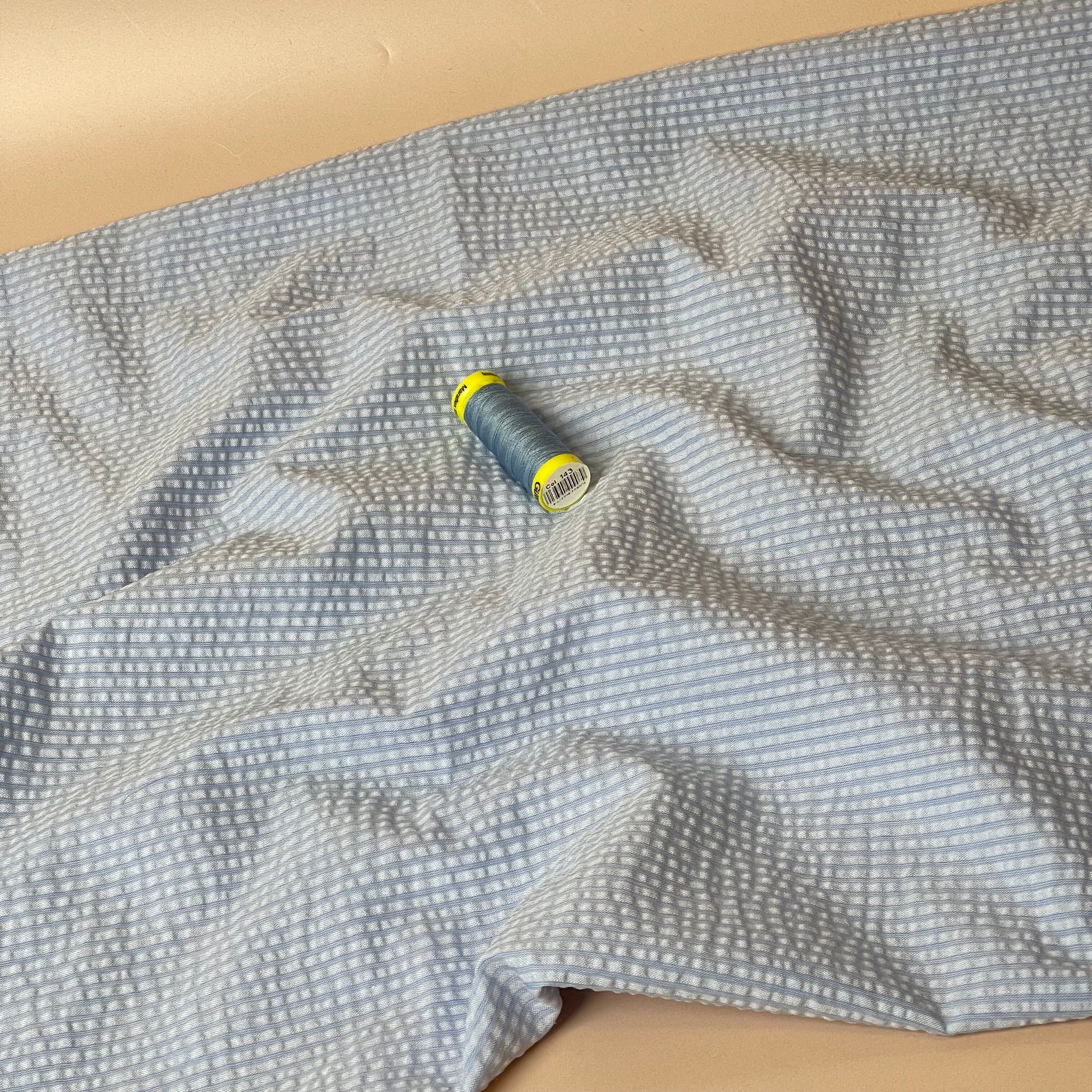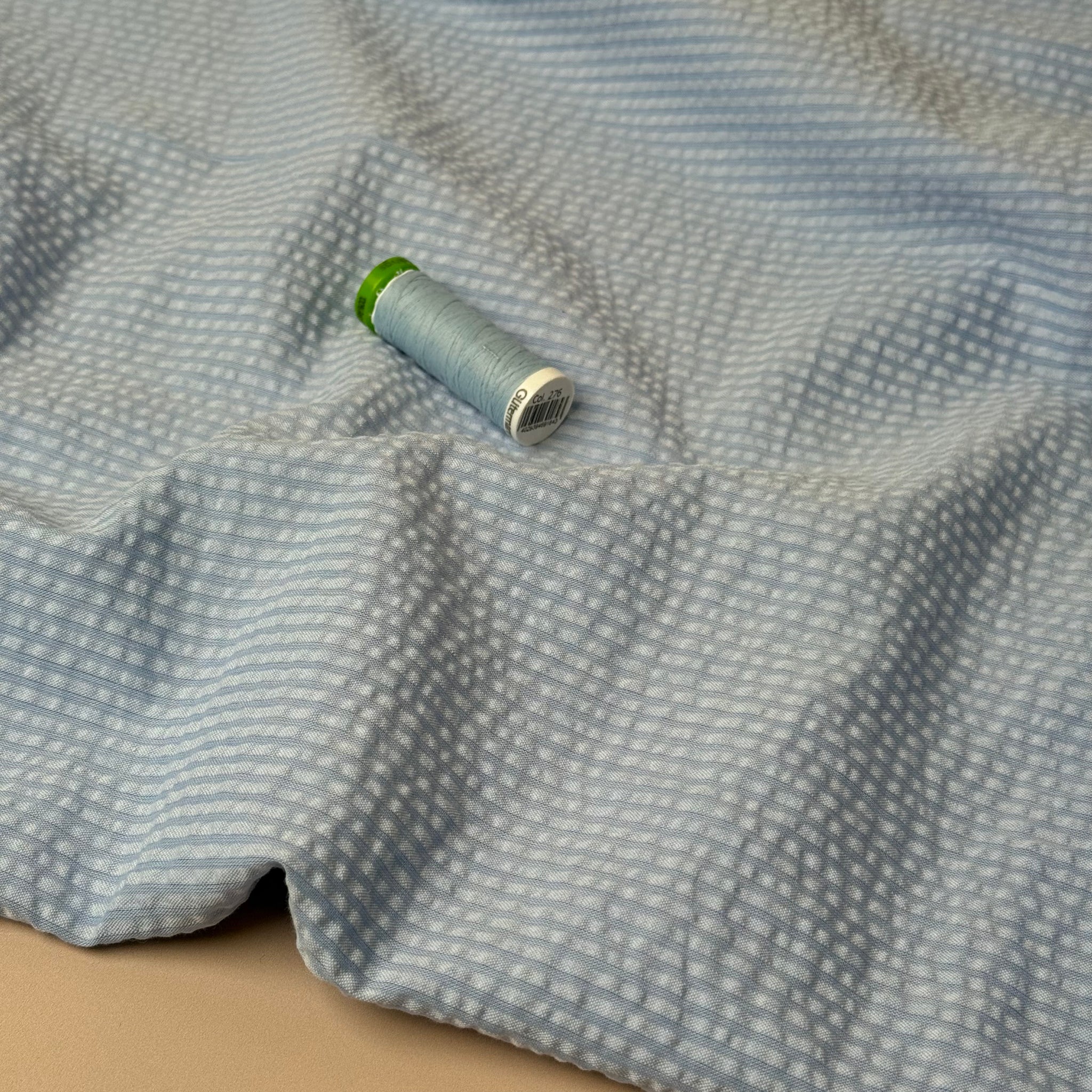 We are so pleased to be stocking this stunning, high quality, yarn dyed cotton seersucker fabric in plain shades of blue and white with textured lines running vertically on the fabric.