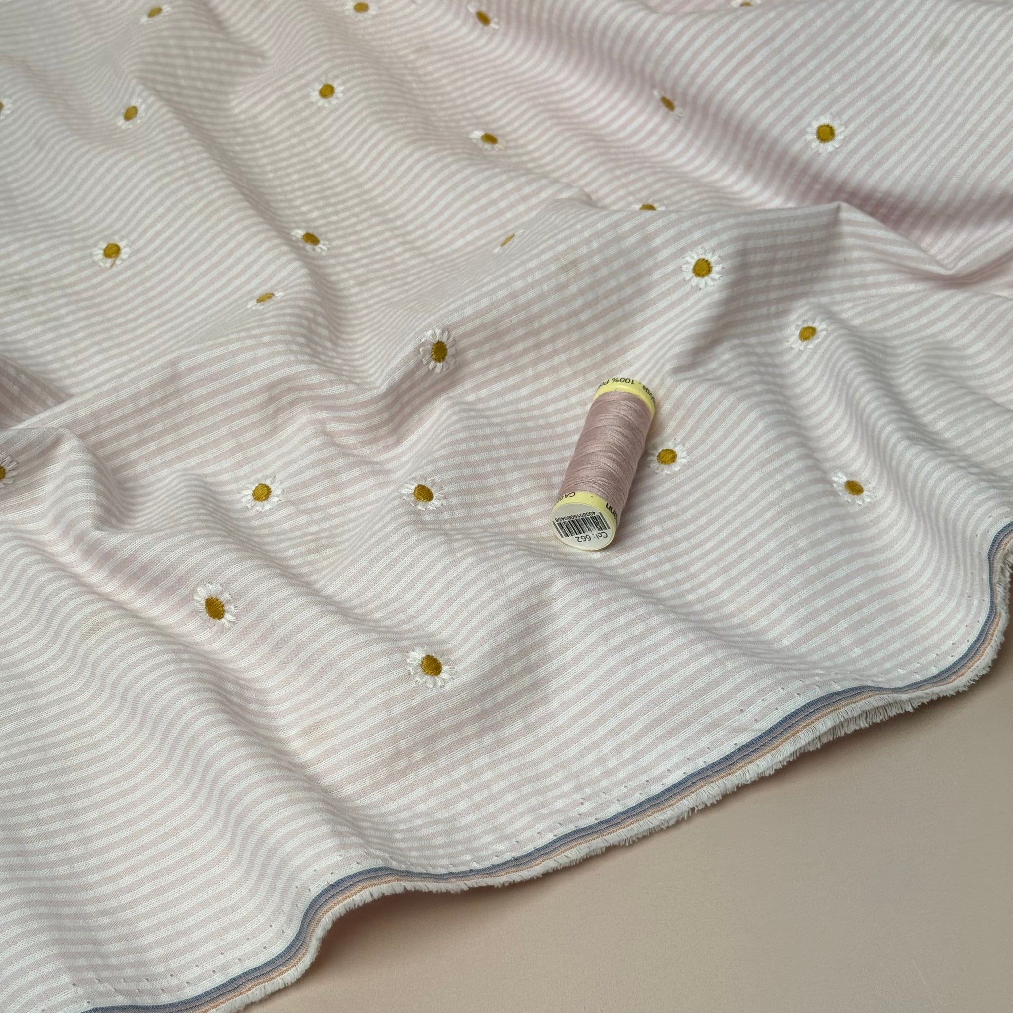 Embroidered Daisies on Pink Striped Cotton Seersucker