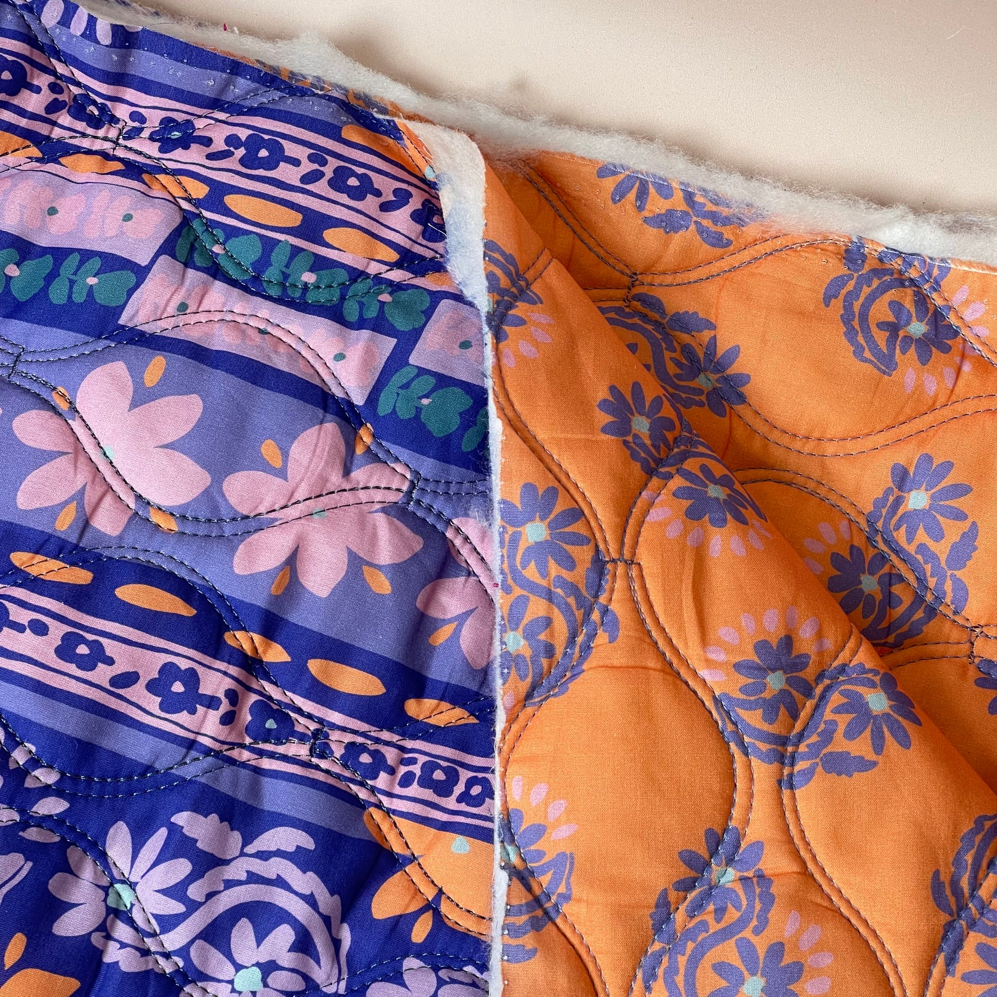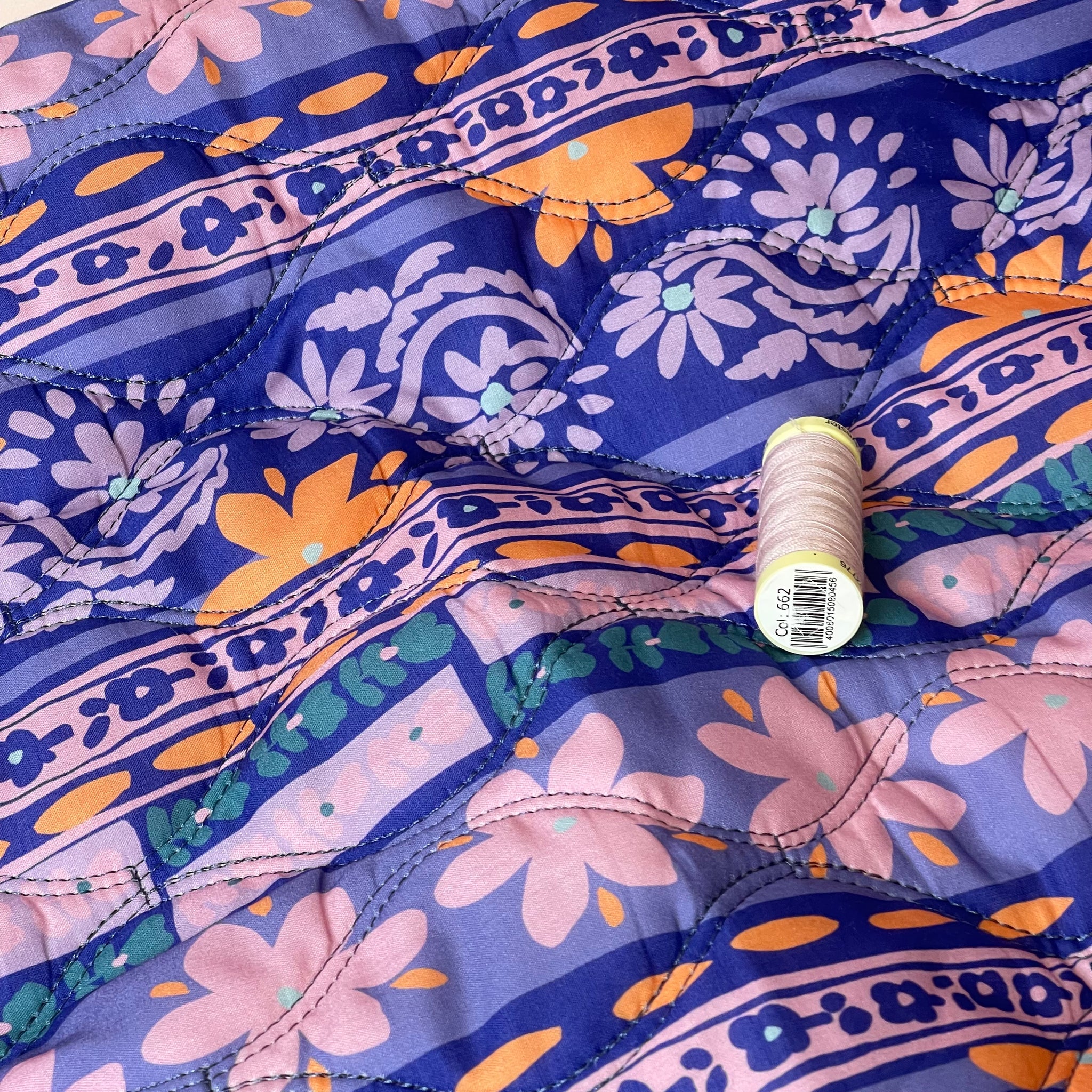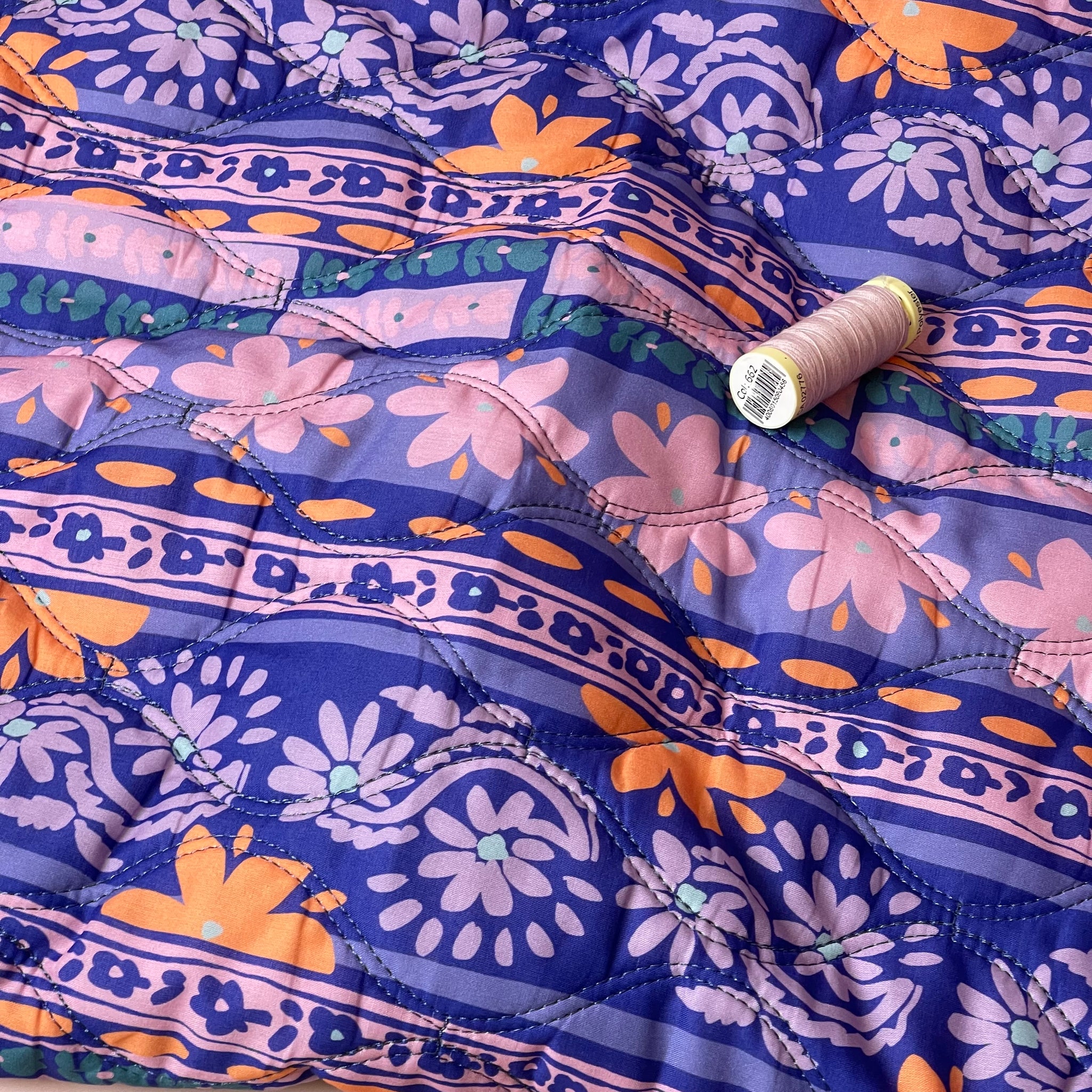 This reversible wadded, pre-quilted fabric is perfect for making lightweight and very cosy jackets or vests for all year round. The fabric features ornamental floral design in shades of purple, lilac, peach and chalky green accents, with the padding sewn between the two layers.