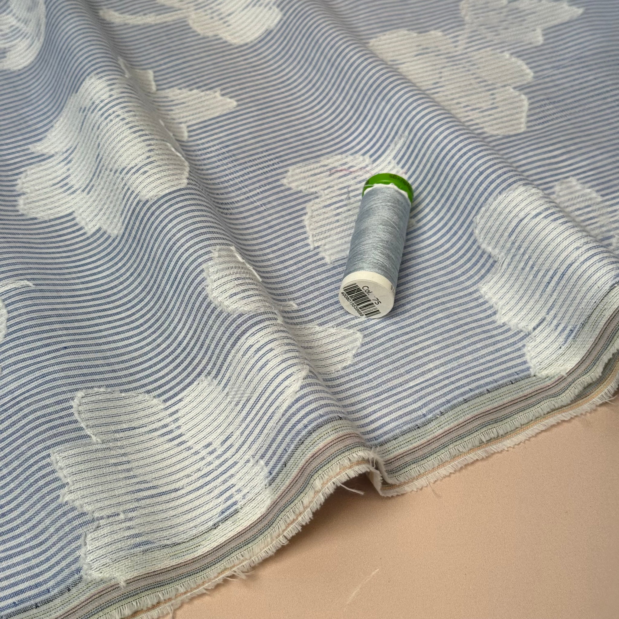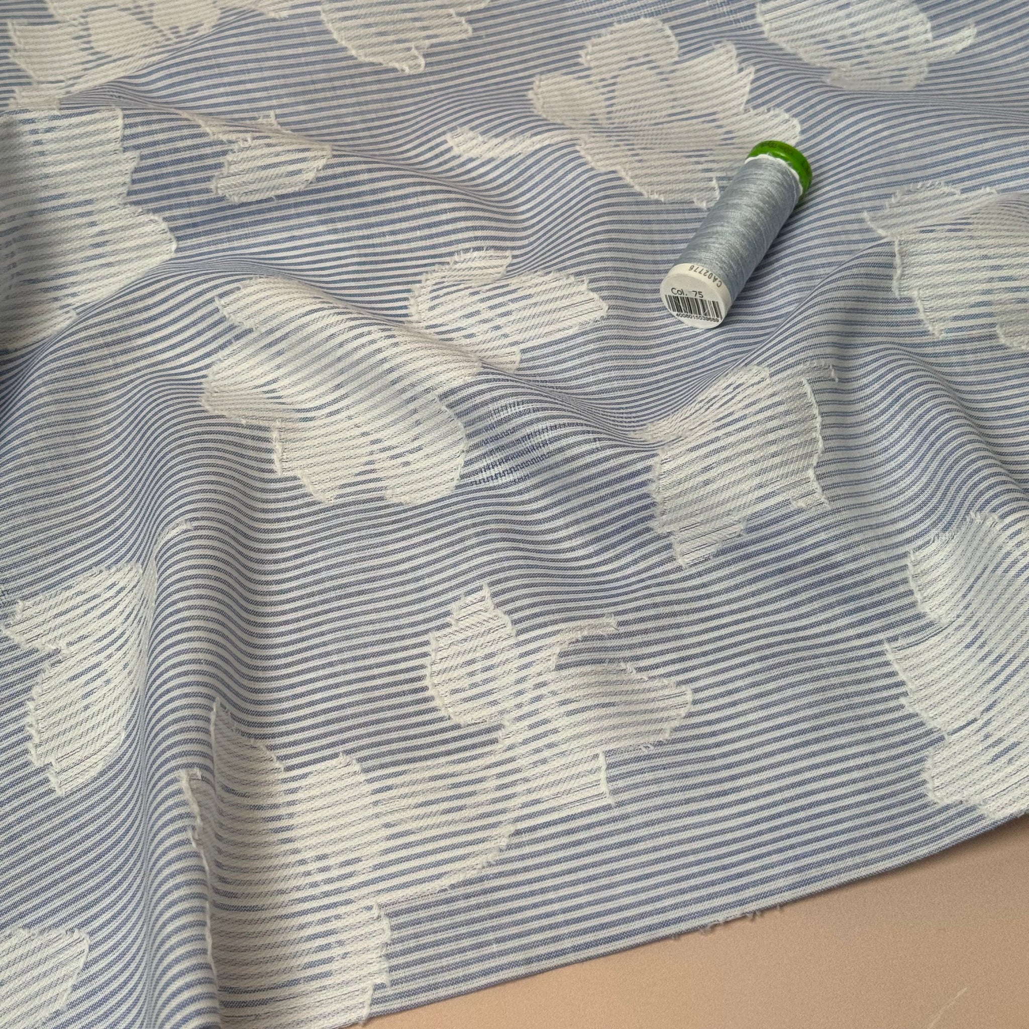 This soft and lightweight fabric features white flowers embossed on a classic blue and white pinstriped cotton background. It is airy and breathable, ideal for making summer shirts, blouses and dresses.