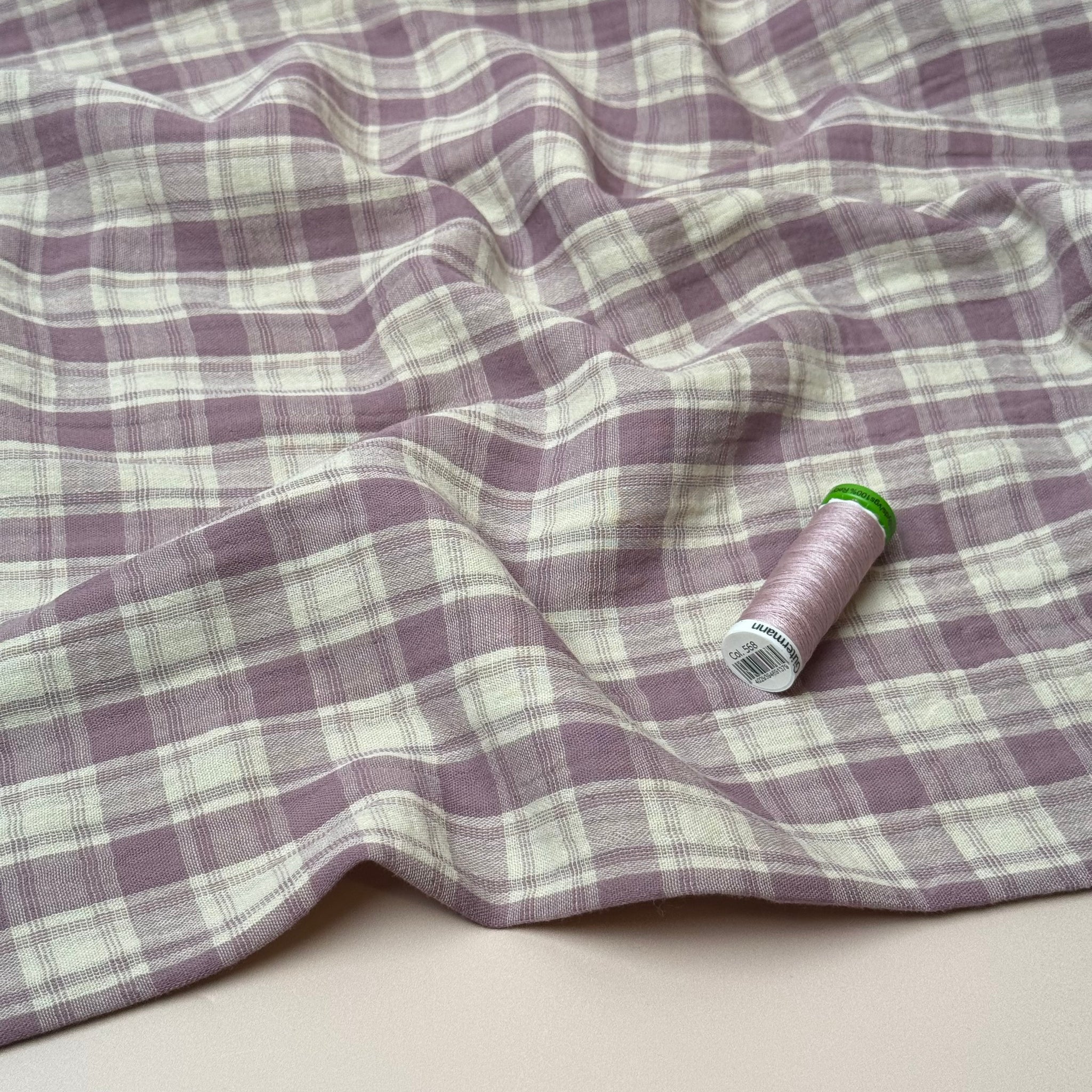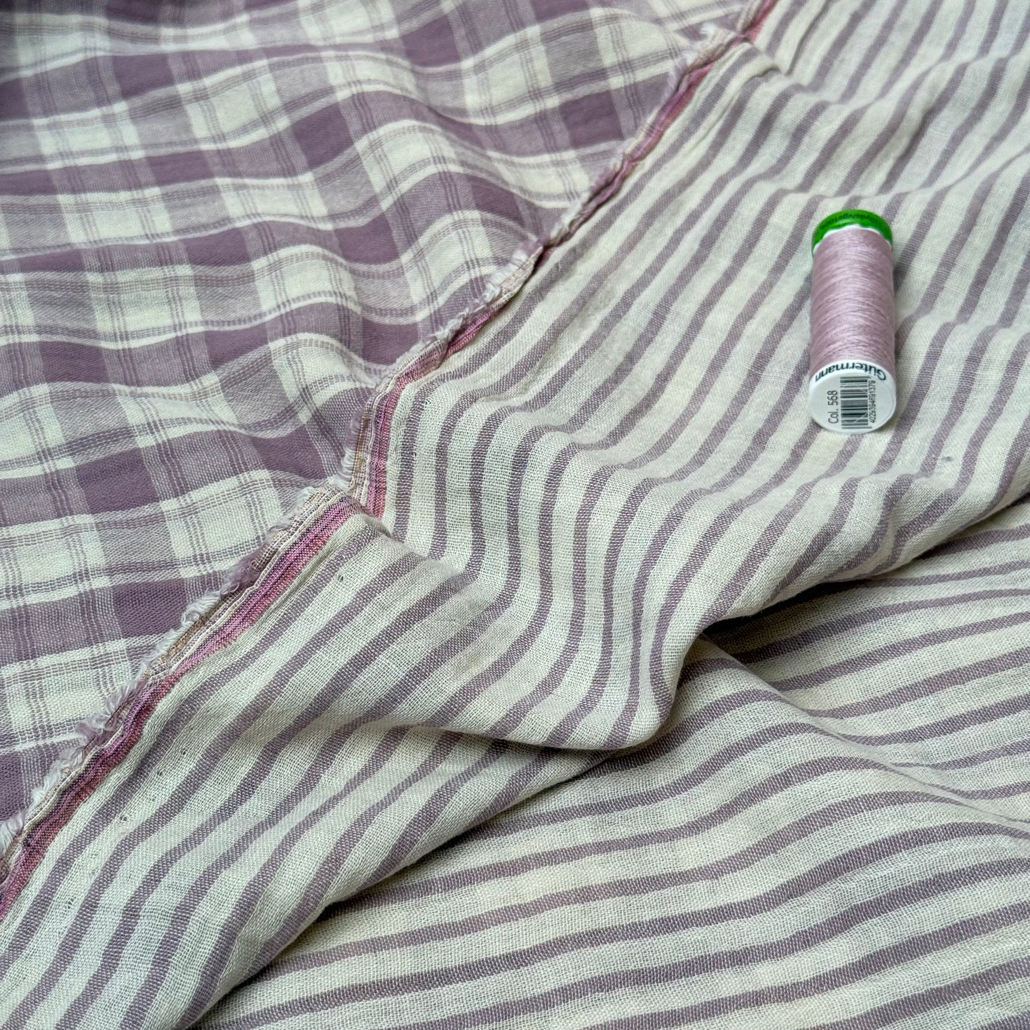 This soft and beautiful cotton double gauze is a reversible fabric, it features small stripes on one side and plaid checks on the outside in mauve and natural beige shade. You can use this feature on your sewing project to create a contrasting and unique garments.