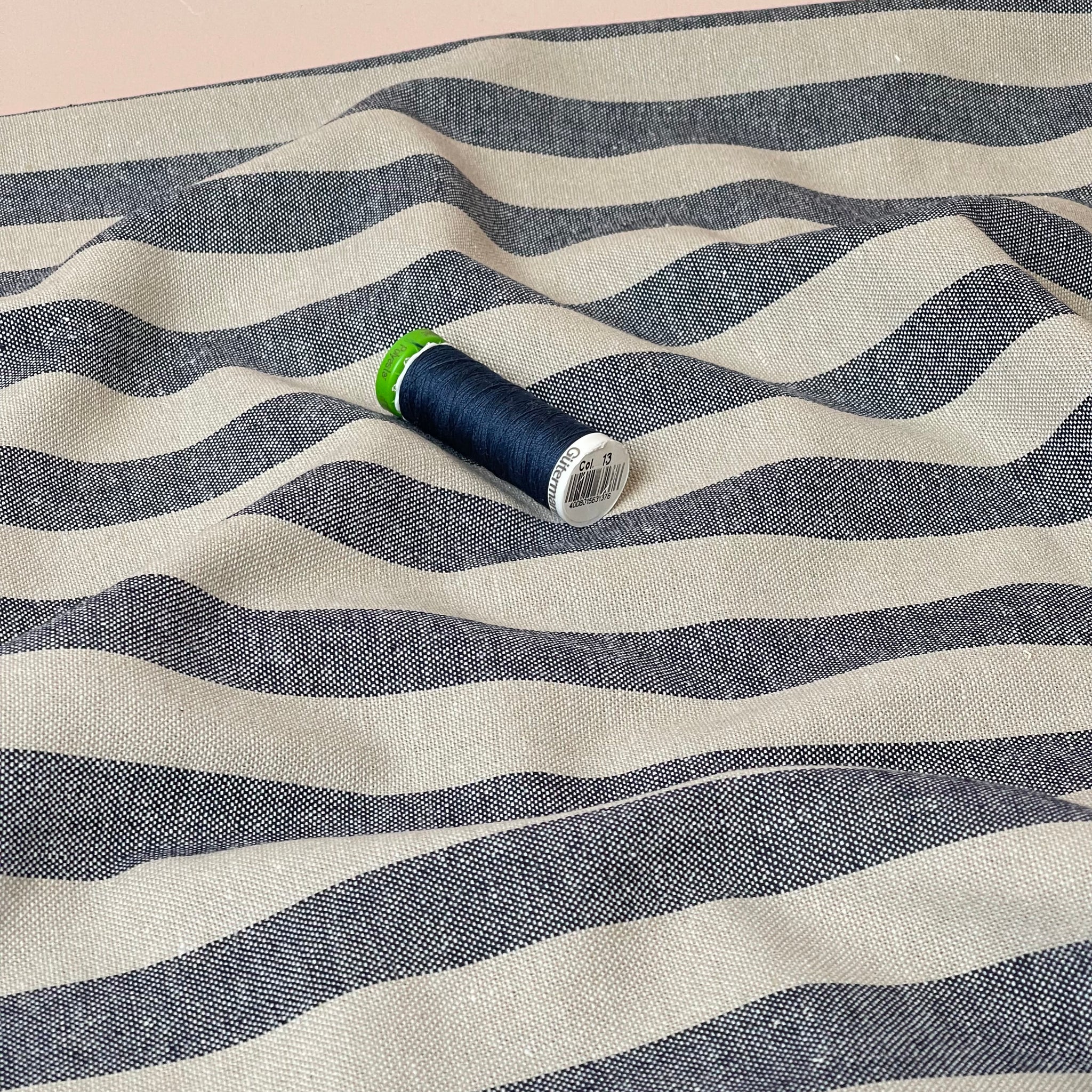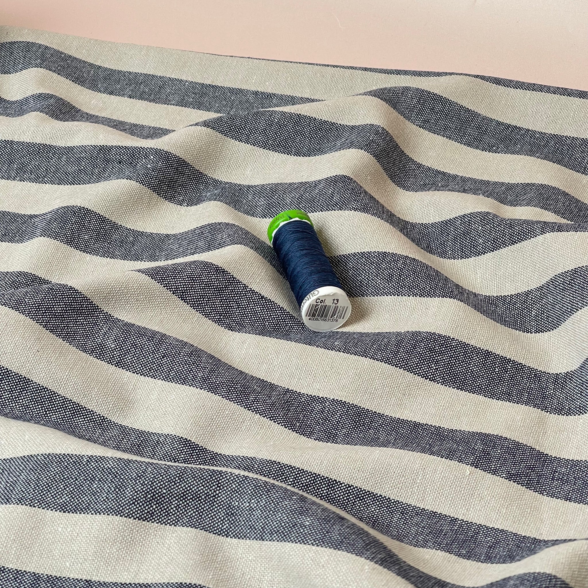 A beautiful and high quality yarn dyed viscose linen blend fabric with a classic vertical stripe design in blue and grey.