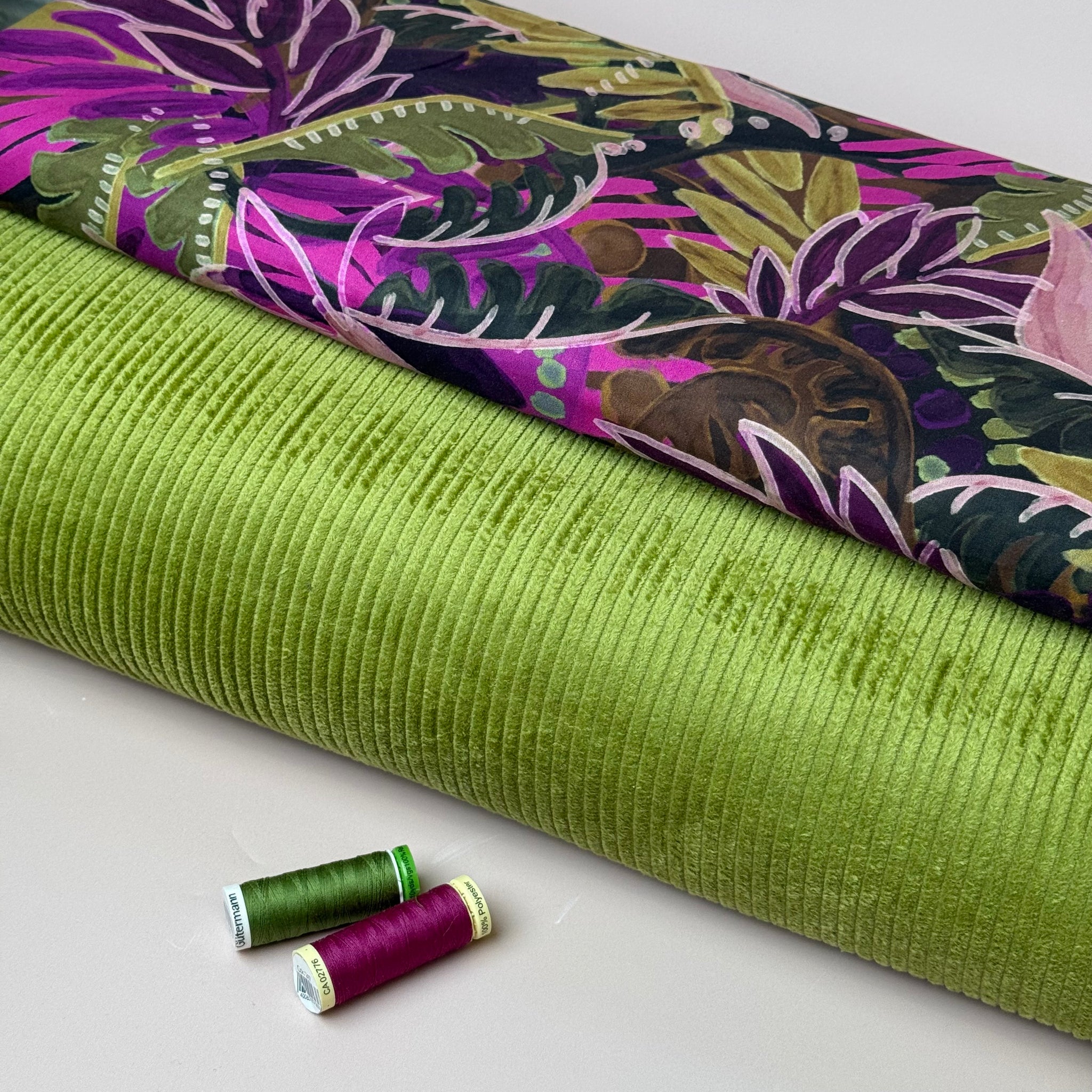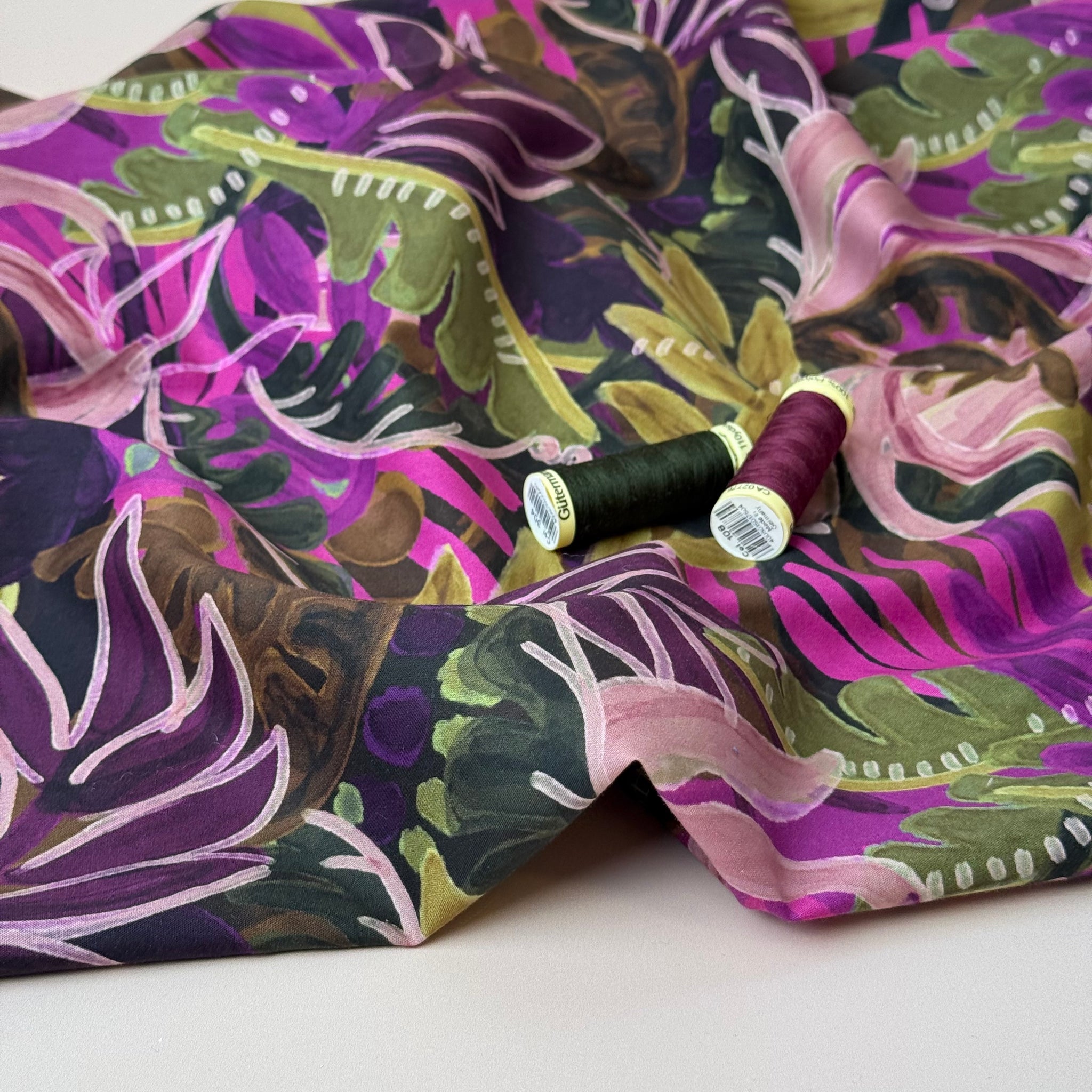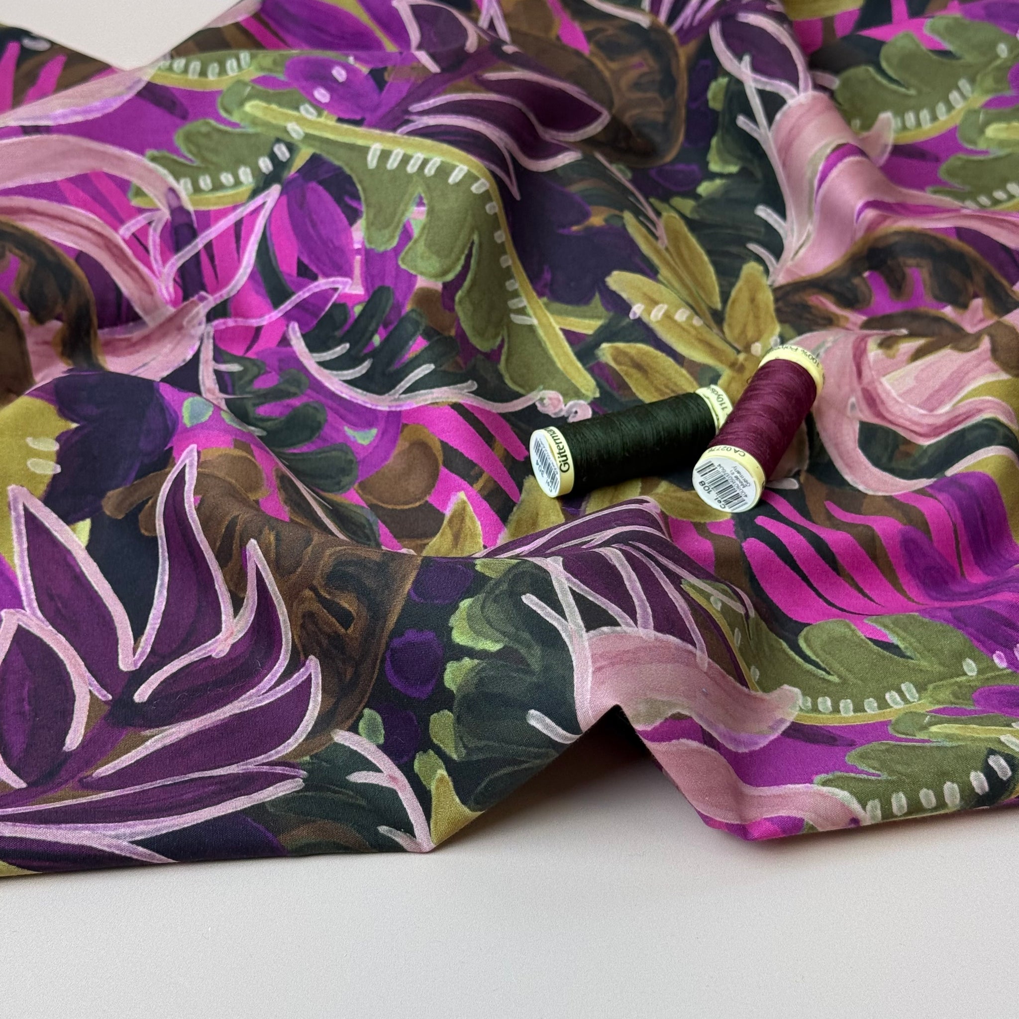 This pretty cotton viscose blend woven fabric features bold and vibrant foliage design in deep purple, magenta and ivy green. It is perfect for autumn / winter wardrobe for its rich shades. It is also an ideal fabric for the best qualities of both fibres, cotton for its structure and breathability and viscose for its drape. It is ideal for making shirts, blouses, dresses, pyjamas, skirts and culottes.