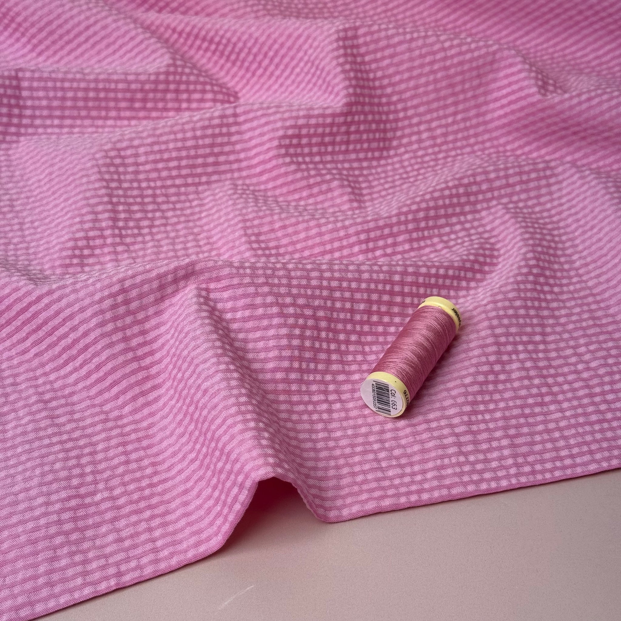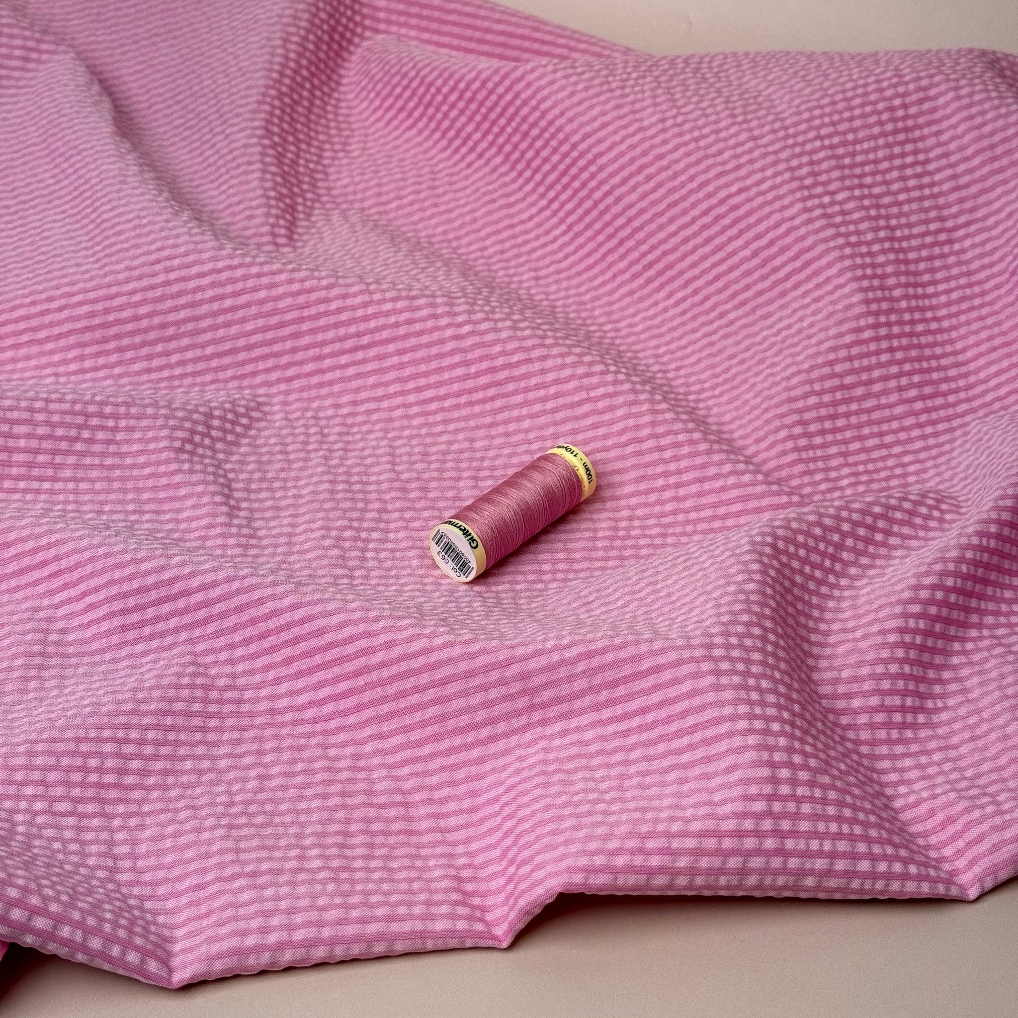 We are so pleased to be stocking this stunning, high quality, yarn dyed cotton seersucker fabric in plain shades of pink with textured lines running vertically on the fabric.