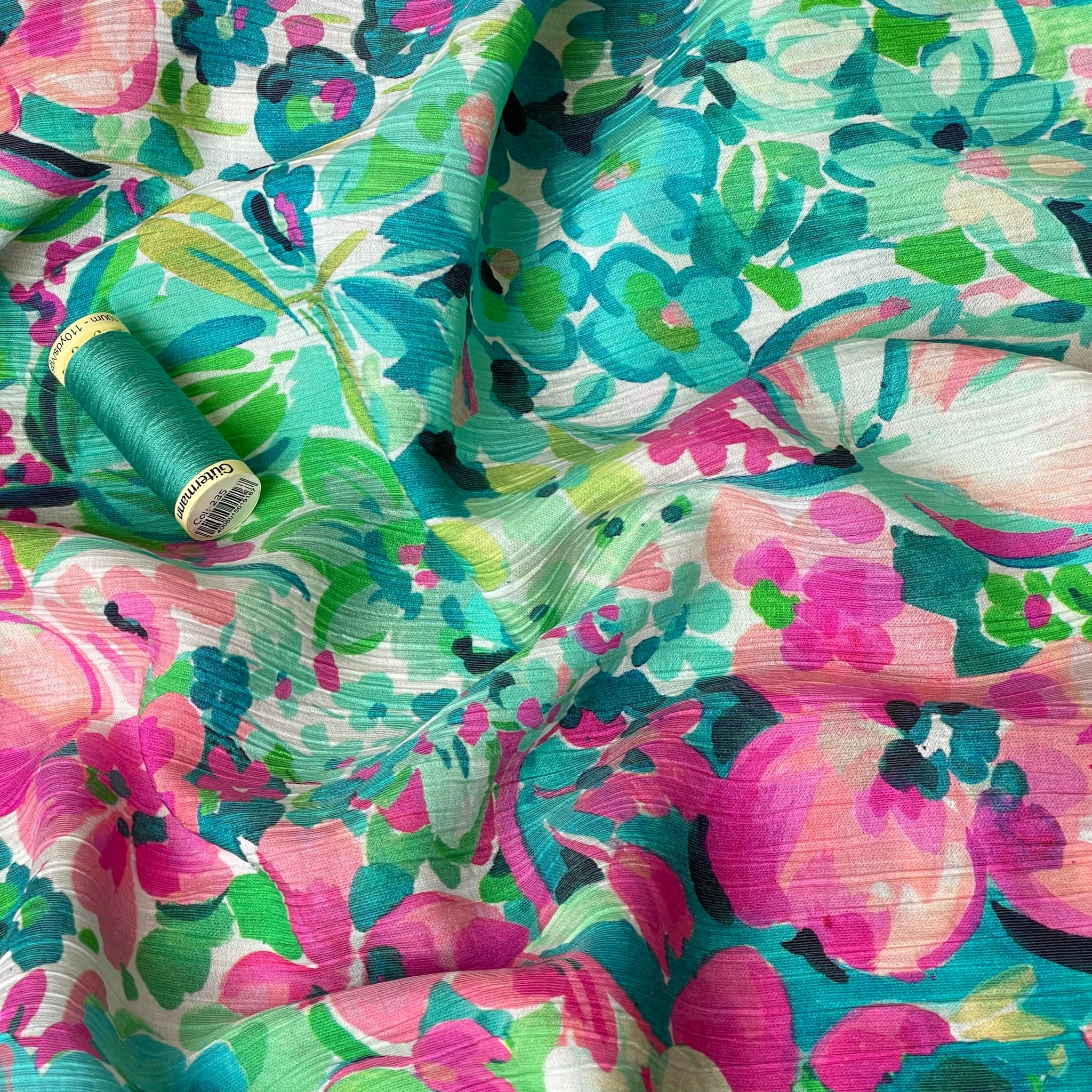This beautiful textured viscose fabric has ample drape and features stunning watercolour floral design in vibrant shades of pink and green on a textured off white background, requiring minimal ironing.