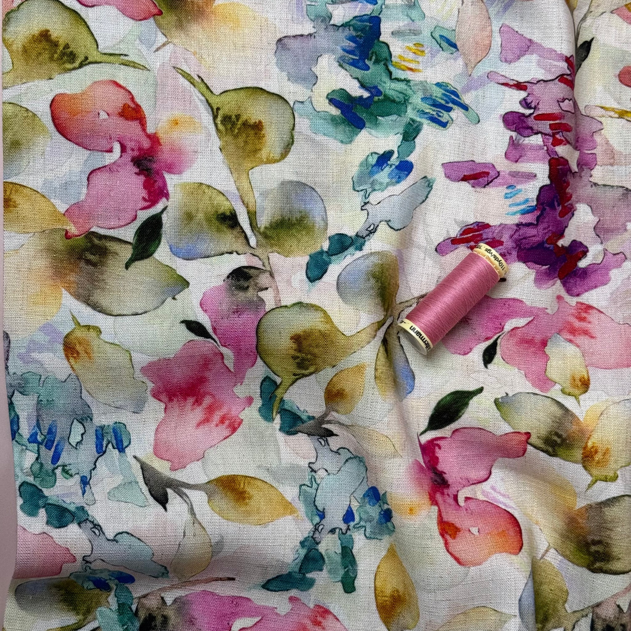 A beautiful viscose linen blend fabric with the most beautiful painterly watercolour design in pink, petrol blue and olive on a natural background, with dark green accents.