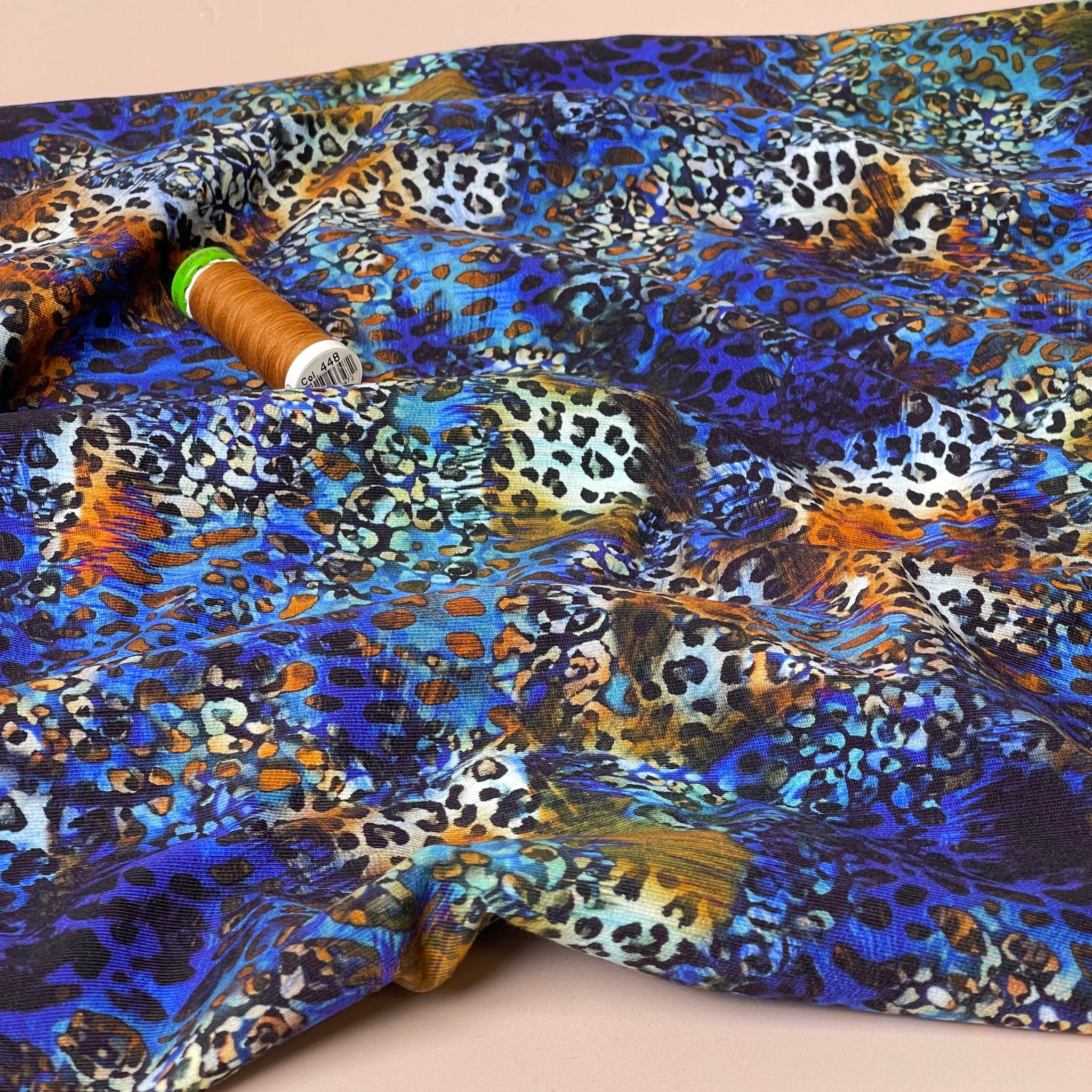 High quality cotton french terry fabric with looped back featuring an abstract design, with leopard print patches, in shades of rust, blue and off white with black accents. It will make a cosy, comfortable and elegant t-shirts, sweaters, hoodies, sweater dresses and joggers.