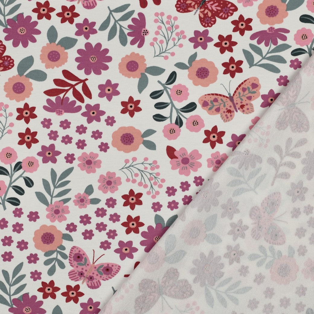 High quality cotton french terry fabric with looped back, featuring stunning floral design and butterflies in pink and peach shades with sage leaves on an off-white background. It will make a cosy, comfortable and elegant t-shirts, sweaters, hoodies, sweater dresses and joggers.