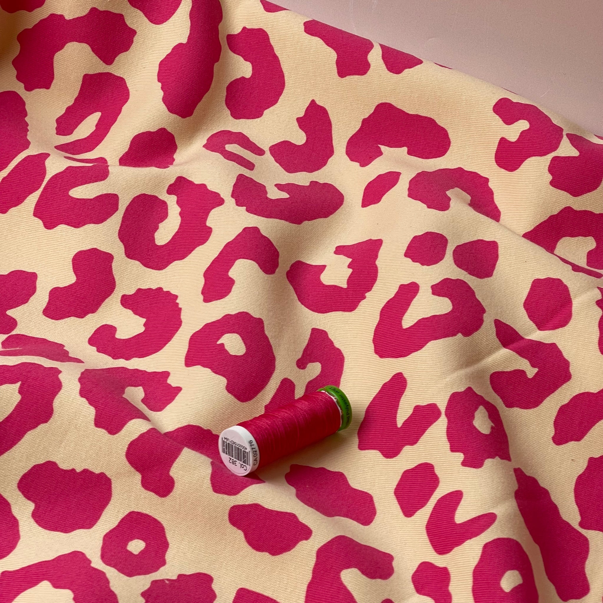 Snuggly and soft, high quality cotton sweat-shirting fabric with fleecy back featuring iconic animal print in pink on a creamy off-white (creme brûlée) background. This fabric is ultra soft and is made from Organic cotton and recycled polyester, making it kinder to the skin and to the planet.