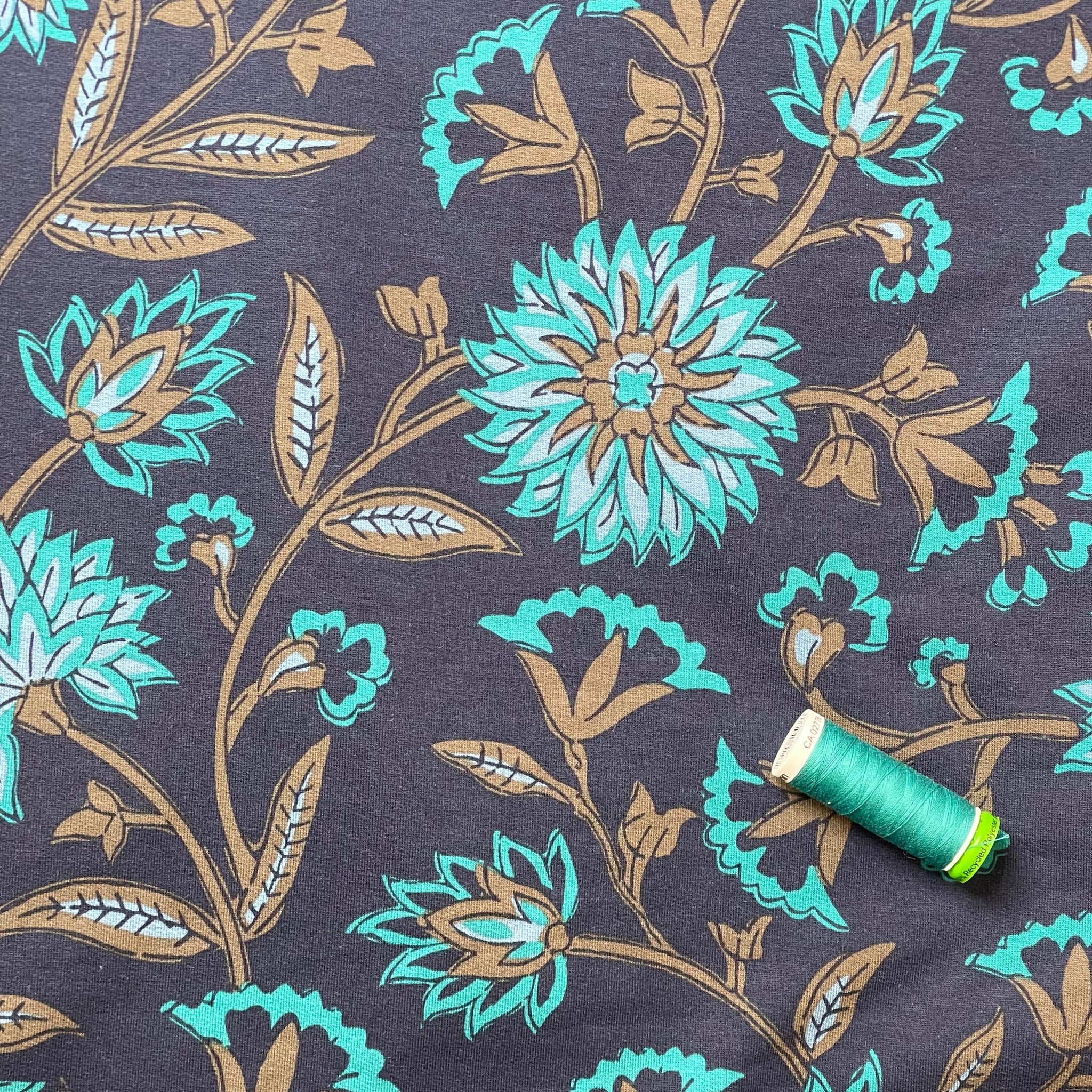 High quality cotton french terry fabric with looped back featuring flowers in turquoise and brown with blue accents, on a navy blue background. It will make a cosy, comfortable and elegant t-shirts, sweaters, hoodies, sweater dresses and joggers.