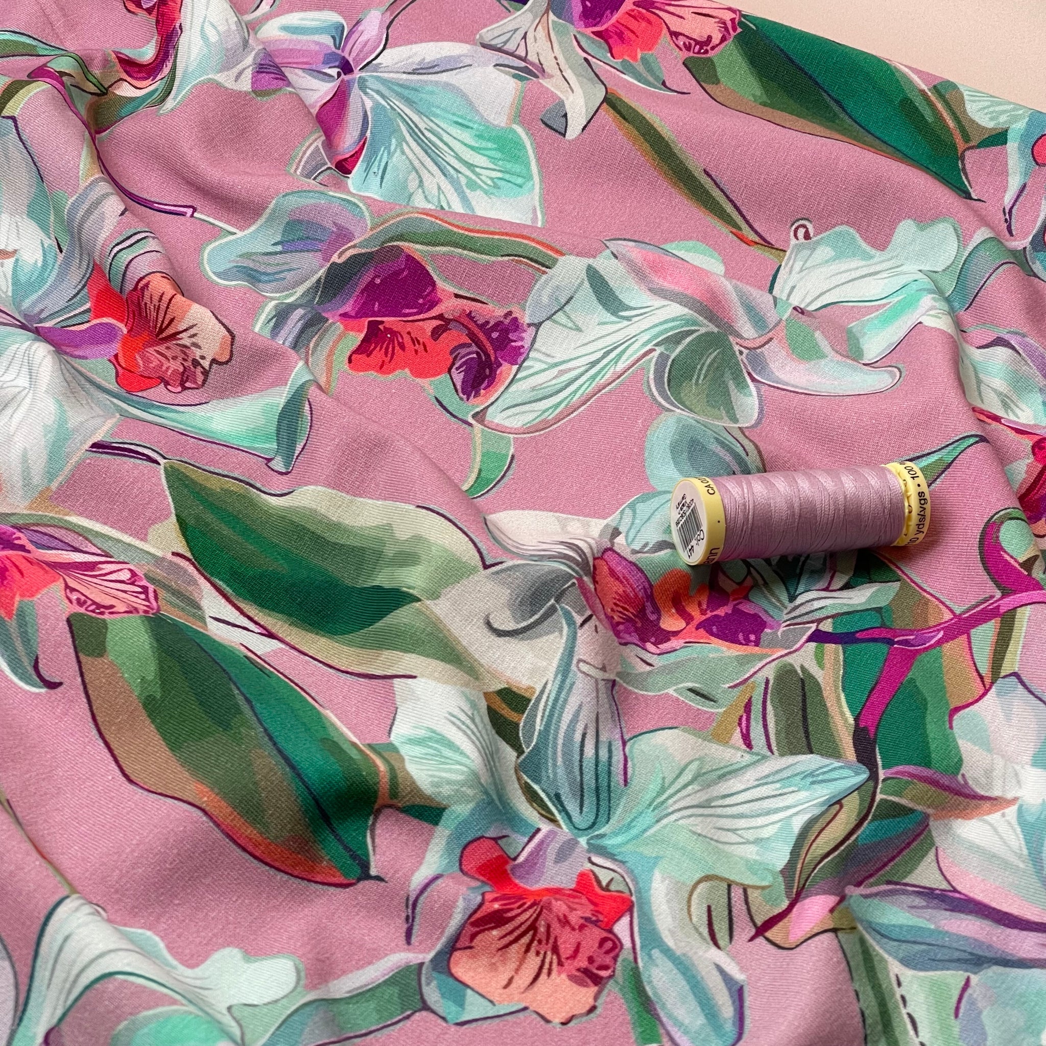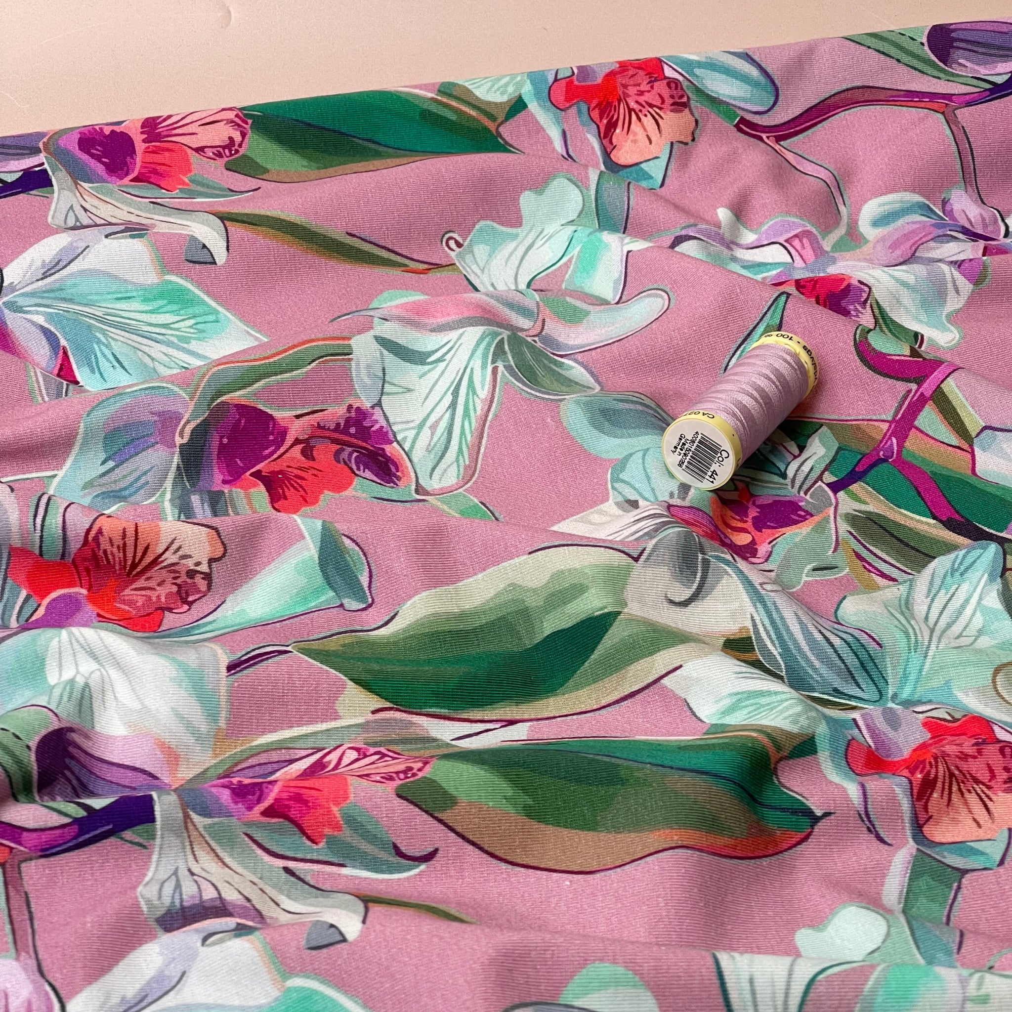A stunning, soft and high quality cotton single knit jersey, this fabric featuring large floral design in light colours and green foliage on a pink background. It is cosy and comfortable and will bring you a lot of joy when sewing and wearing.