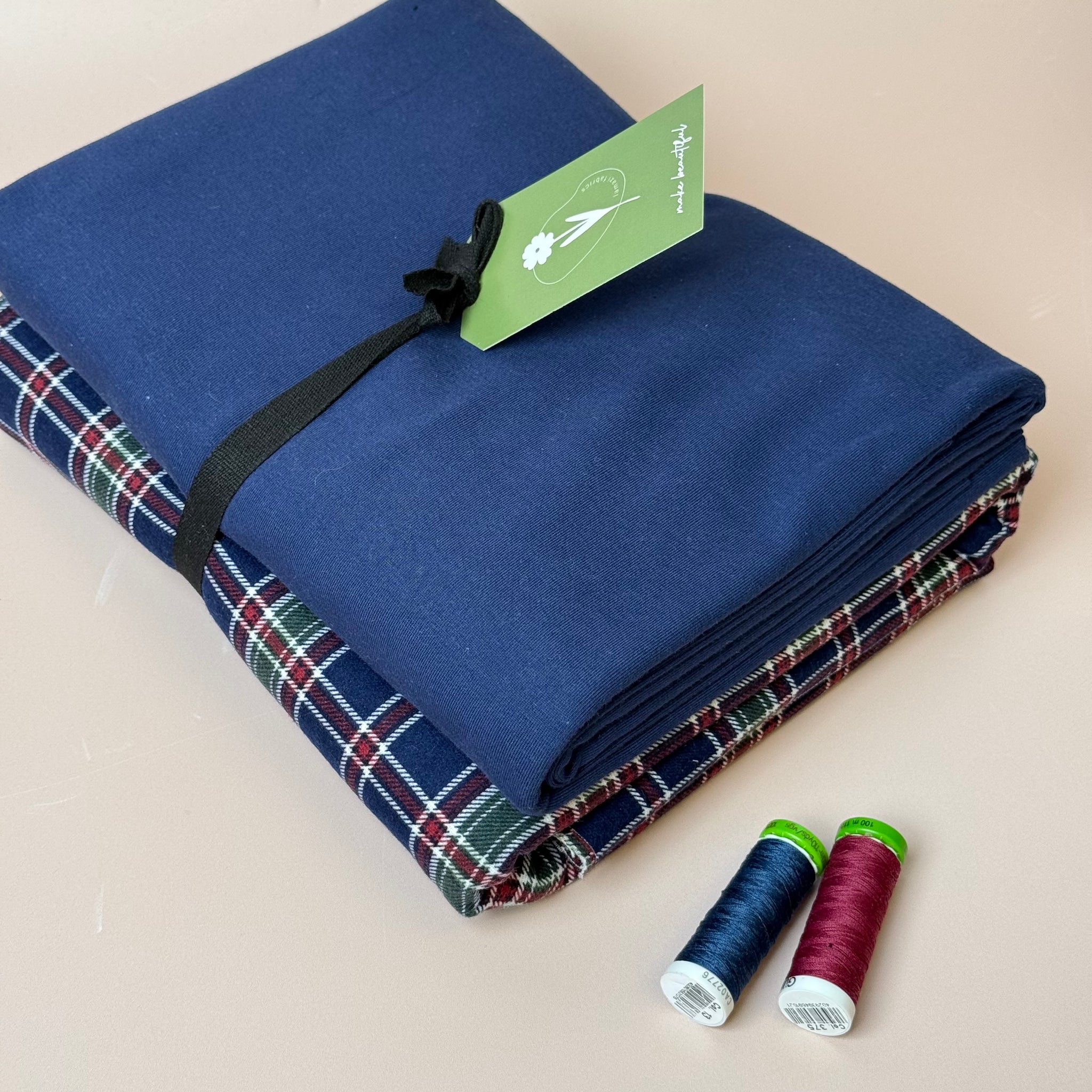 The Bundle with Sewing supplies option includes: Jamie and Skyline patterns with instructions, a Maraflex and Sew all threads matched to your fabrics, stretch needles and elastic for pyjama bottoms. Please note this option isn’t included in the fabric only bundle.