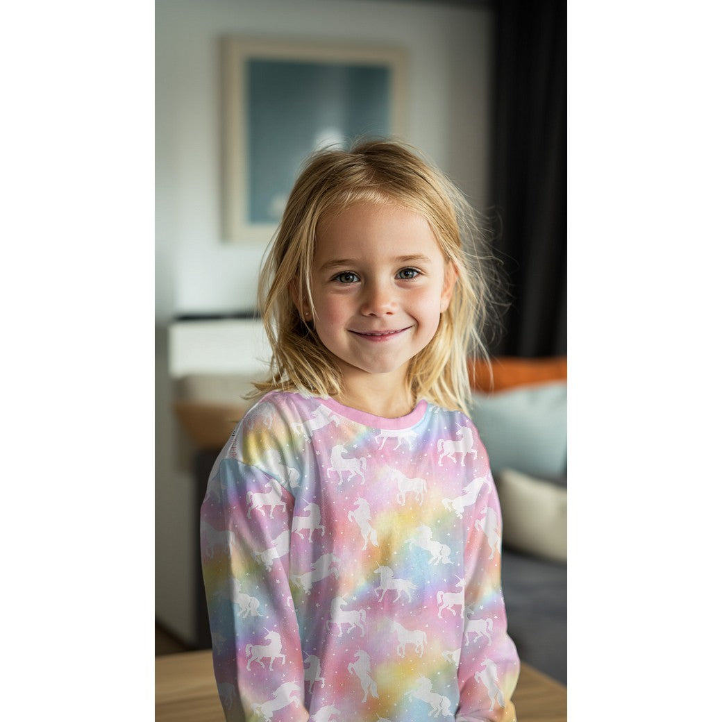 A stunning soft and high quality cotton single knit jersey, featuring magical unicorns and stars on a rainbow coloured background. It is cosy and comfortable and will bring you a lot of joy when sewing and wearing.