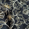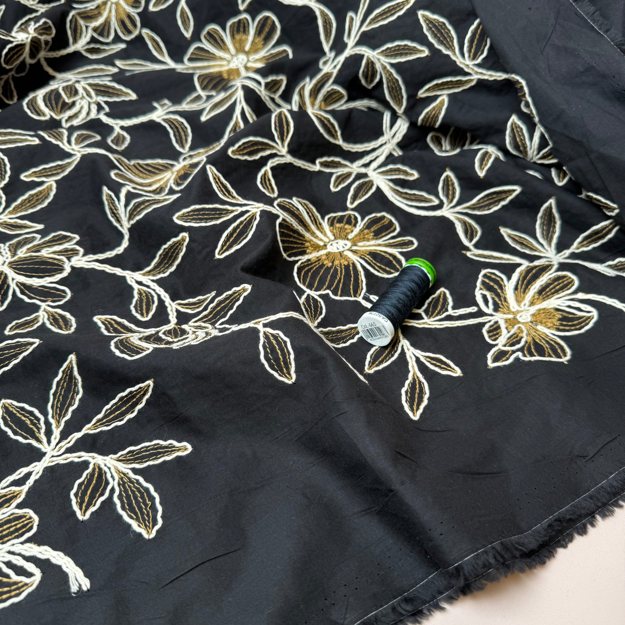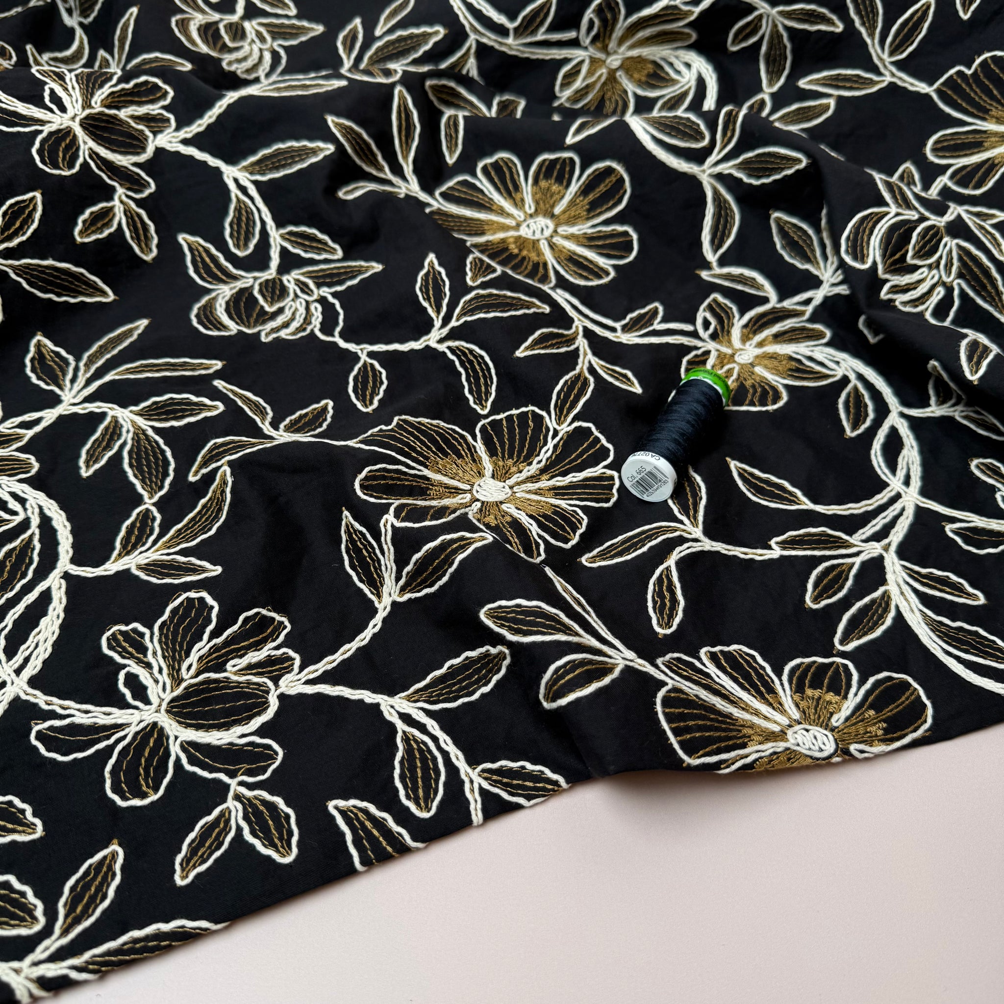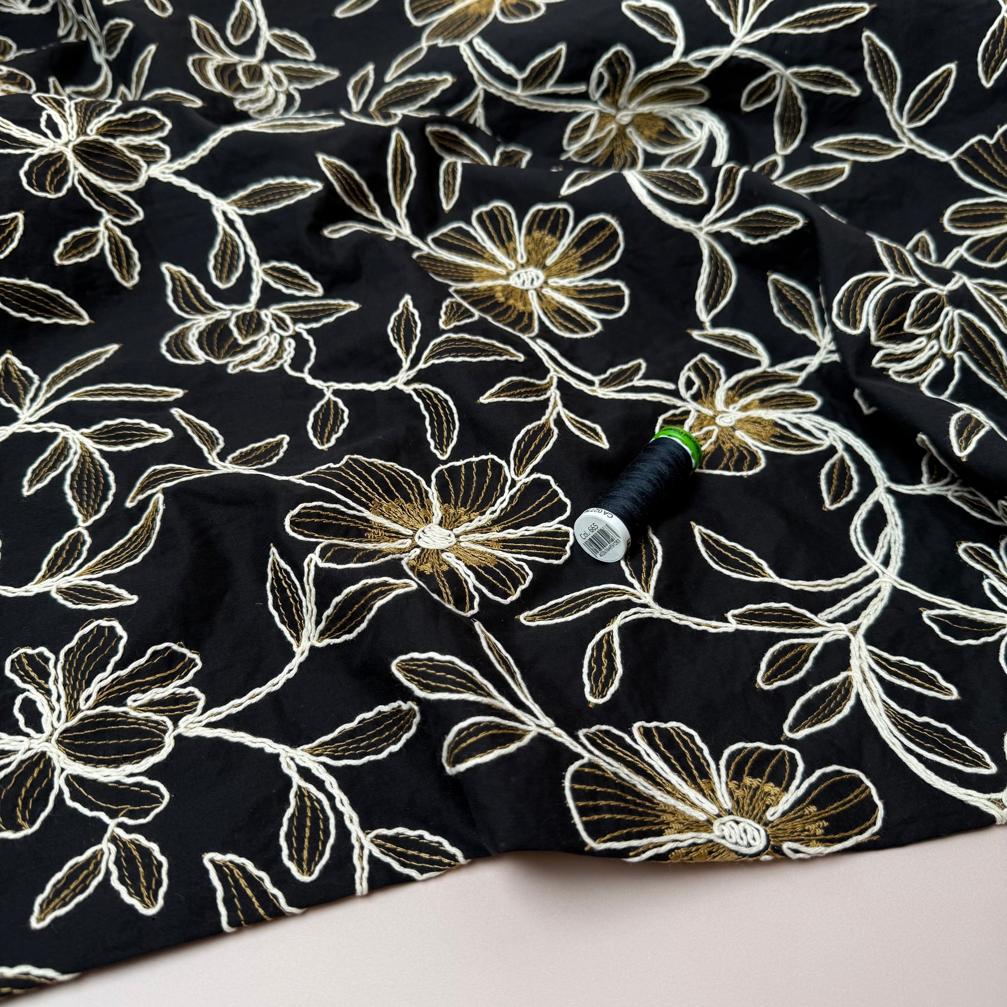 A beautiful and elegant high quality cotton embroidered fabric featuring flowers in white yarn and gold on a dyed black background. This fabric is ideal for sewing an elegant dress, shirt and blouse.