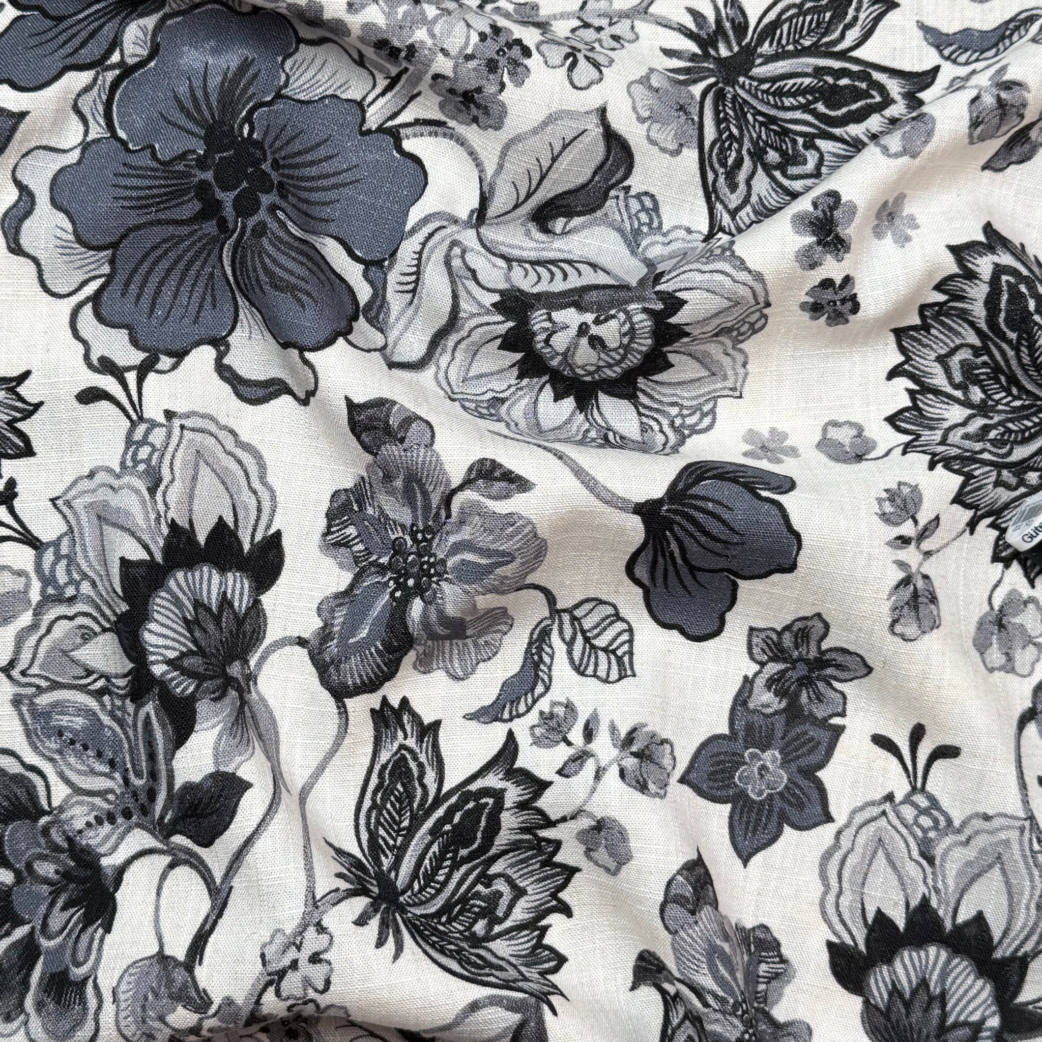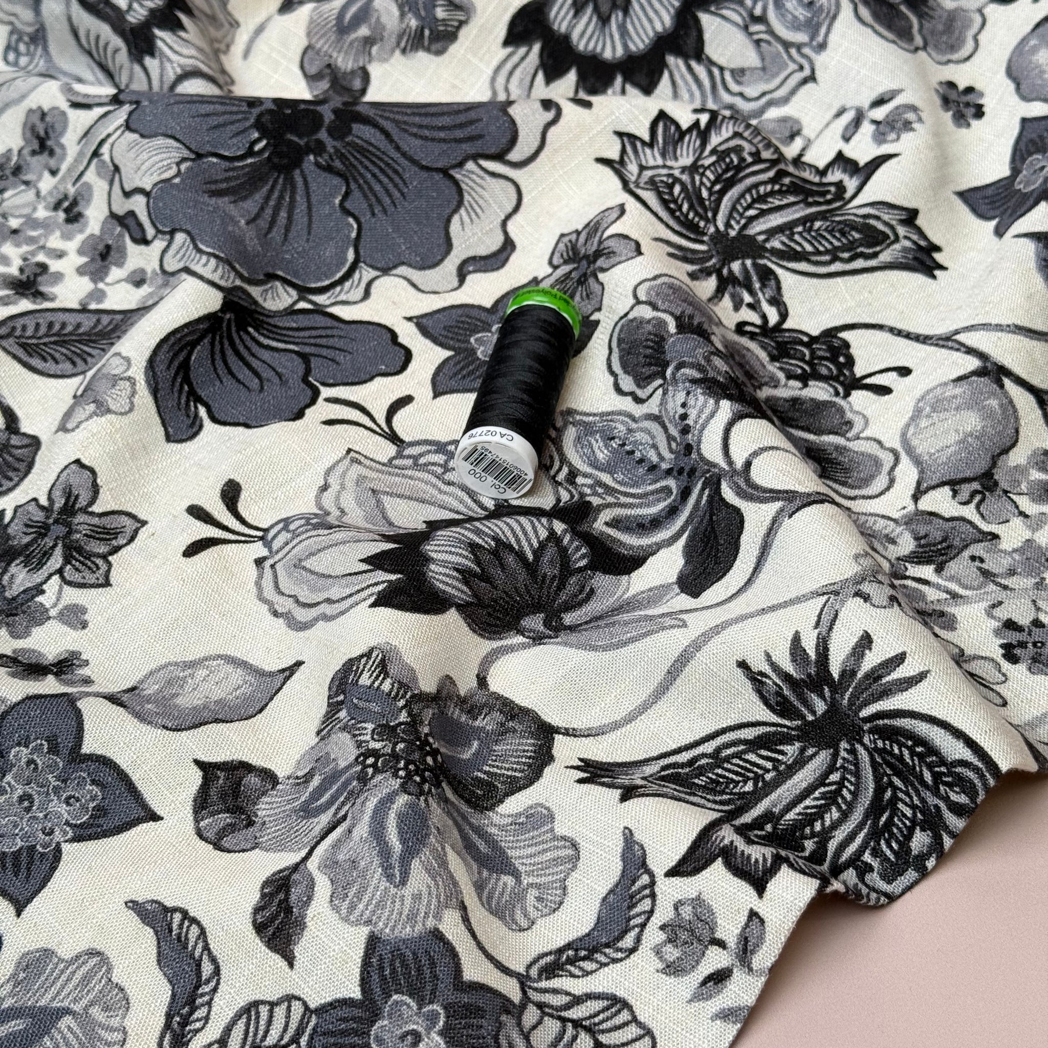 A beautiful viscose linen blend fabric with an elegant floral design in black and grey on a neutral off white background.