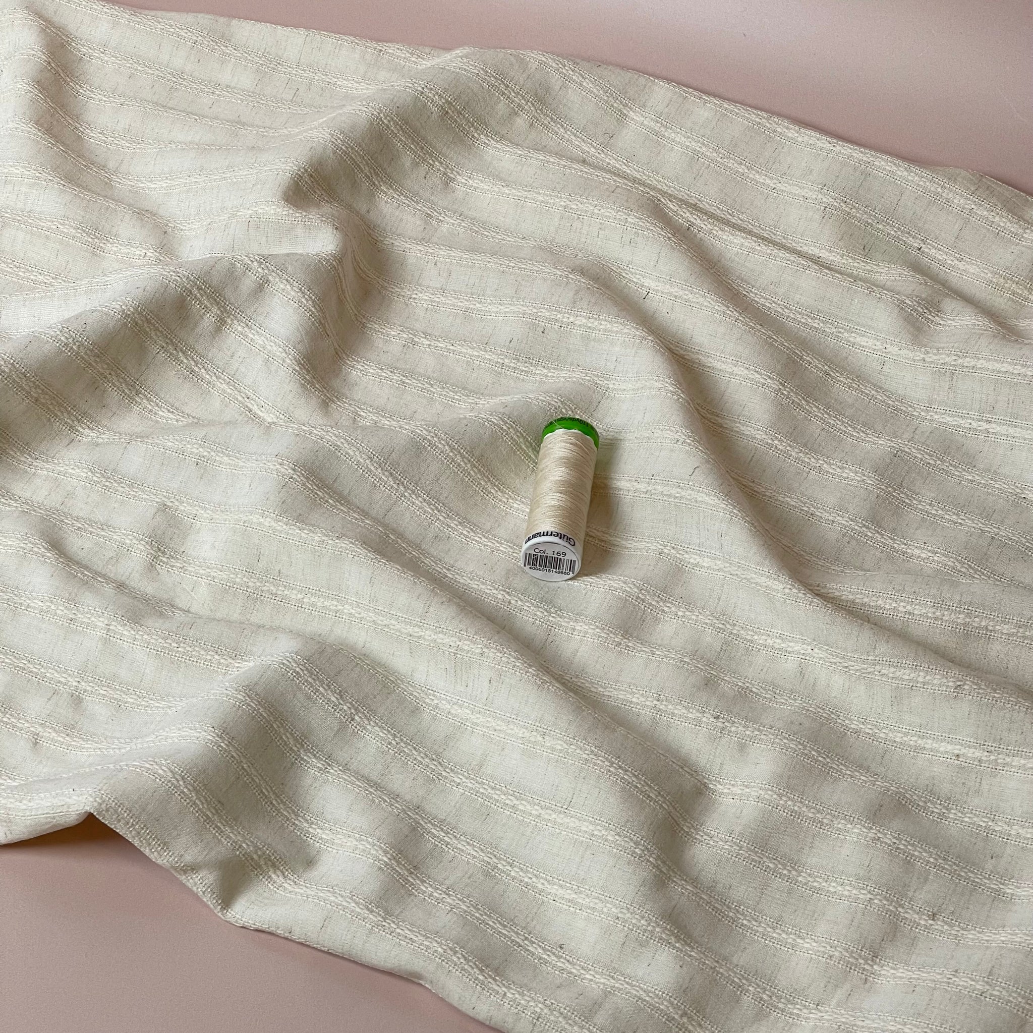 A beautiful, textured linen, viscose and cotton blend jacquard fabric with stripes woven into it. This fabric is ideal for dressmaking as it offers the best qualities of all fibres, the breathability of linen paired with the natural temperature regulating qualities of cotton. This fabric is soft with linen feel to it, and is a dream to sew with and to wear.