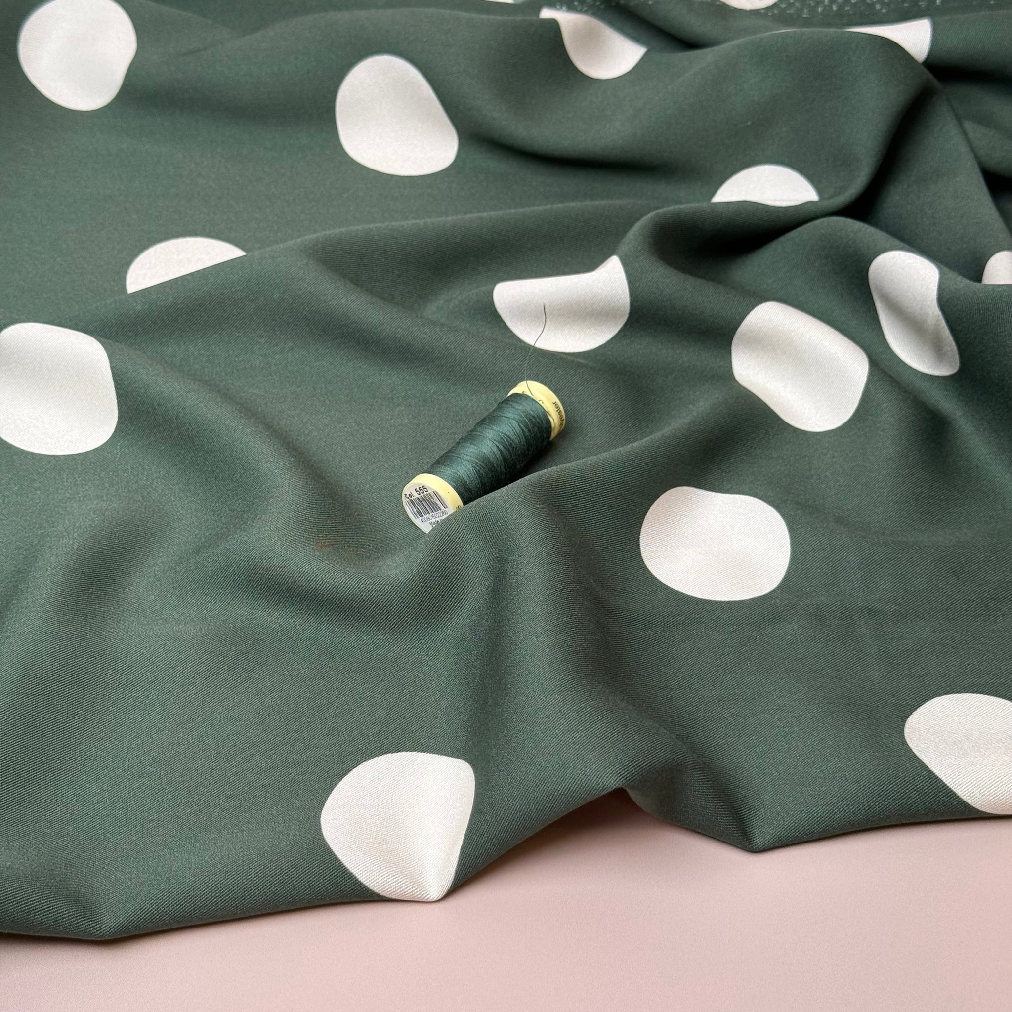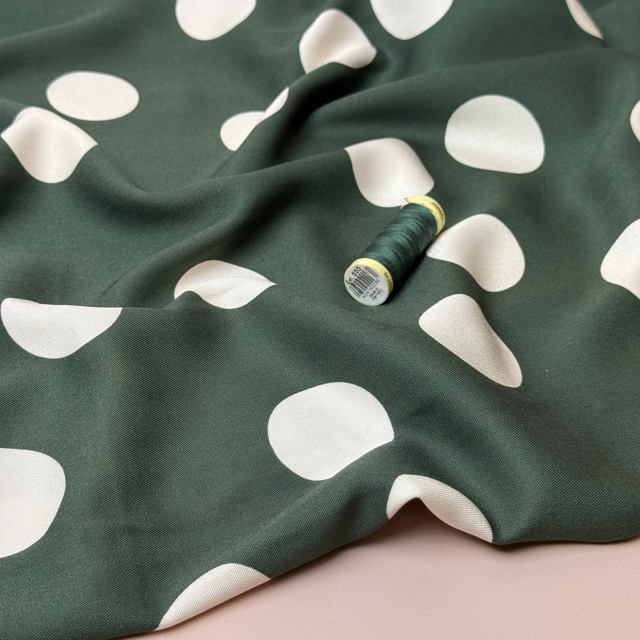 This soft and fluid viscose twill fabric features large dots on green background. It is soft with a fine, smooth twill weave and has a beautiful drape. This fabric is ideal for transitioning between seasons as it is lightweight and also has a little more weight than a lightweight viscose fabric.