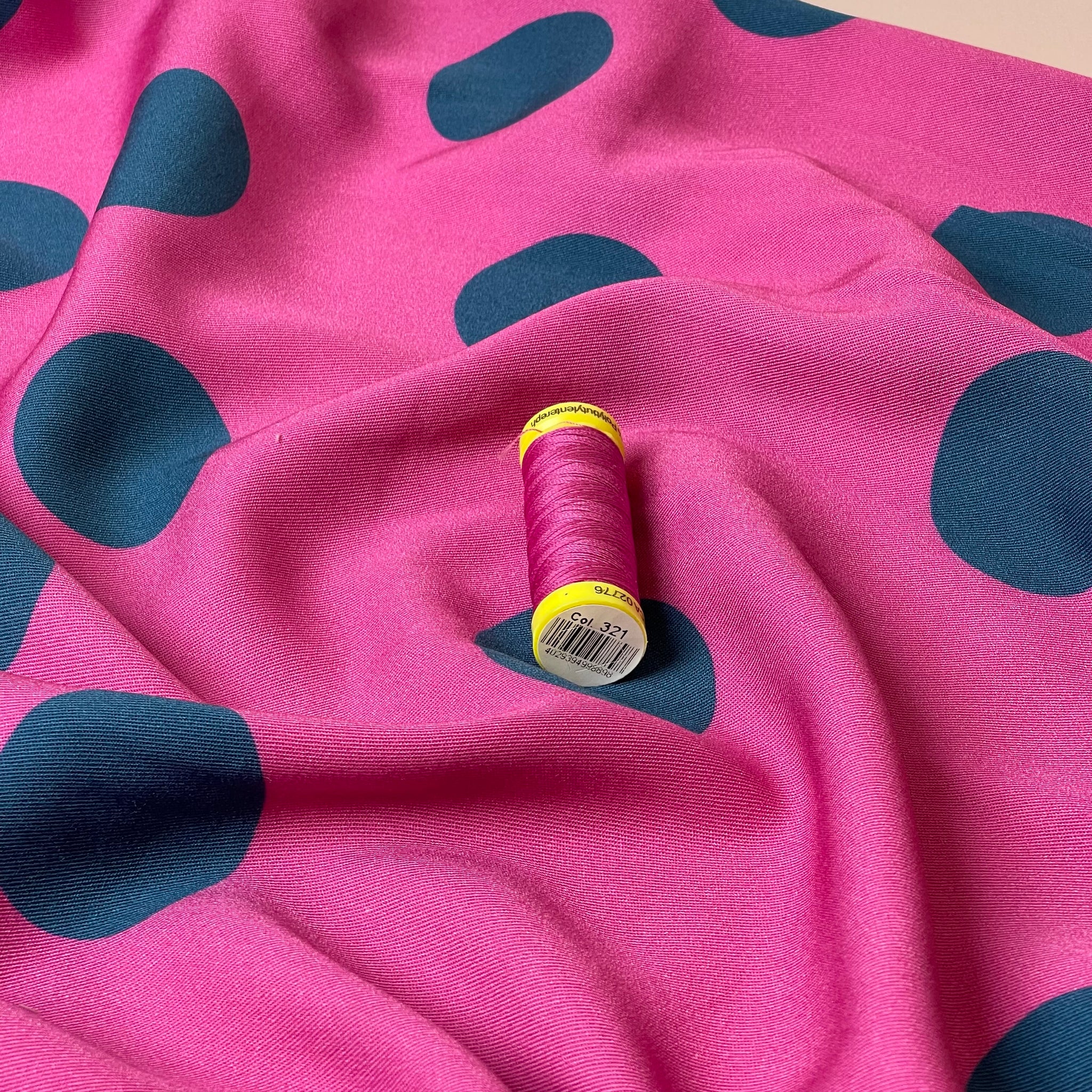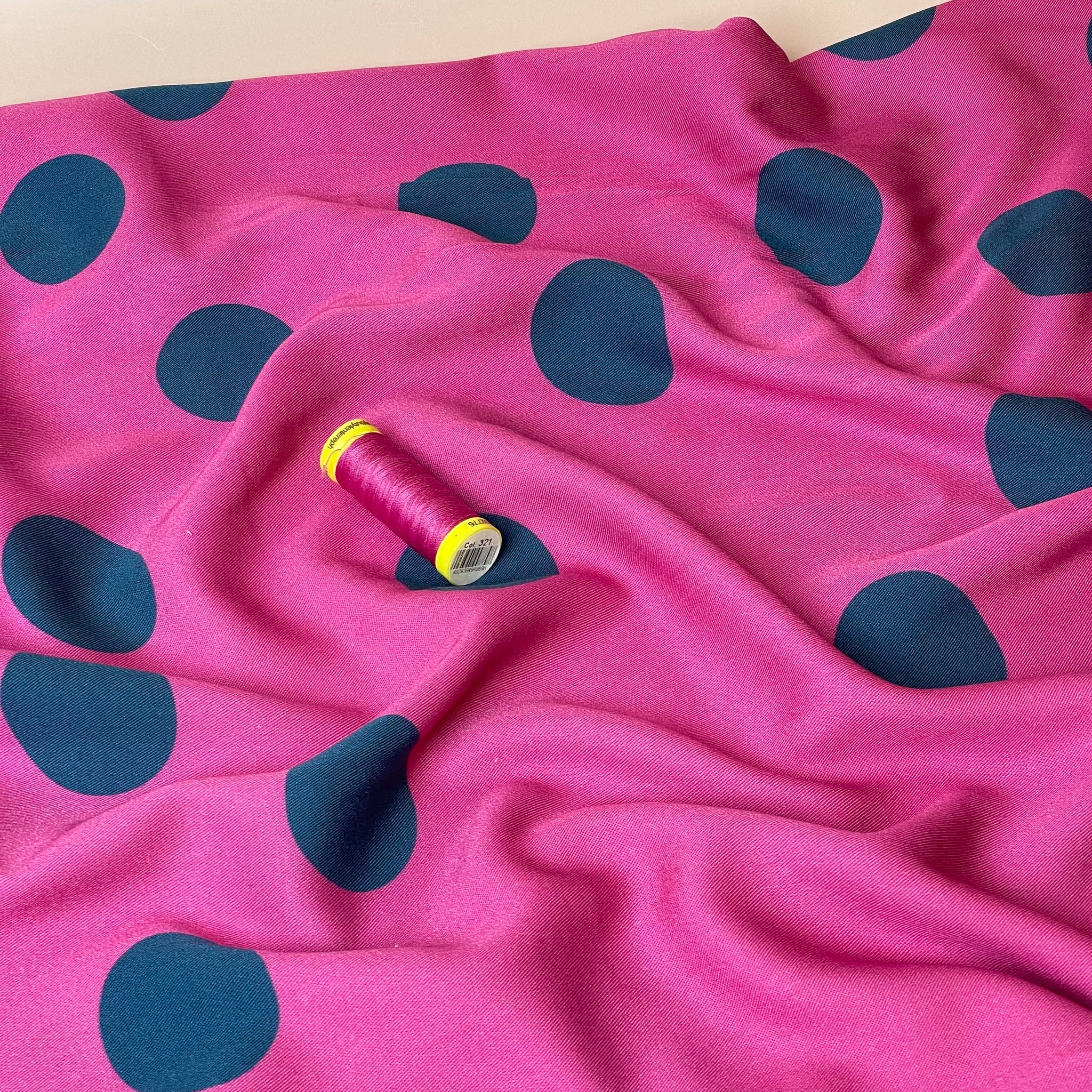 This soft and fluid viscose twill fabric features large scale polka dot design in blue on a pink background. It is soft with a fine, smooth twill weave and has a beautiful drape. This fabric is ideal for transitioning between seasons as it is lightweight and also has a little more weight than a lightweight viscose fabric.
