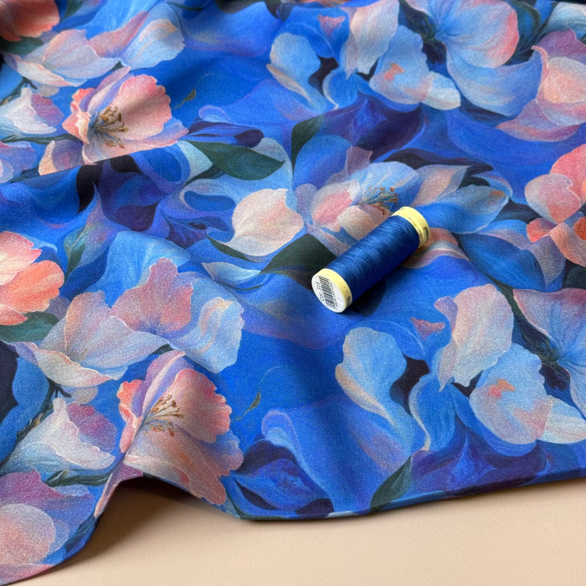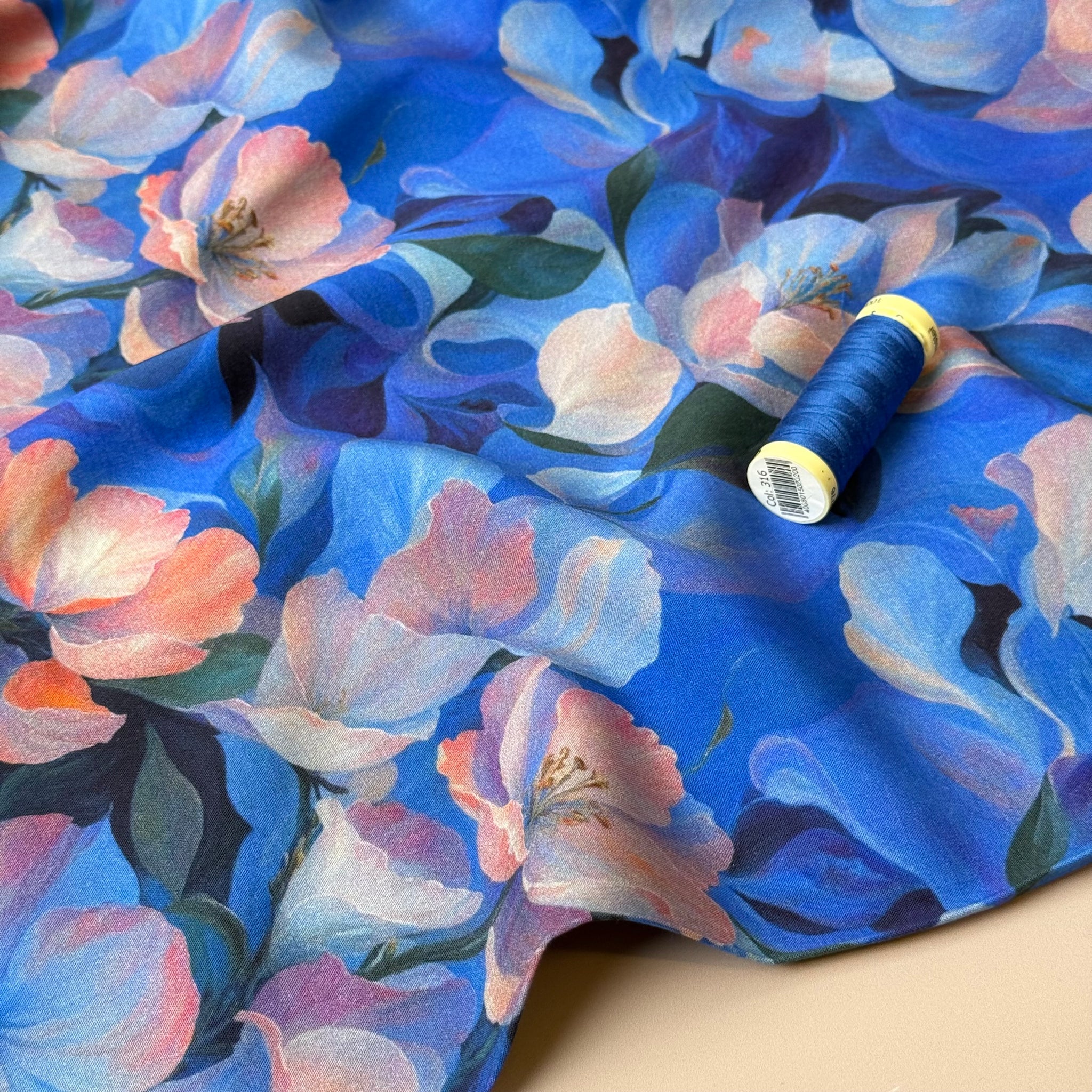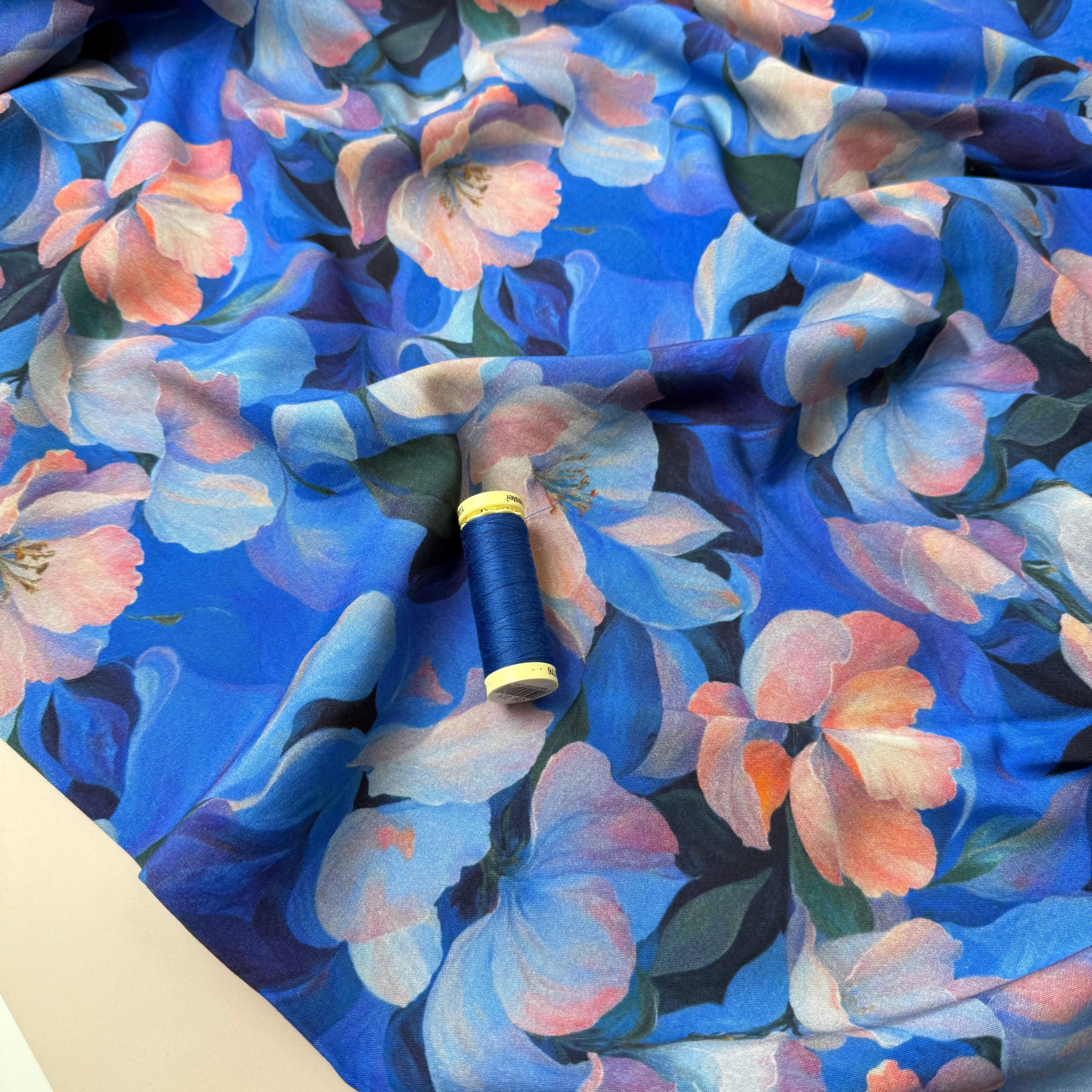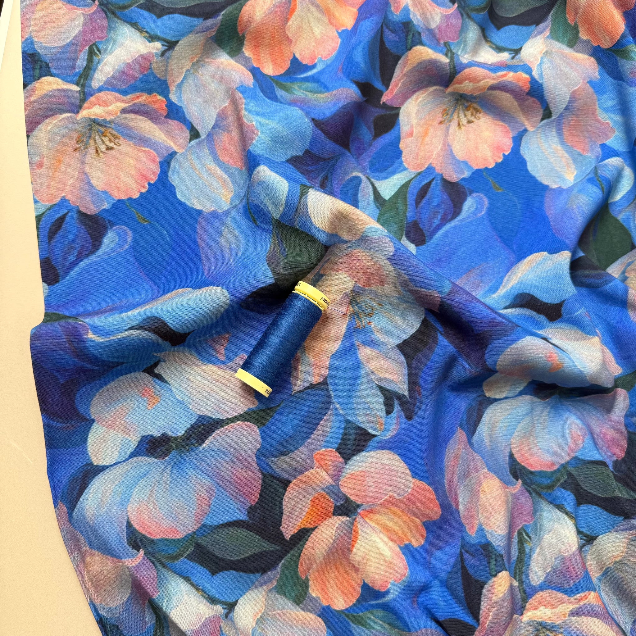 This fabric is high quality woven viscose twill fabric with a little stretch added to it for additional comfort. Beautiful watercolour blue flowers adorn the fabric, highlighted with pale pink and peach tones and accented with sporadic green foliage. The fabric feels and behaves exactly in the way as normal viscose twill with slightly more weight to it and added comfort from the little elastane in the fabric which makes it ideal fabric for making fitted garments, dresses, skirts and trousers a well as blouse and shirts.