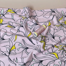 Beautiful and high quality Oeko Tex certified cotton jersey featuring elegant line drawing of lilies on a light lilac background. This fabric is cosy and comfortable and will bring you a lot of joy when sewing or wearing.