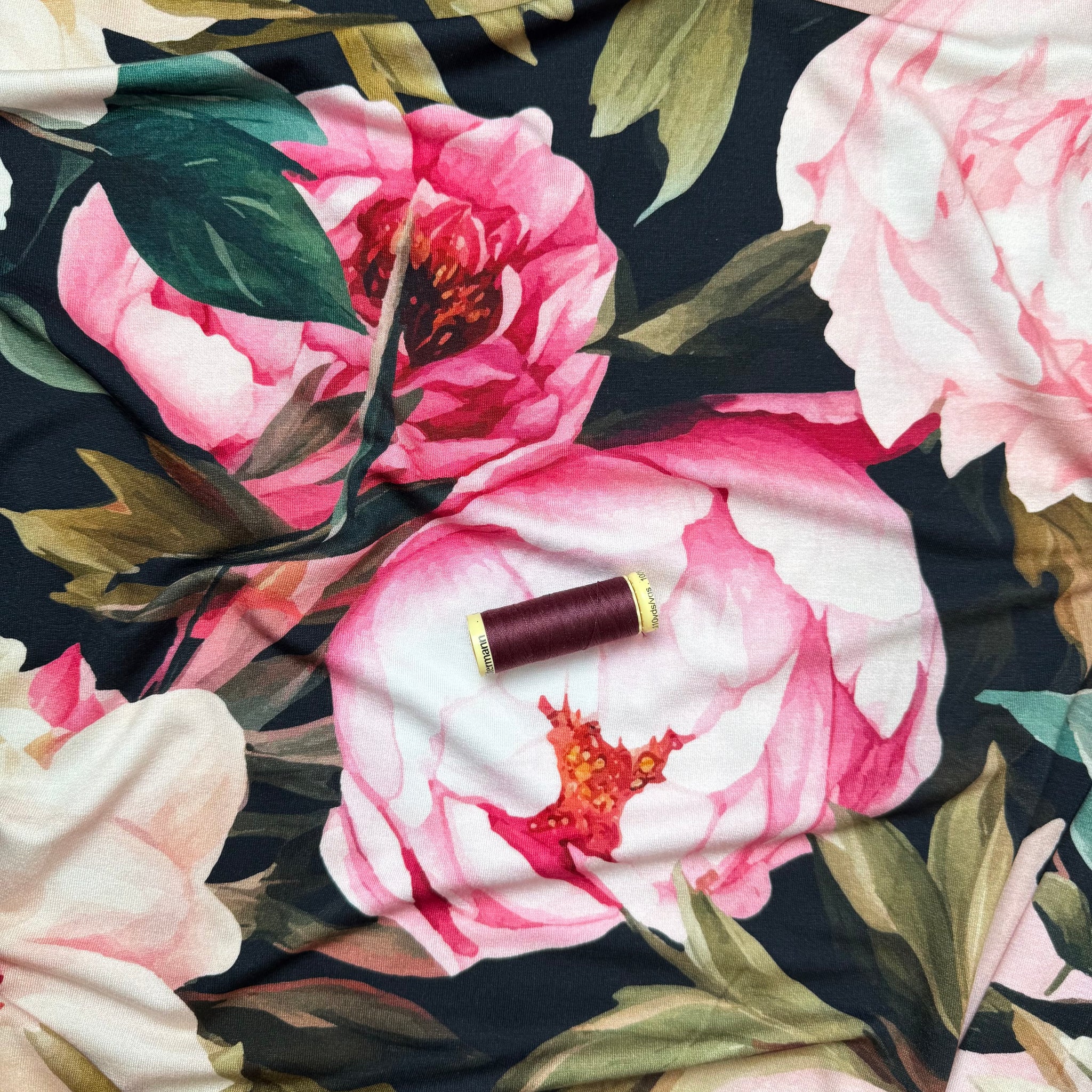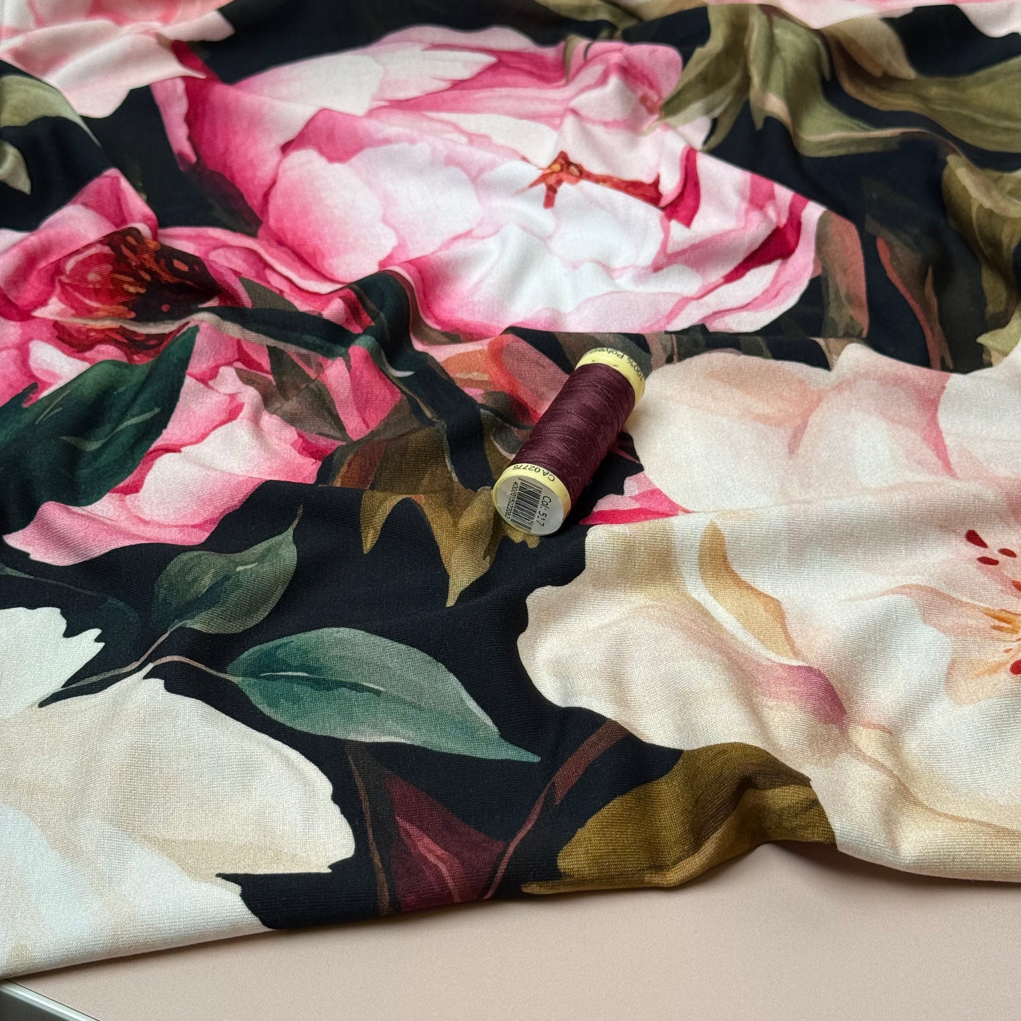 A truly unique and beautiful high quality viscose jersey from Denmark, featuring stunning large-scale flowers in shades of pinks on a black background.