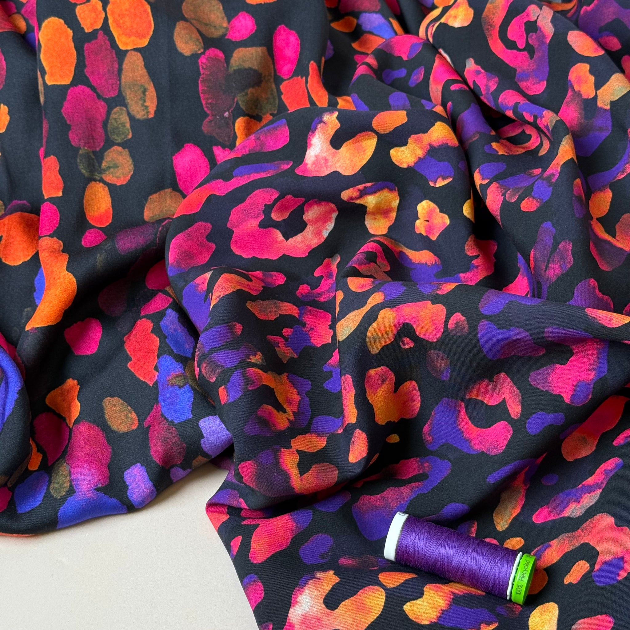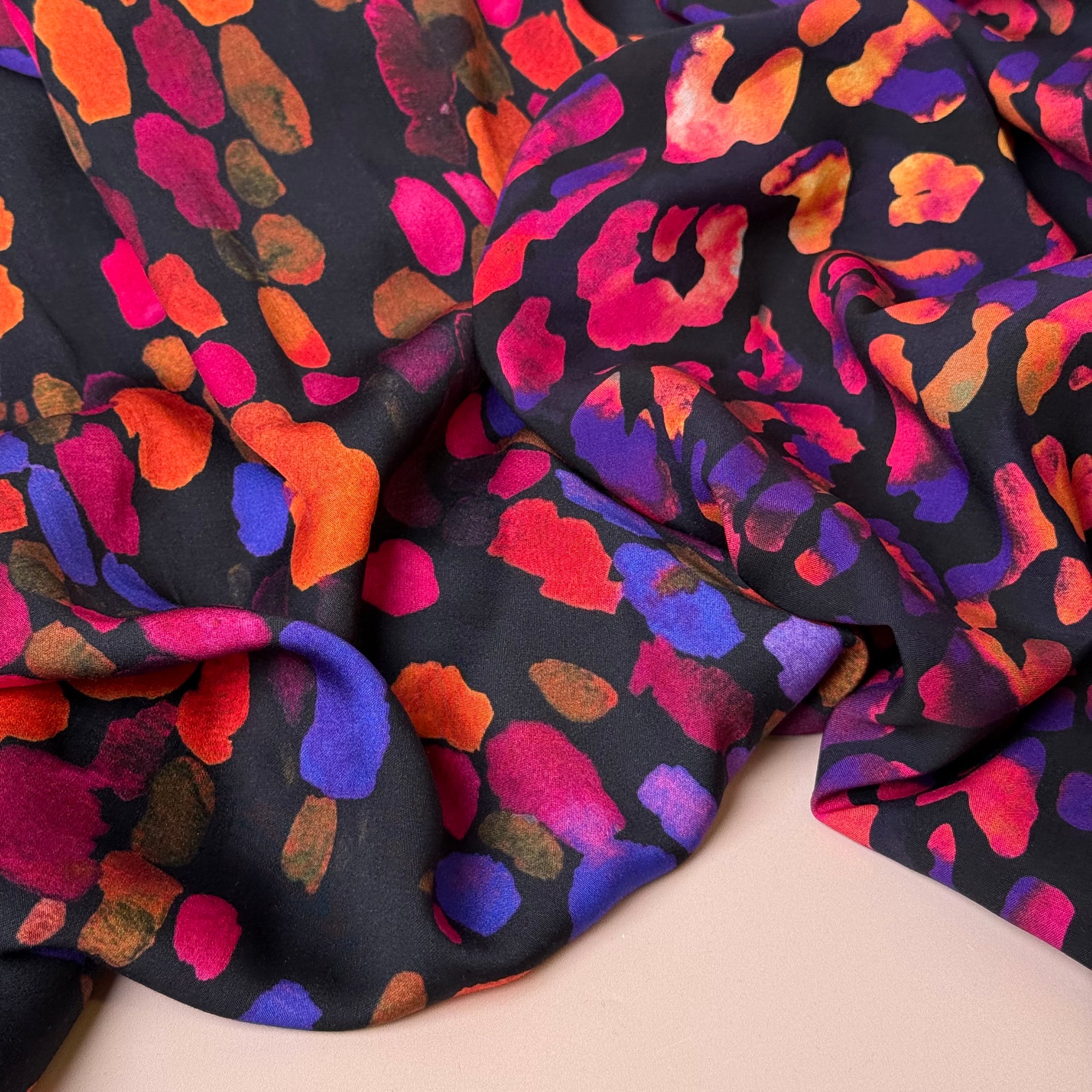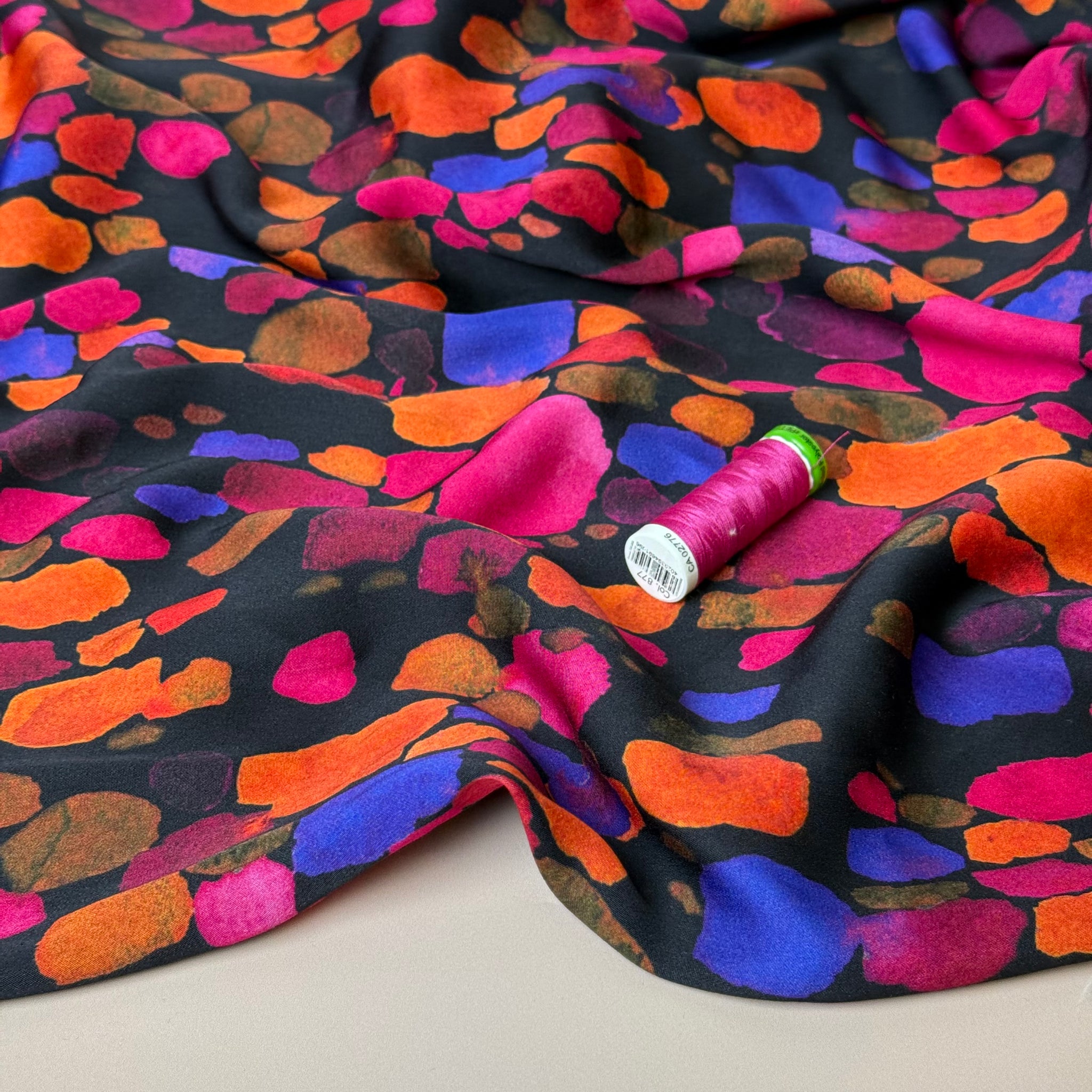 This stunning viscose fabric features an elegant abstract design vibrant shades magenta, orange and purple on a black background. It is lightweight and has the most pleasant handle, with smooth matte finish and beautiful drape.