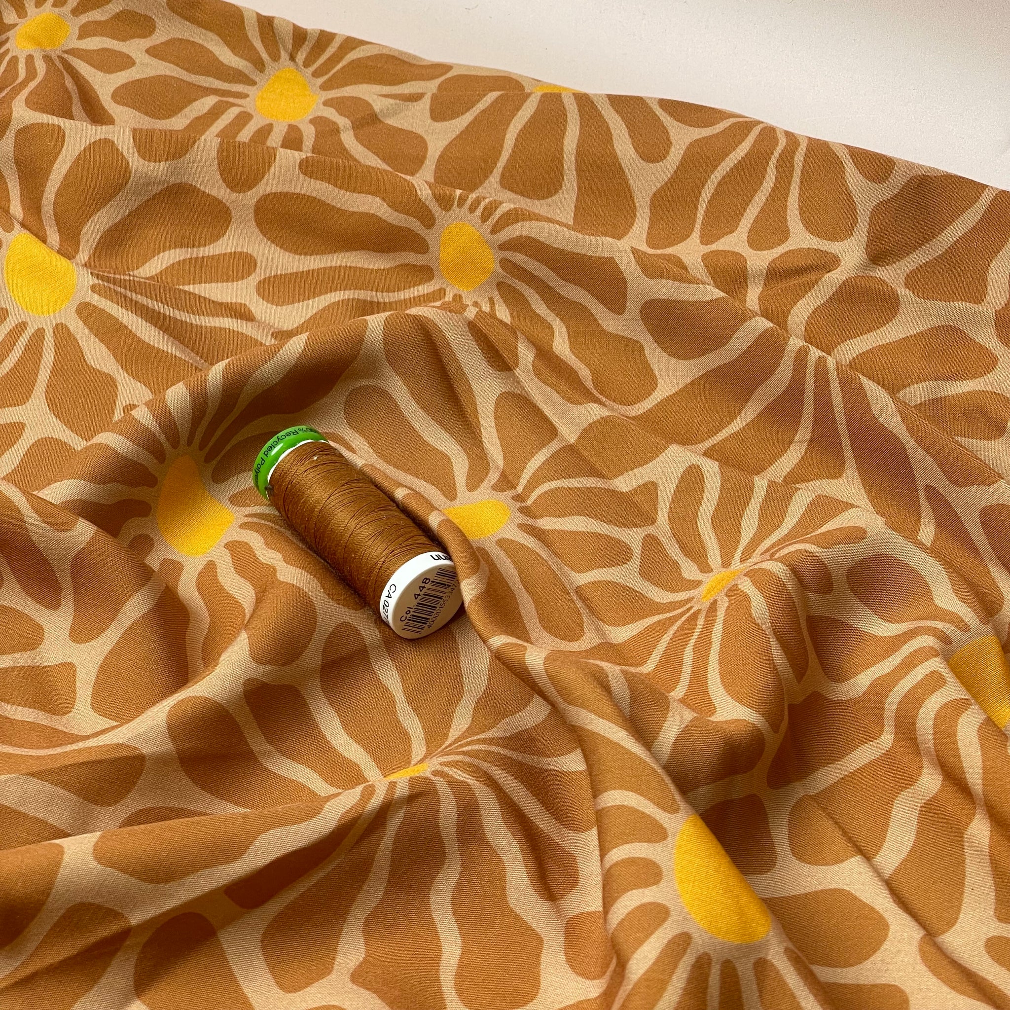 This stunning viscose poplin fabric features a graphic flower design in Carmel and beige, perfect for sewing blouses, swooshy dresses and loose trousers that can be worn all year round.