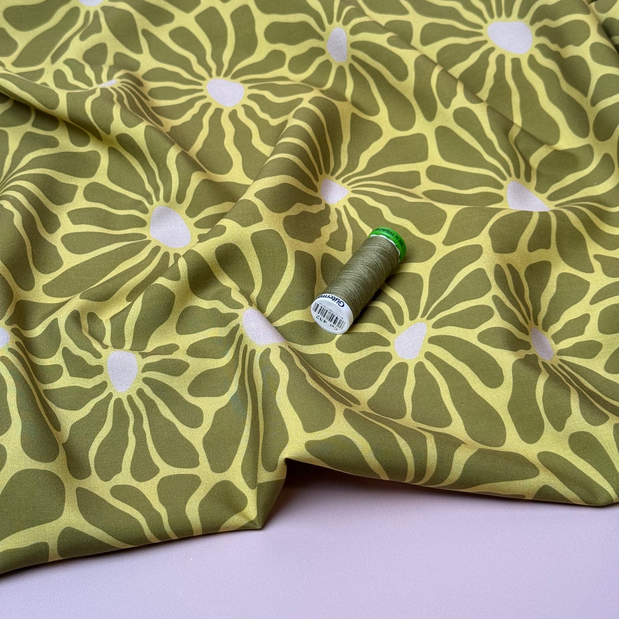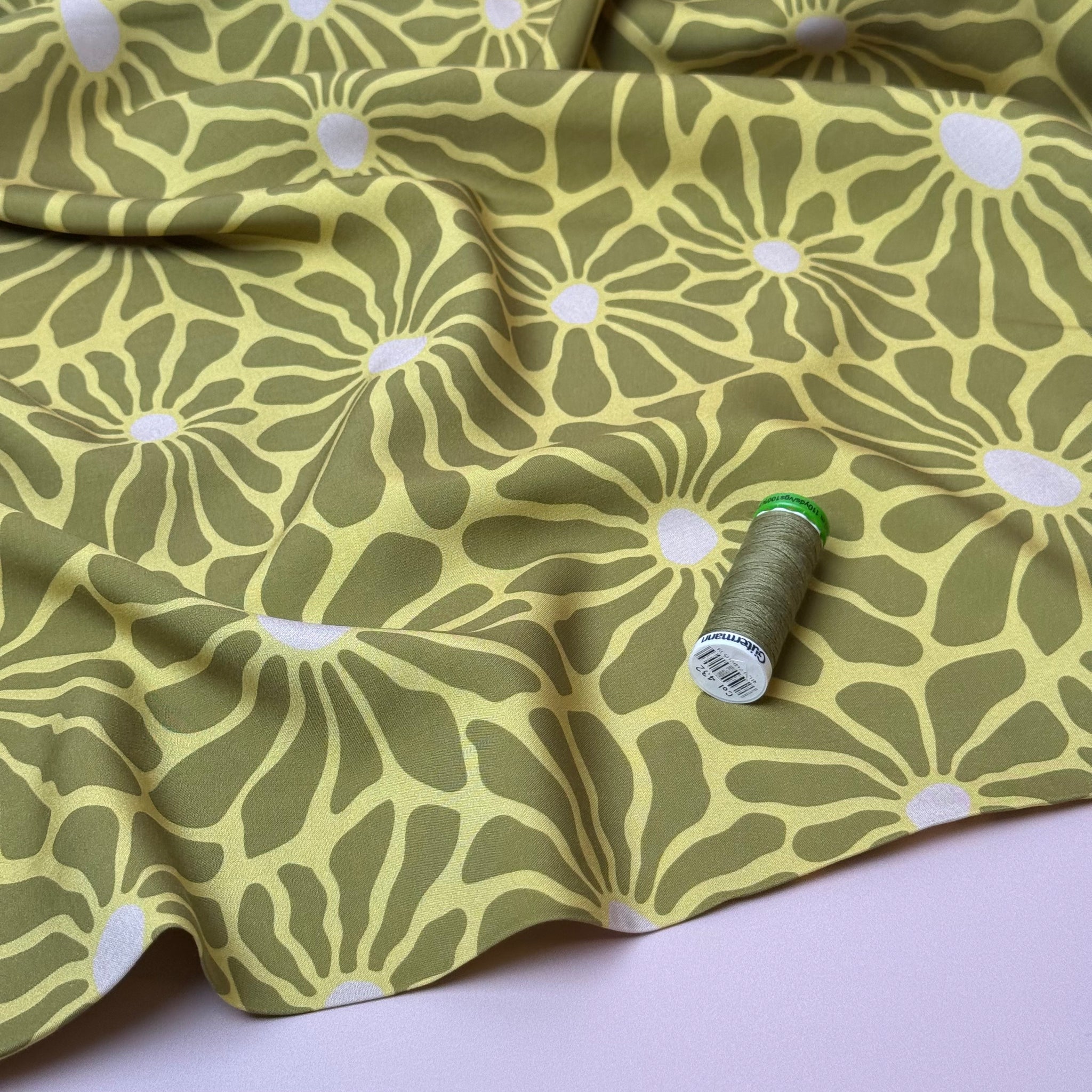 This stunning viscose poplin fabric features a graphic flower design in shades of green, perfect for sewing blouses, swooshy dresses and loose trousers that can be worn all year round.