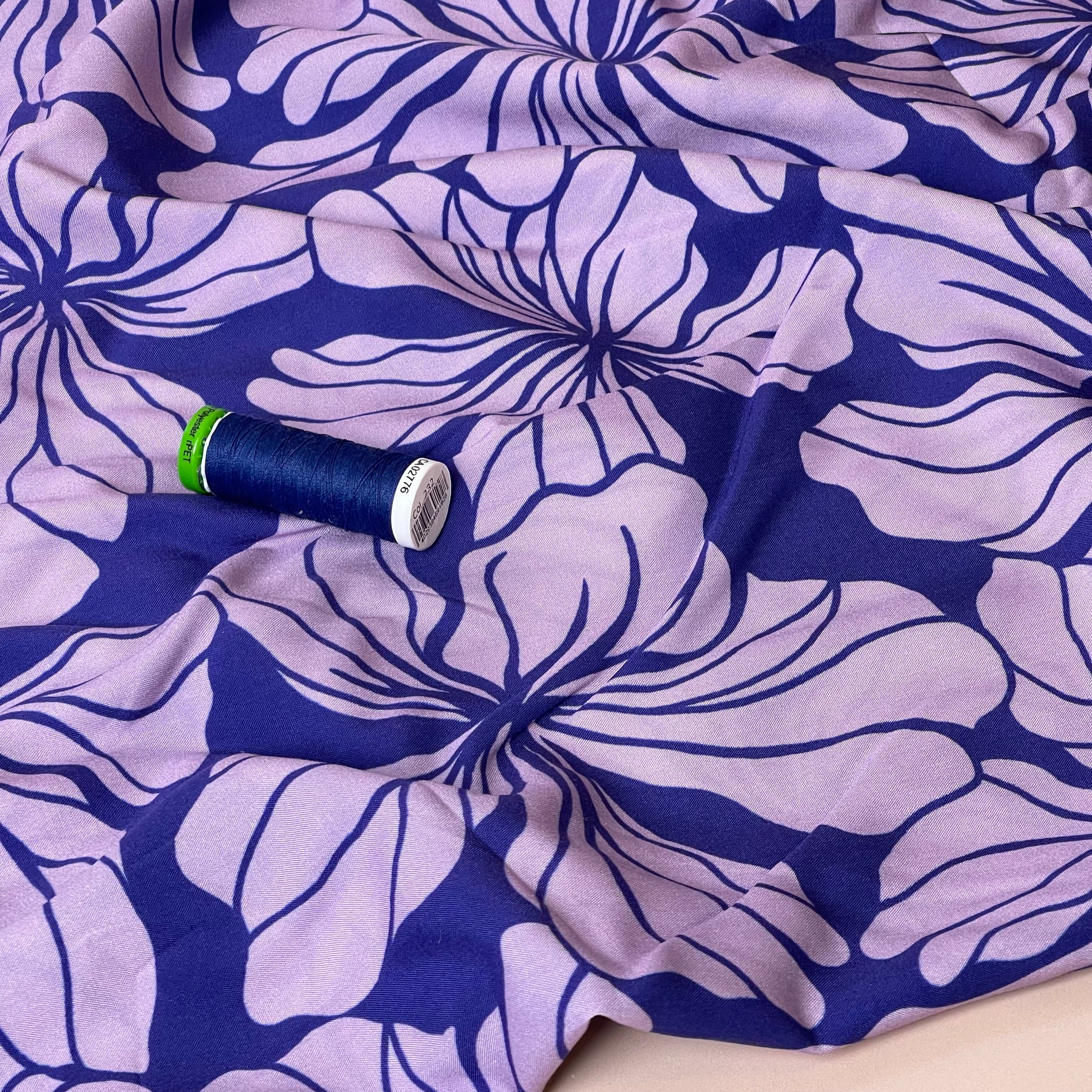 This high quality viscose fabric features graphic floral design in purple and lilac shades. It is lightweight and has the most pleasant handle, with silky soft hand finish and beautiful drape.