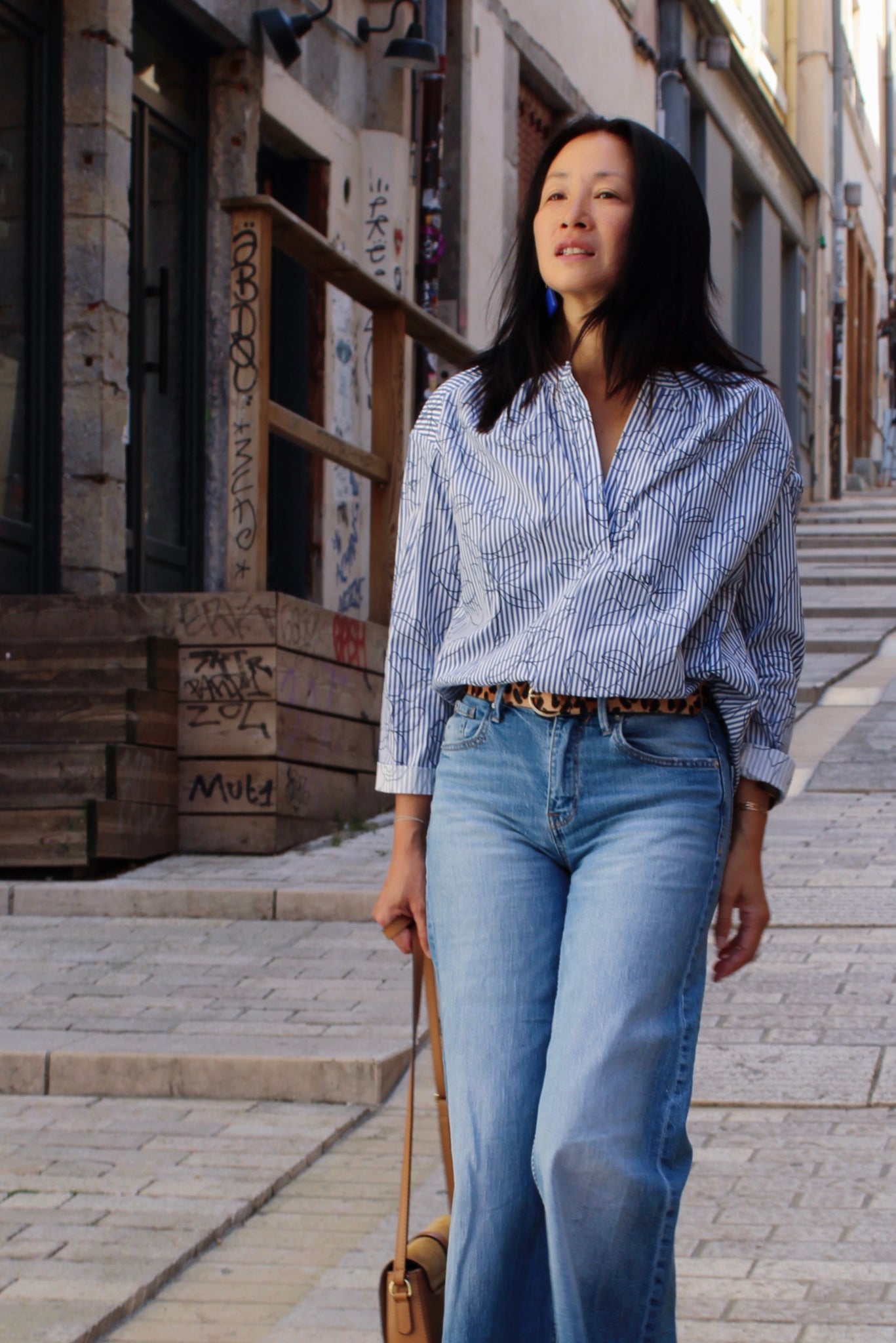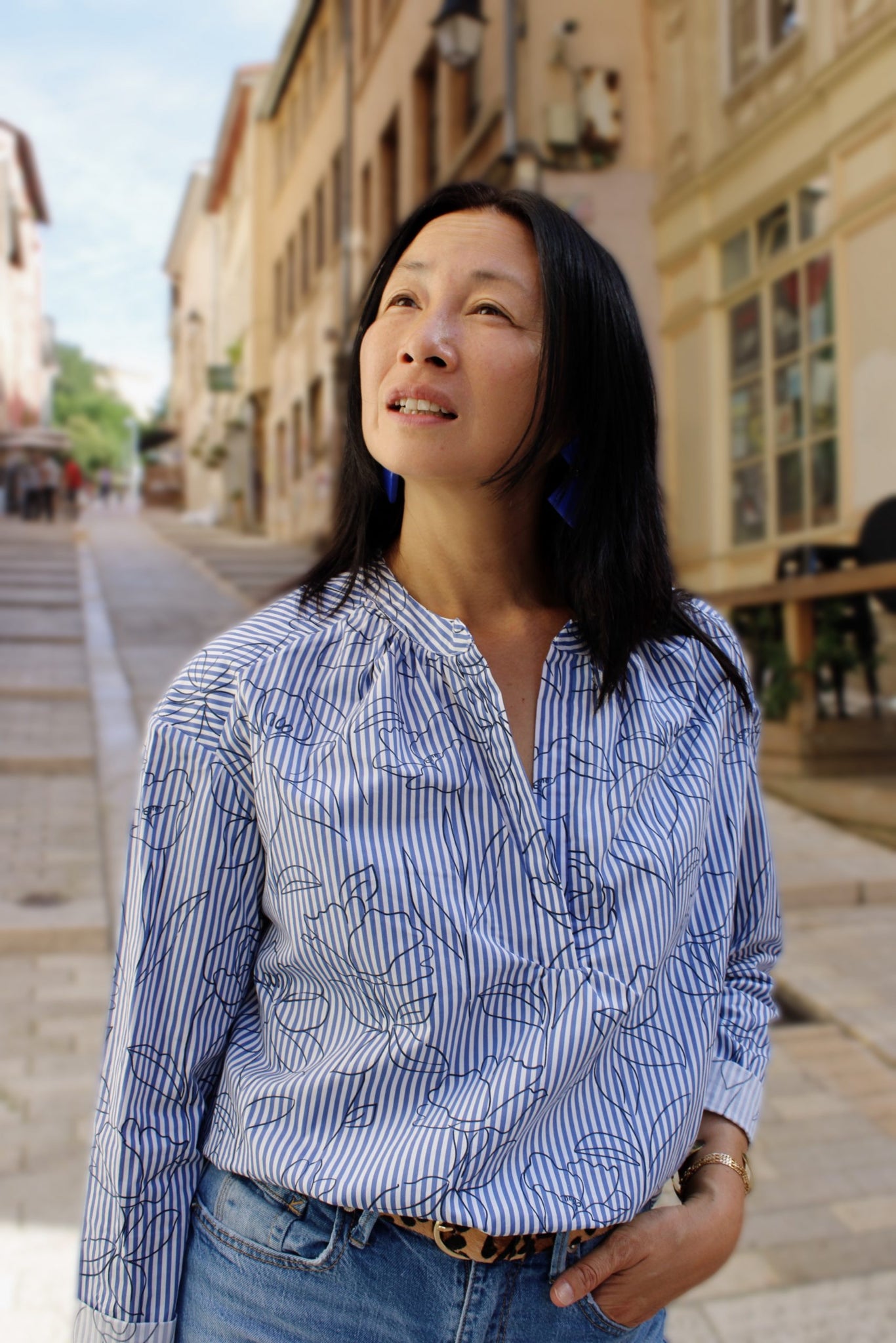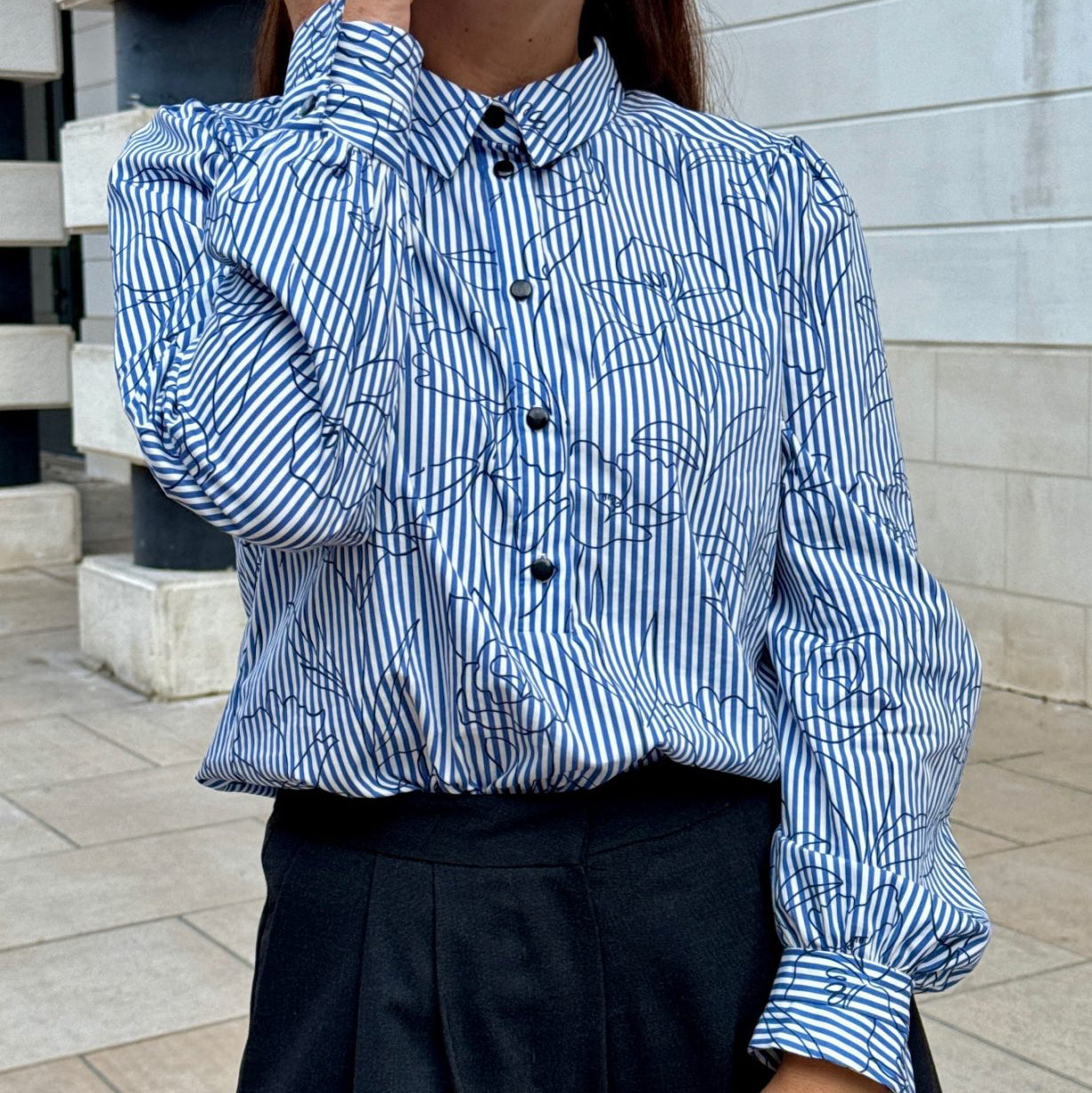 Reinvent the classic blue stripe with a delicate floral touch, featuring hand-sketched flowers. This slightly satiny 100% cotton fabric combines lightweight structure and comfort, perfect for chic and timeless creations.