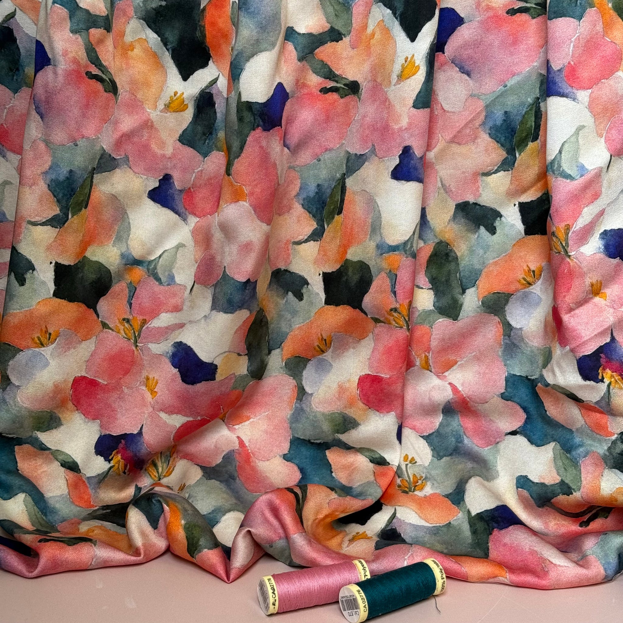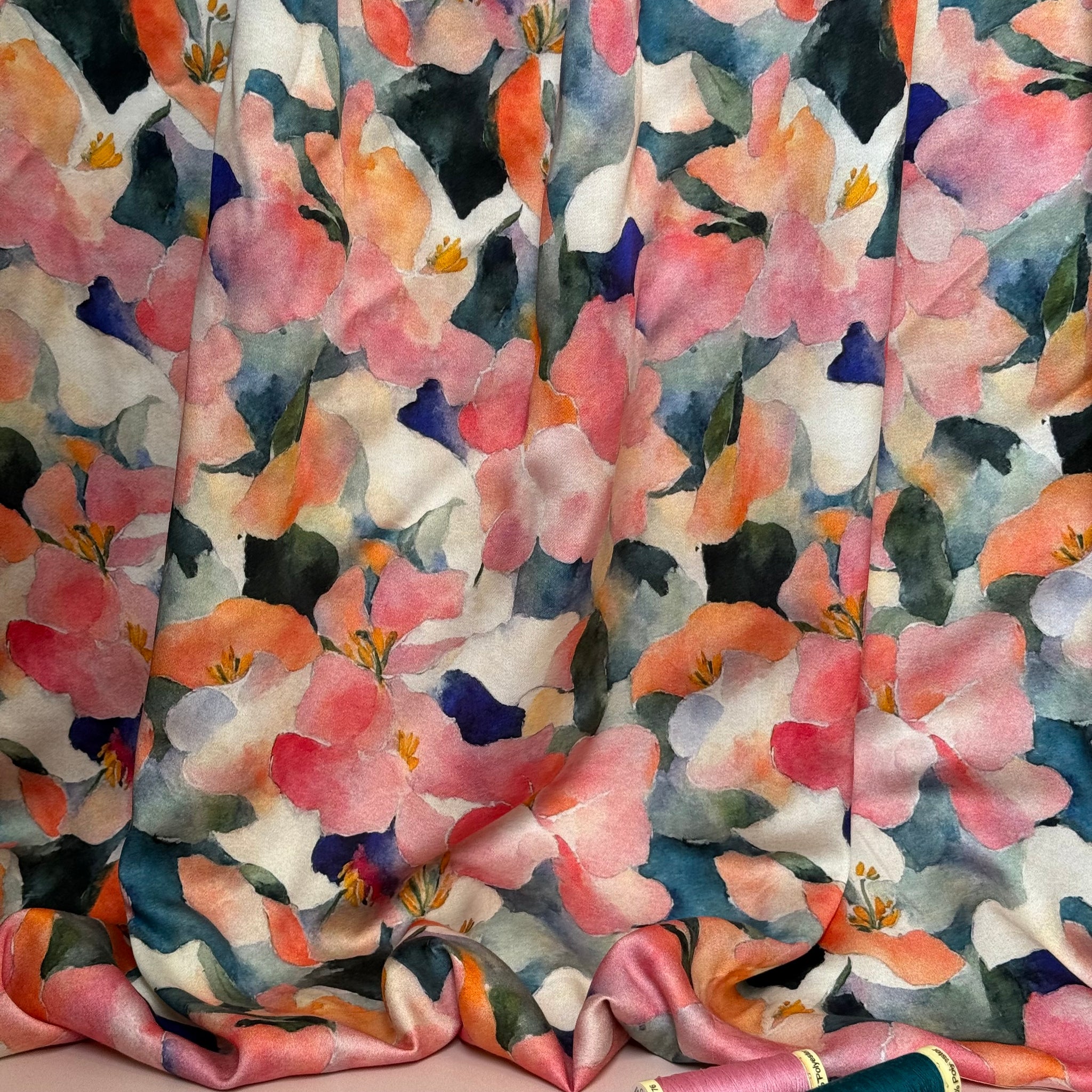 This stunning viscose fabric features painterly abstract floral design in coral, pink, clay pink, creamy white and green shades. It is lightweight and has the most pleasant handle, with smooth matte finish and beautiful drape.