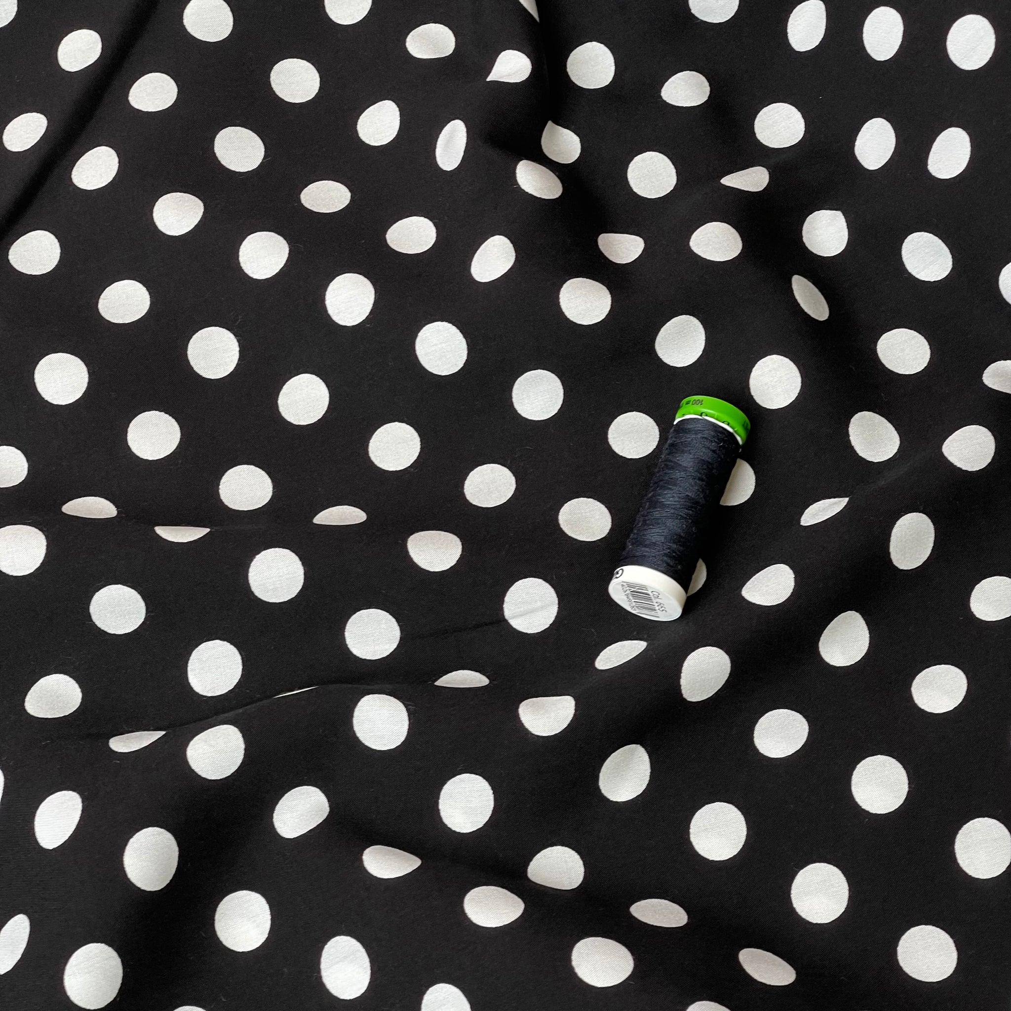 We are so pleased to be stocking this all time favourite, classic polka dot design on a viscose poplin fabric. The dots are white on black background, perfect for sewing blouses, swooshy dresses and loose trousers that can be worn all year round.