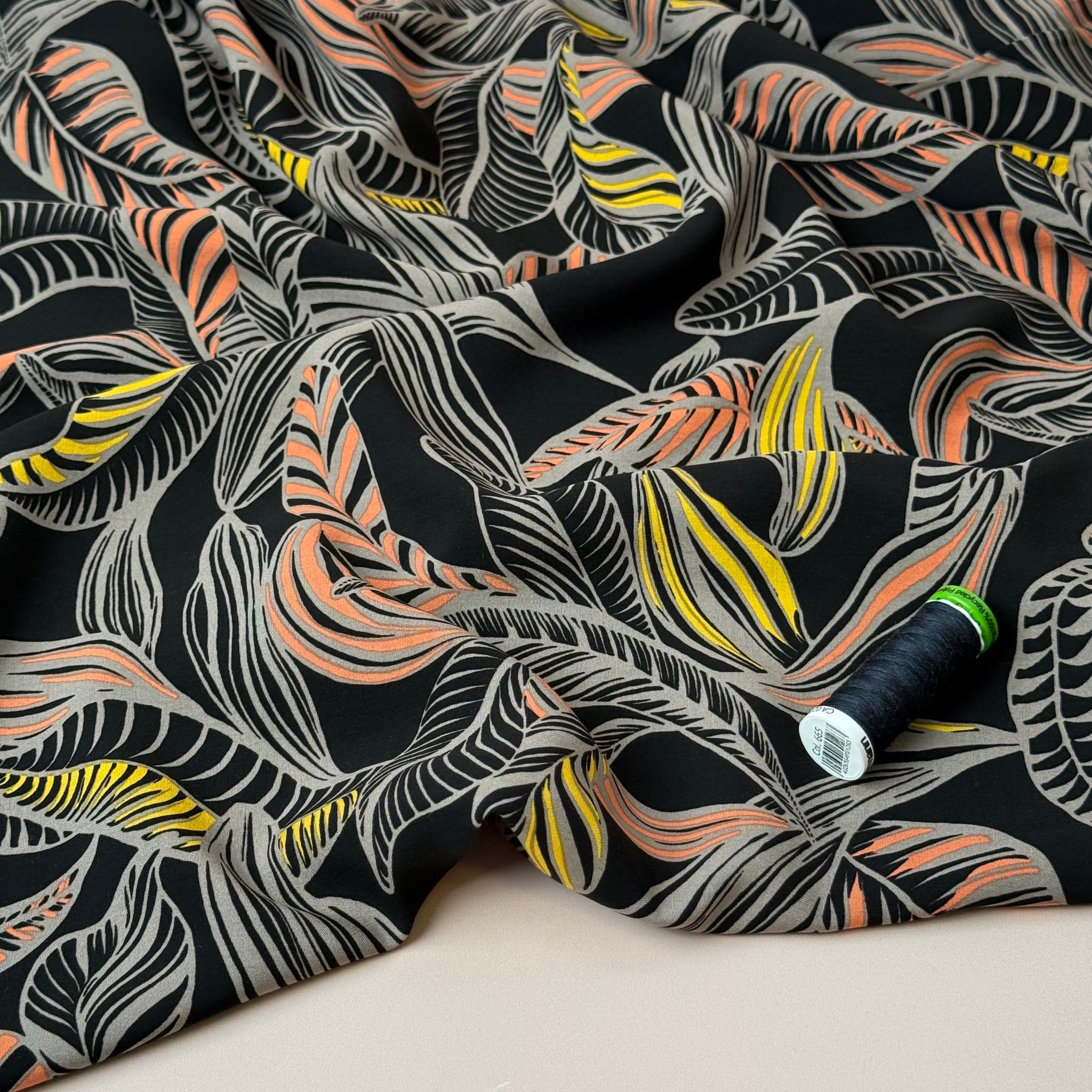 This fun and beautiful, high quality viscose fabric features line drawing of leaves in taupe on a black background with orange and yellow accents. It is lightweight and soft to touch with beautiful drape, perfect for summer dresses, blouses and skirts.