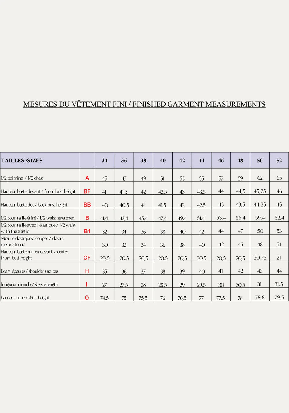 - A 2 cm wide elastic band (from 30 cm to 51 cm, the quantities are indicated in slide 4 of this product sheet, in the finish garment measurements board)