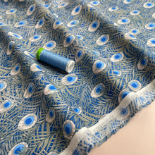 A beautiful and high quality lightweight cotton lawn fabric featuring a stunning peacock feather print in shades of blue and beige. This fabric is ideal for dressmaking as it offers the great qualities of breath-ability of cotton, is a dream to sew with and to wear.