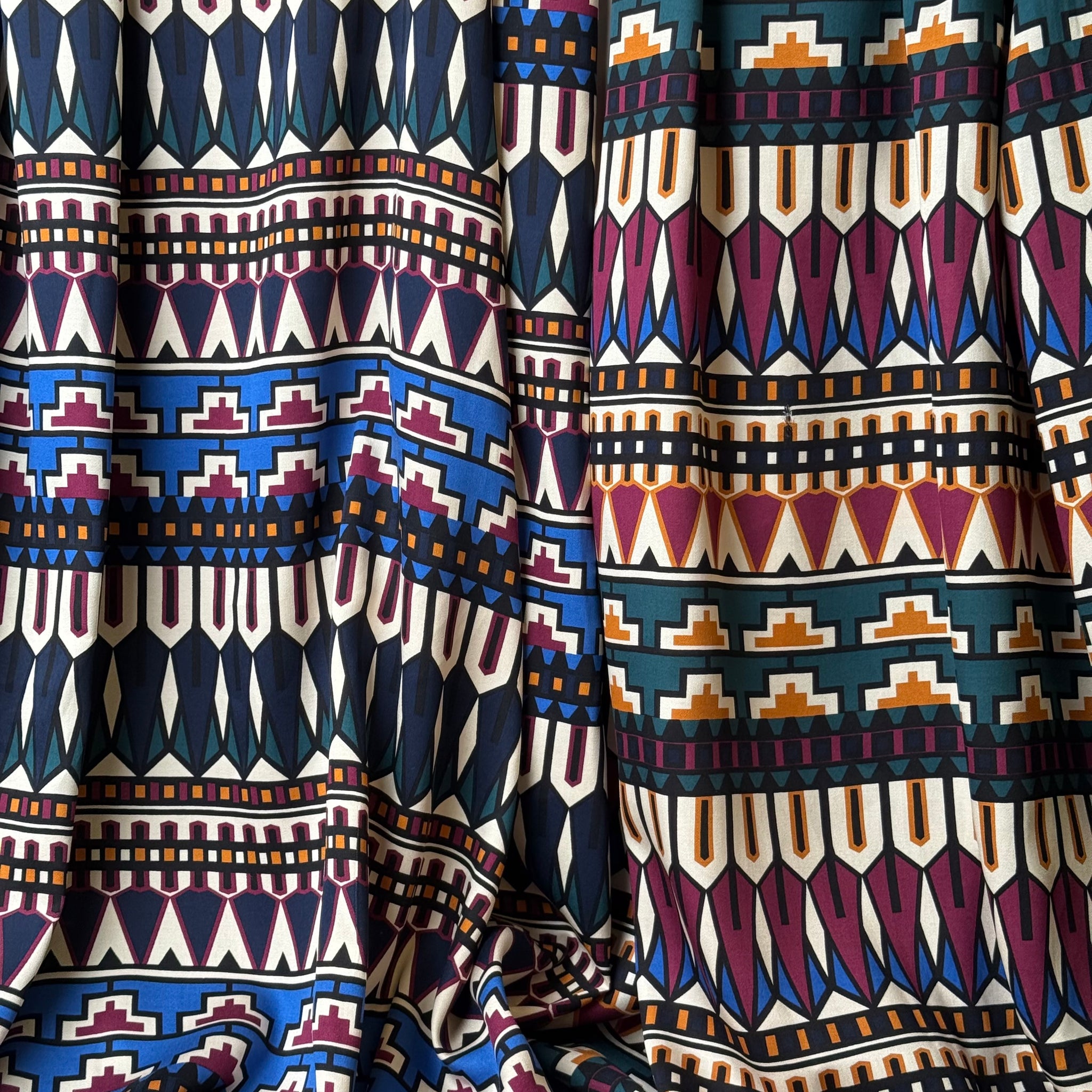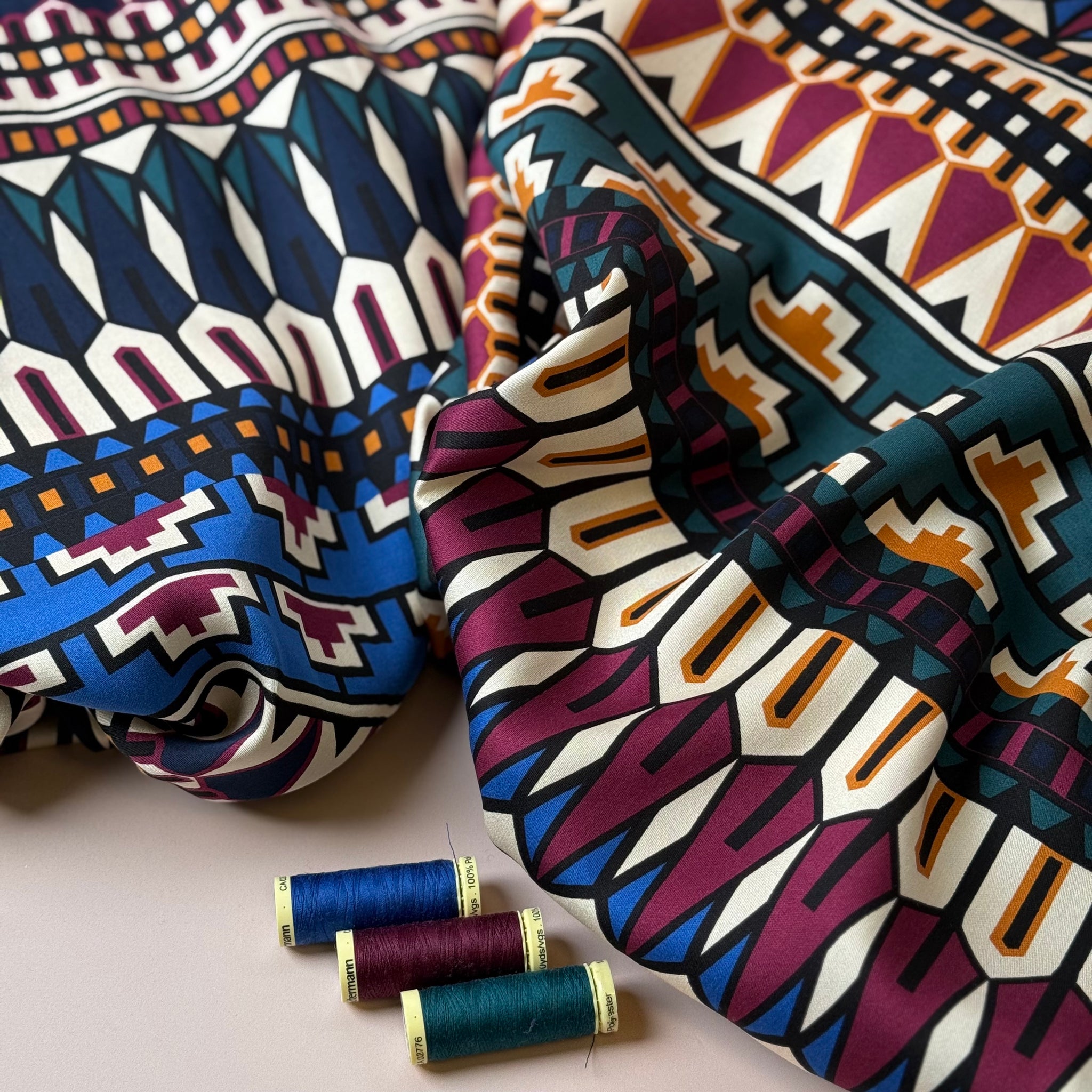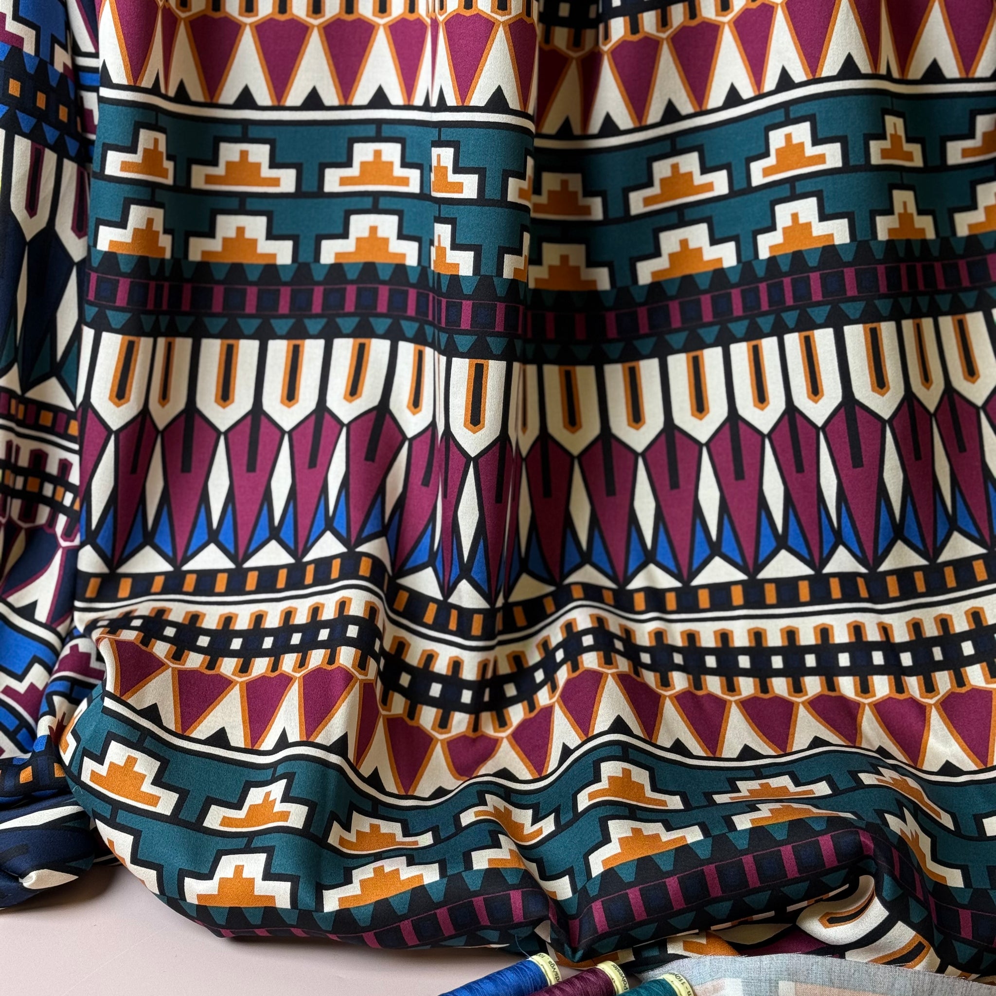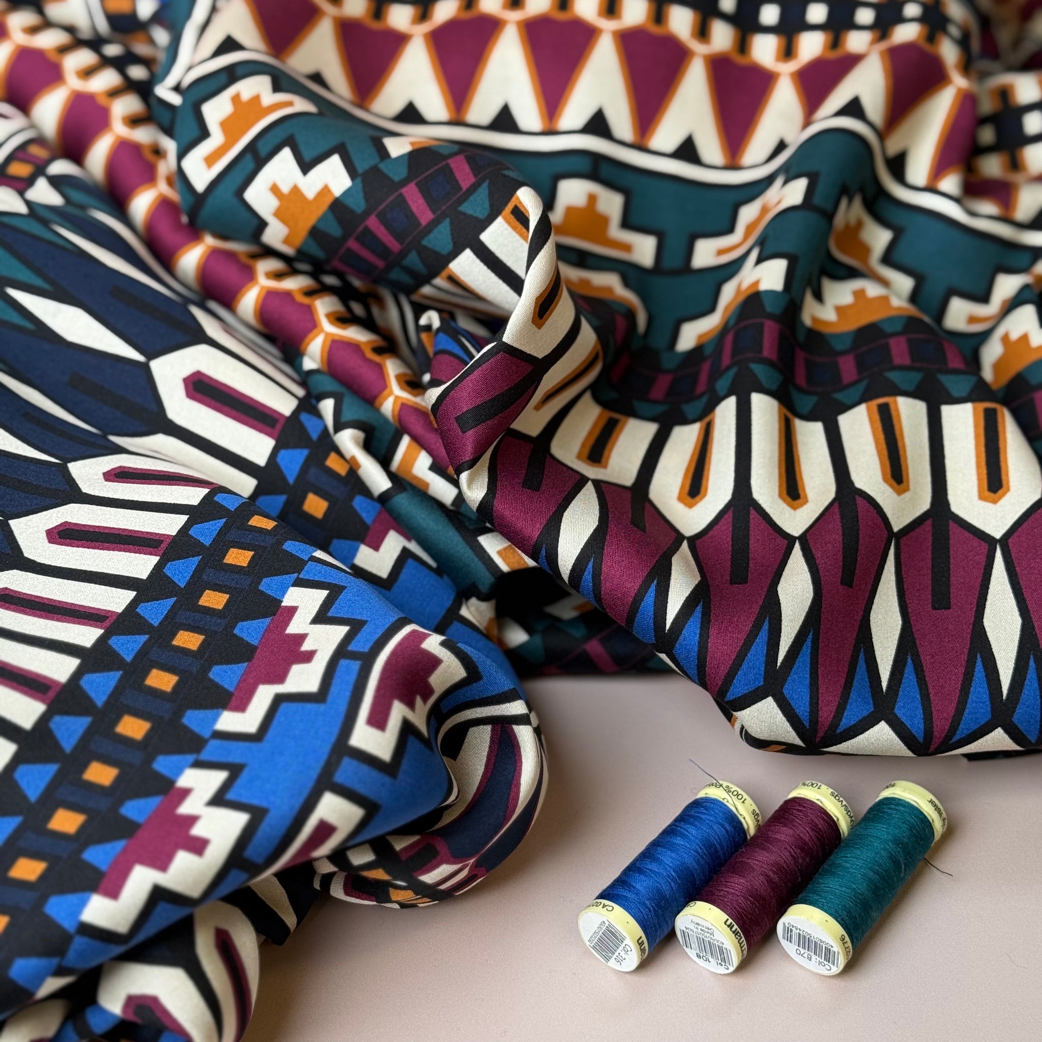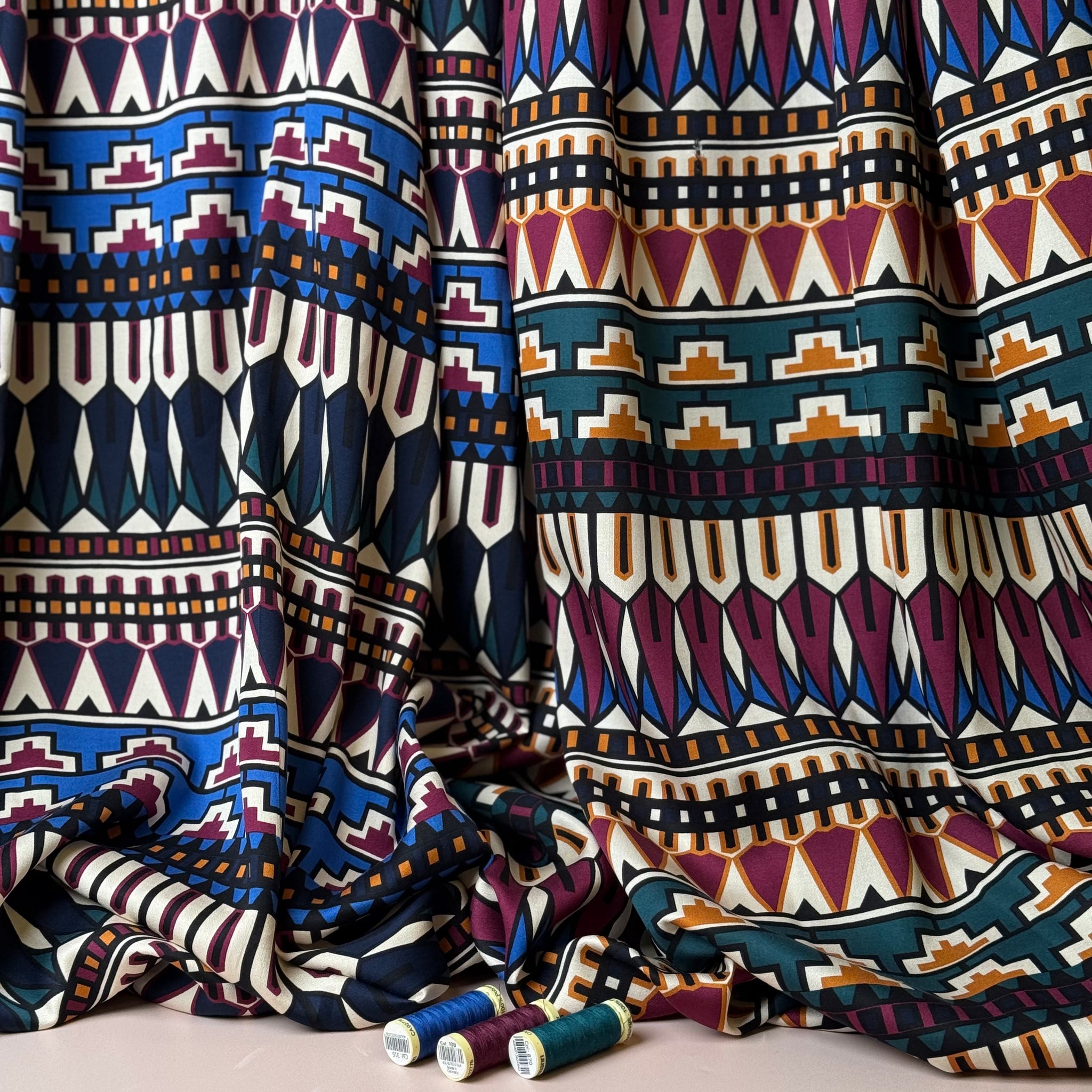 This joyous high quality viscose fabric features stunning geometric design in rich autumnal jewel tones. It has a little more weight than usual viscose fabric and a wonderful drape, it has the most pleasant sateen finish, with matte, peachy soft touch. It is perfect for making autumn / winter blouses and dresses.