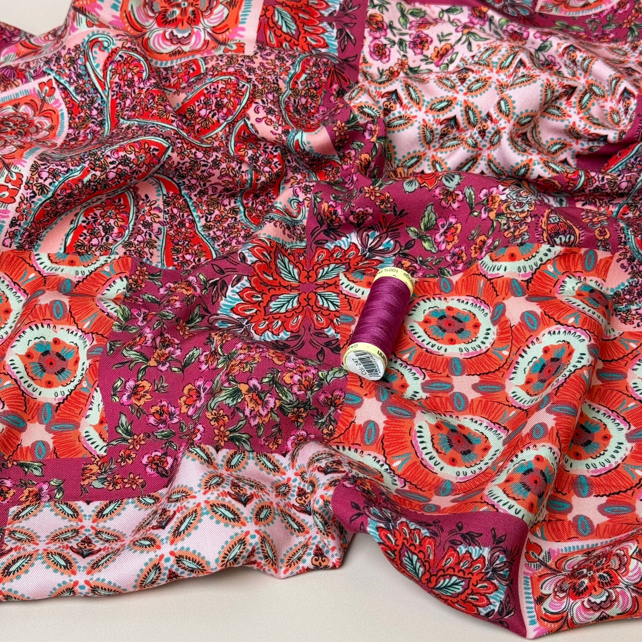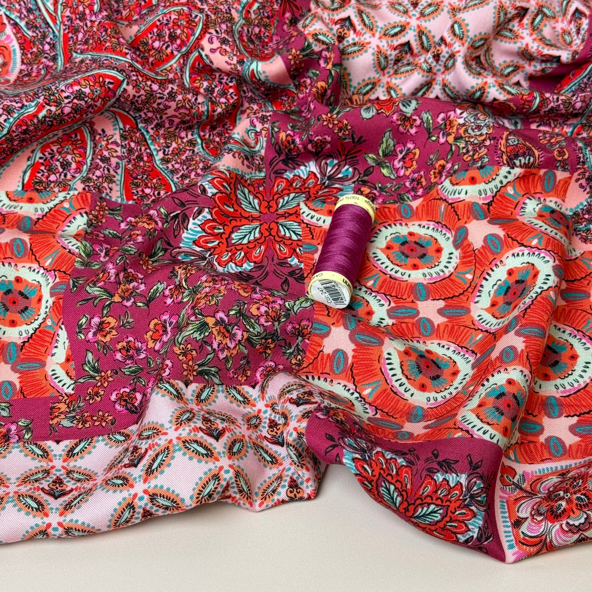 This beautiful viscose twill fabric features beautiful vintage floral patchwork design in the shades of berry and pink with orange and aqua blue accents. It is soft with a fine, smooth twill weave and has a beautiful drape. This fabric is ideal for transitioning between seasons as it is lightweight and also has a little more weight than a lightweight viscose fabric.