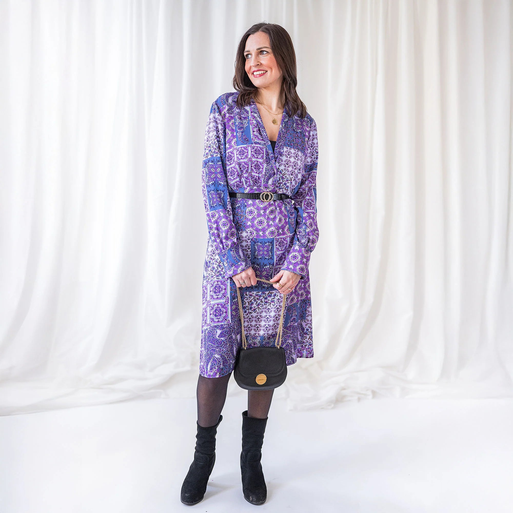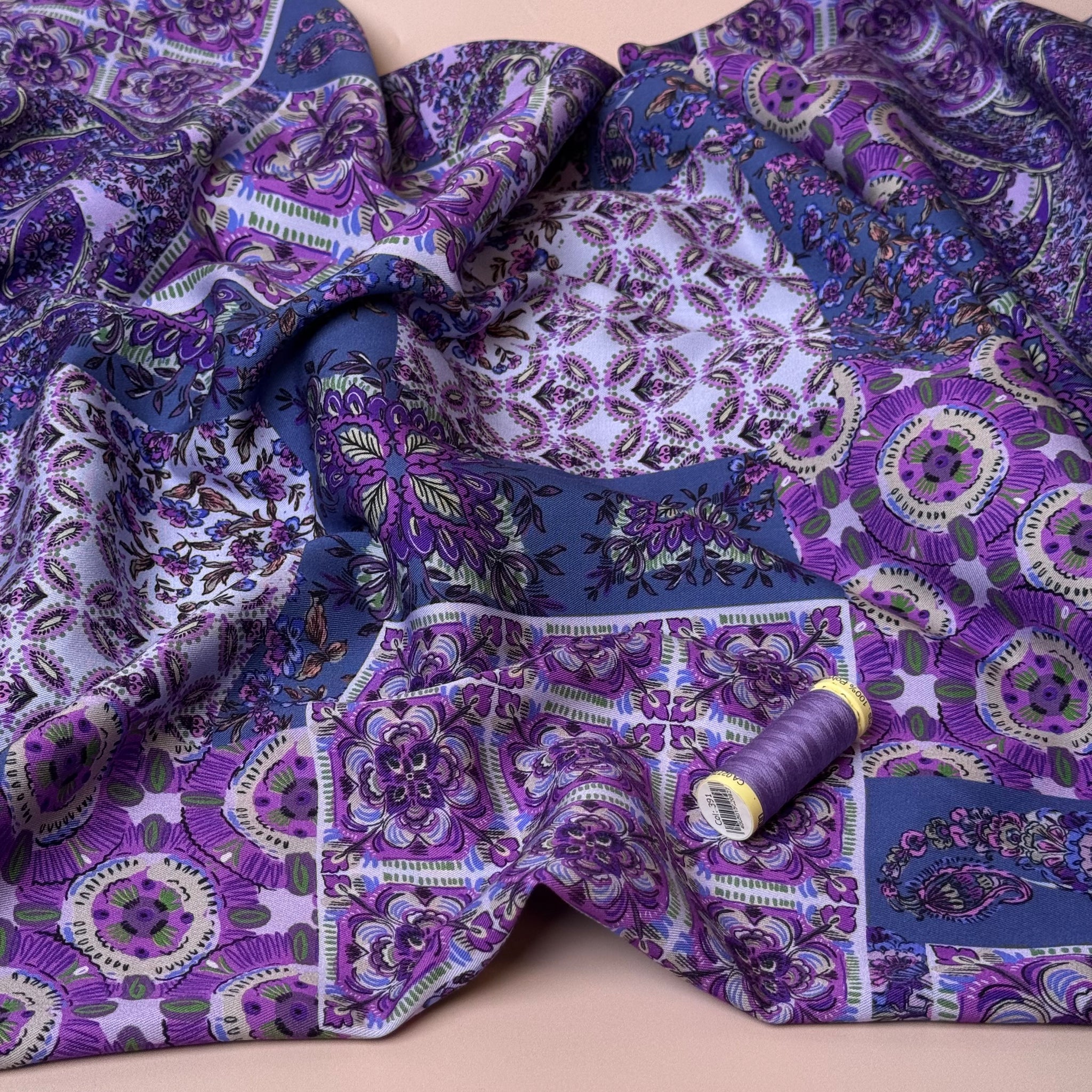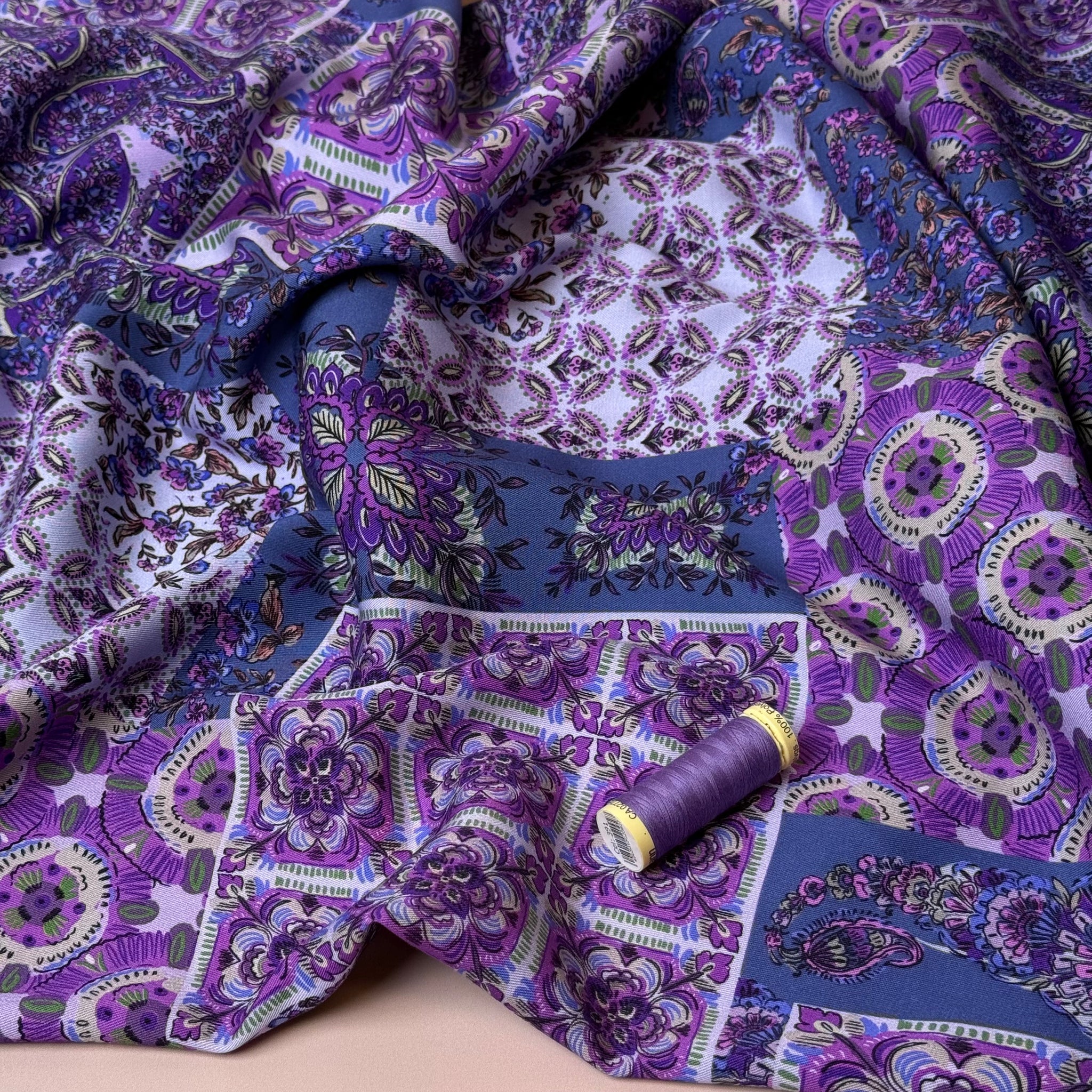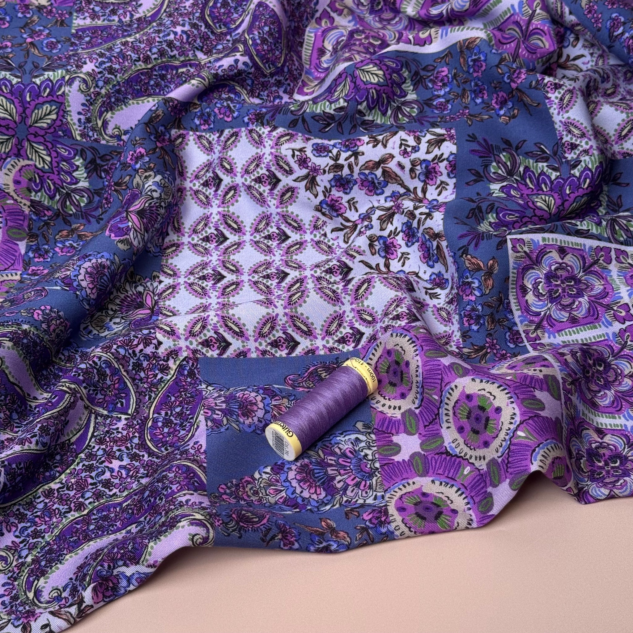 This beautiful viscose twill fabric features beautiful vintage floral patchwork design in the shades of purple and lilac with ivy green accents. It is soft with a fine, smooth twill weave and has a beautiful drape. This fabric is ideal for transitioning between seasons as it is lightweight and also has a little more weight than a lightweight viscose fabric.